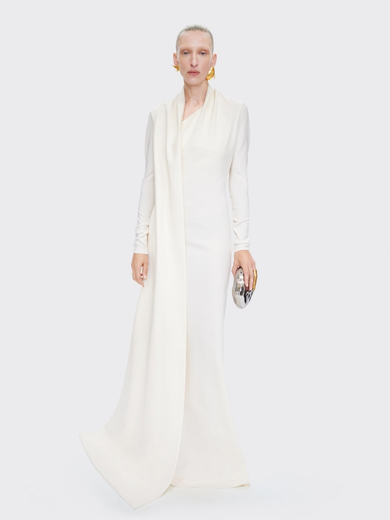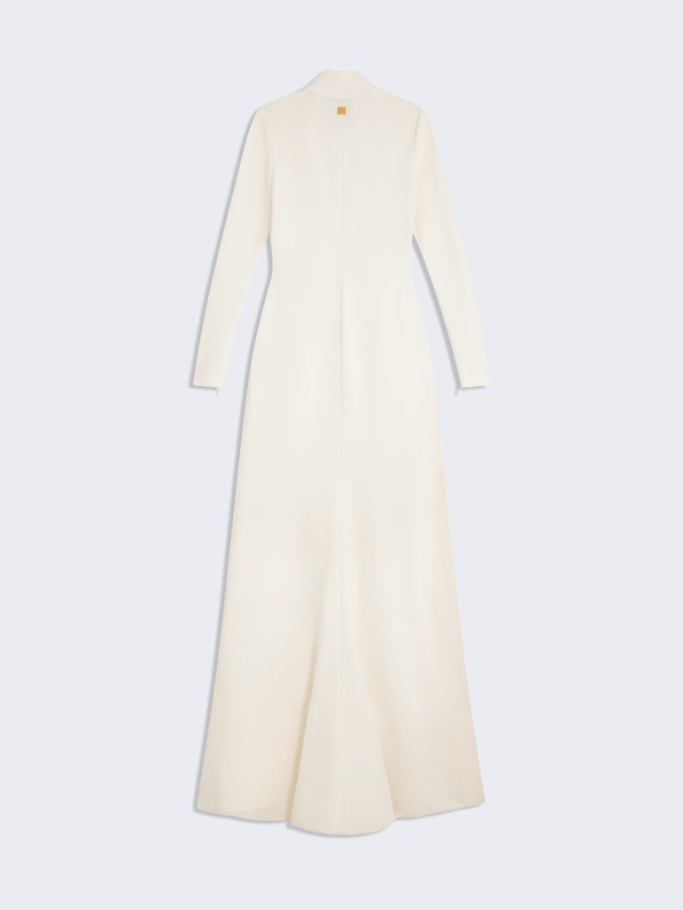 This long, asymmetrical, fitted dress is made of ecru compact jersey.
