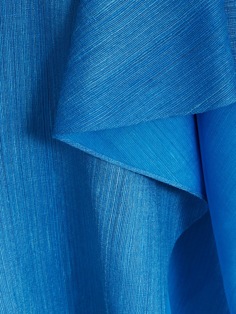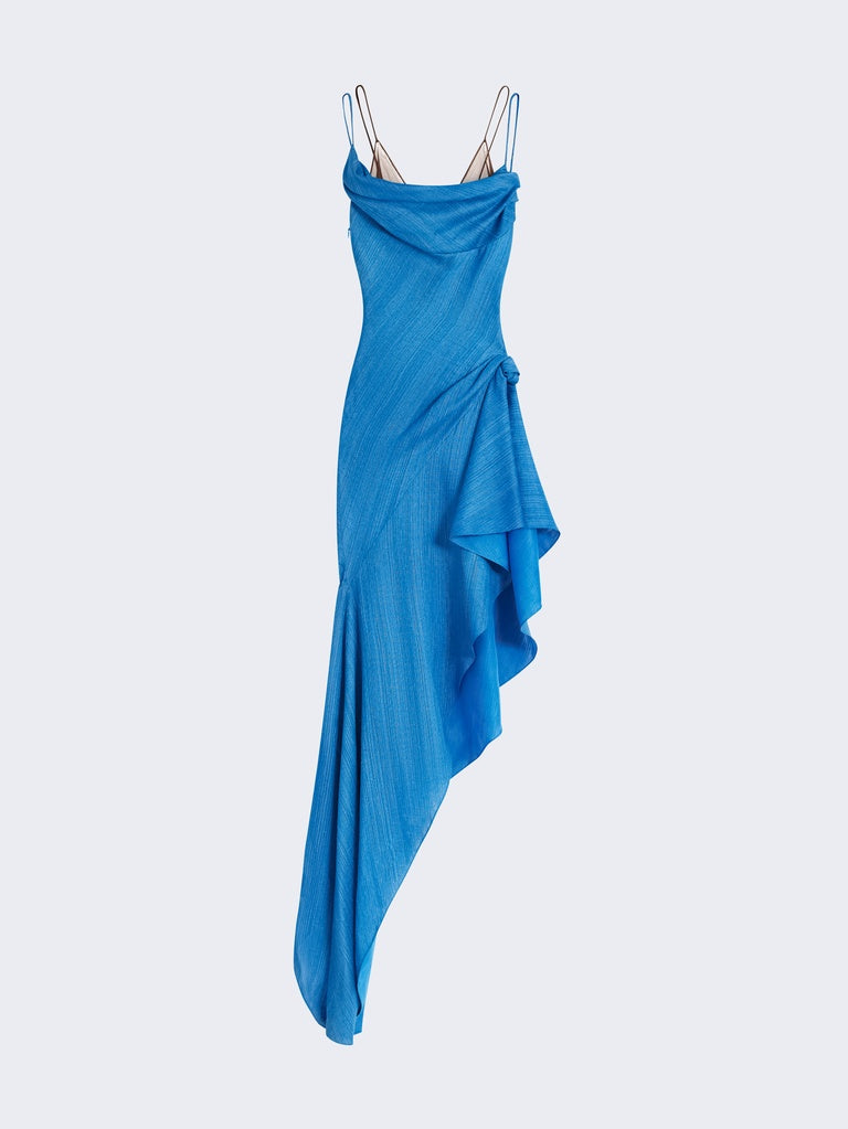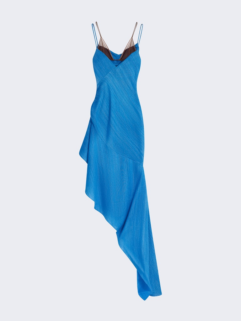 This long dress with a cowl bodice was made of blue silk tussah, a natural fabric with a slightly raw feel. Its asymmetrical cut features a bias-cut hem, short in the front and long at the sides and back, with a long slit starting from the knot on the left hip.