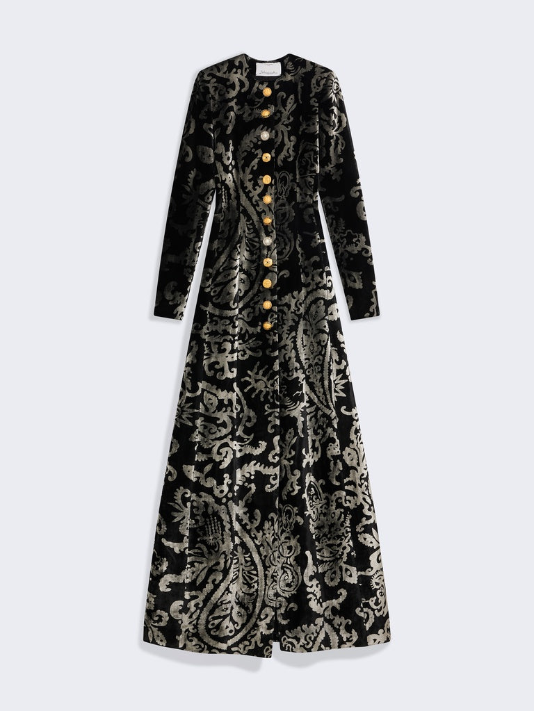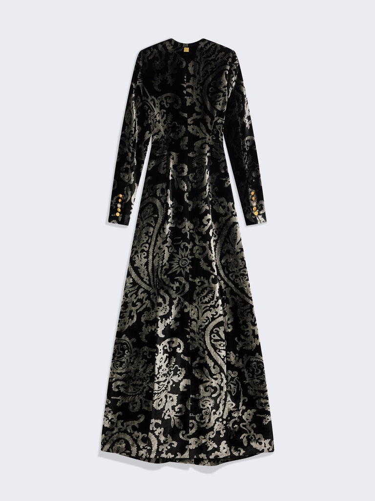 This long-sleeved, fitted dress is crafted from velvet printed with a black and silver paisley motif, reflecting the House's iconic codes. It is embellished with gold jeweled buttons at the center front.