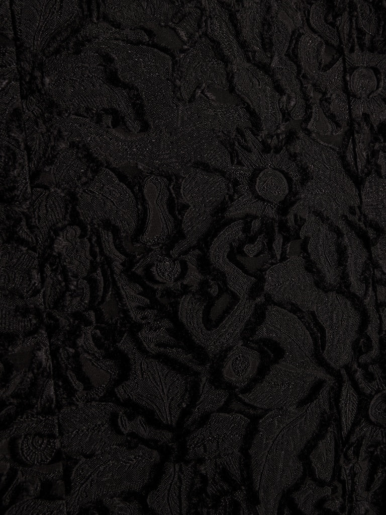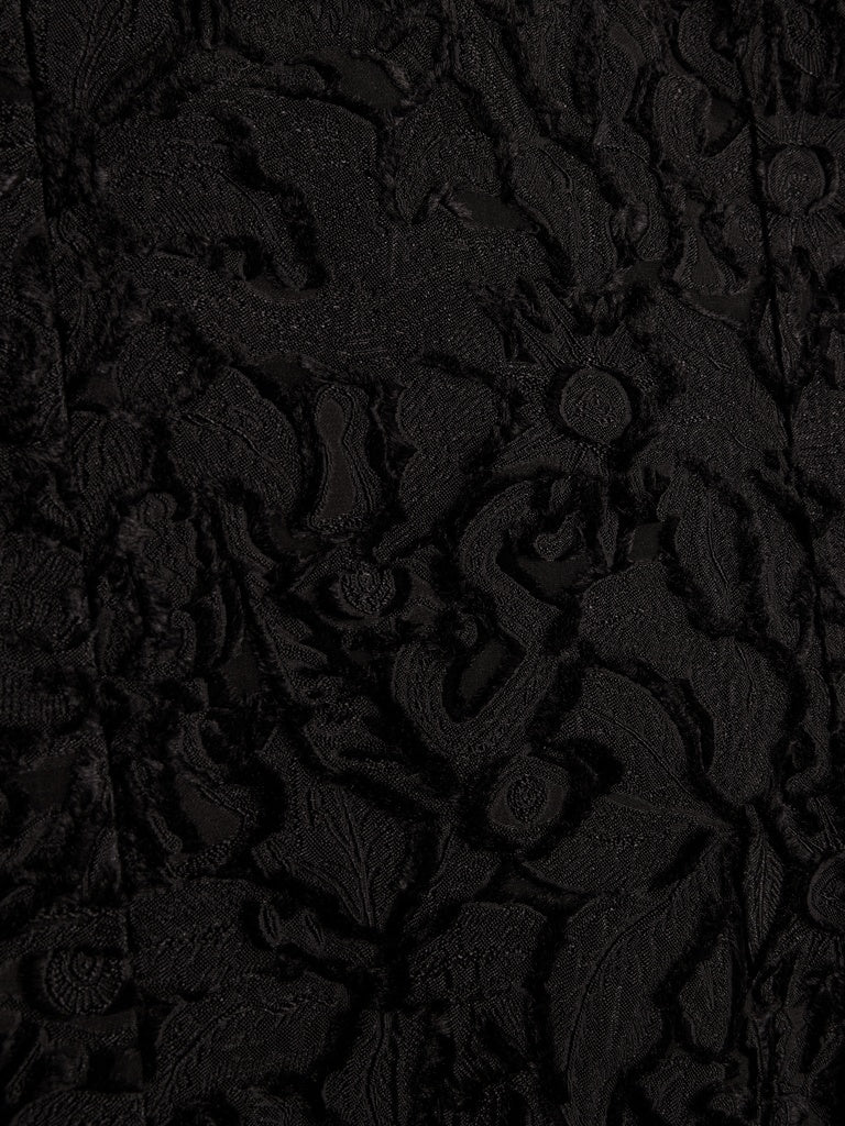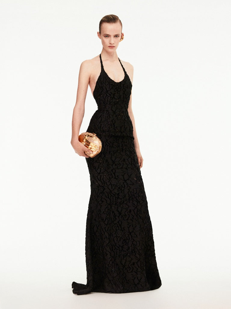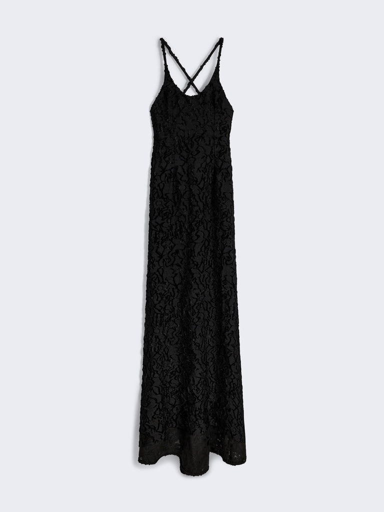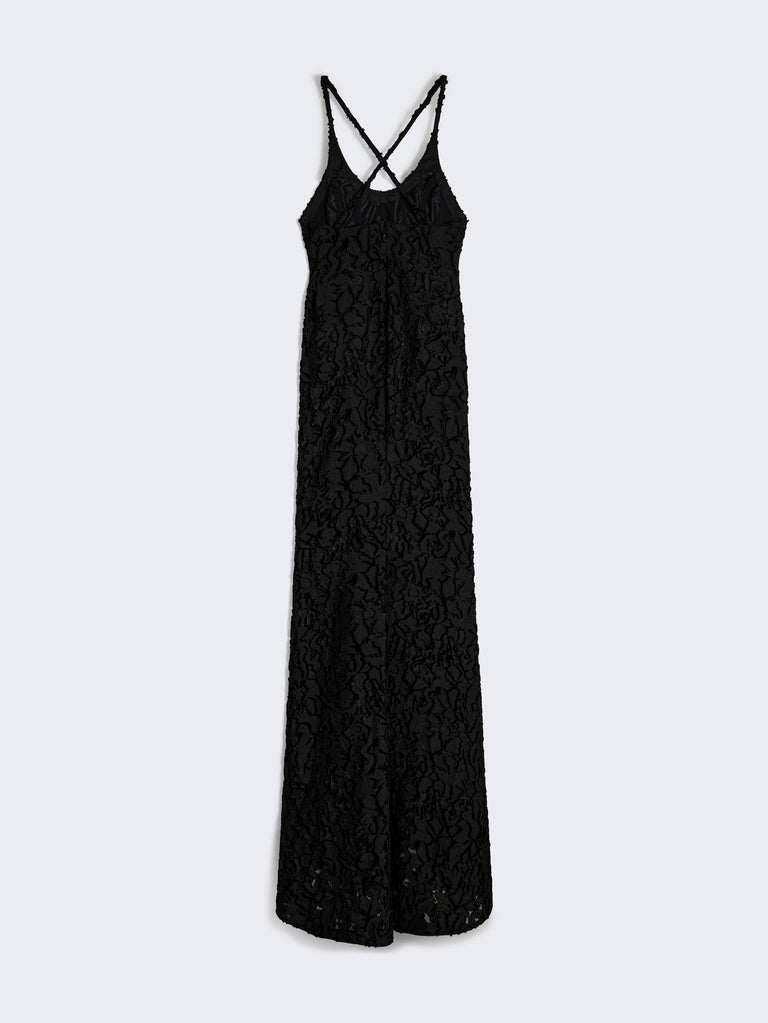 This long, fitted dress is made from black cut yarn printed with a jacquard pattern featuring the House's iconic codes. It has thin straps that cross at the back, revealing the shoulders.