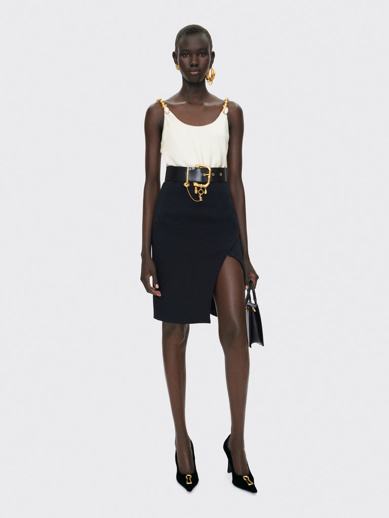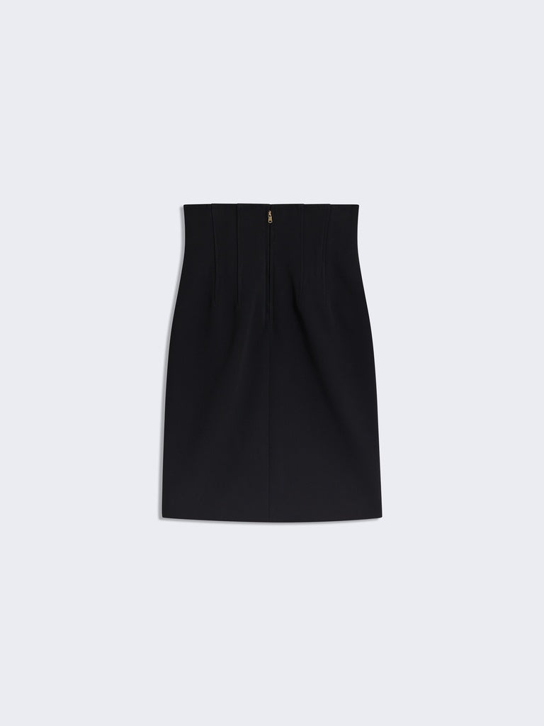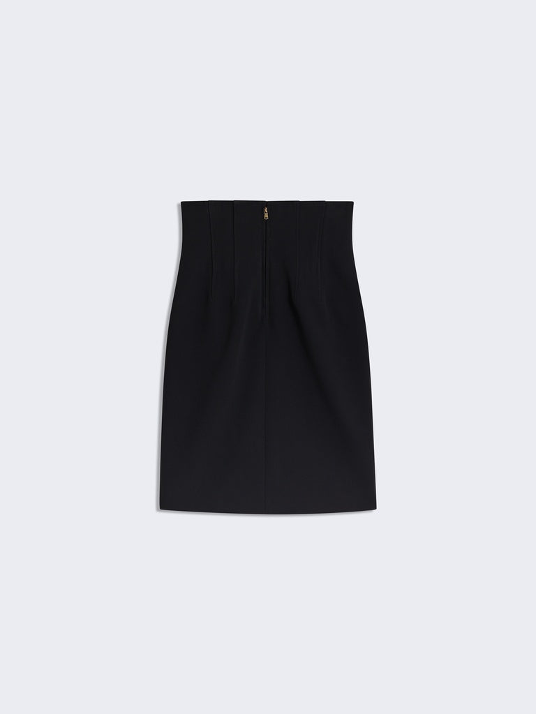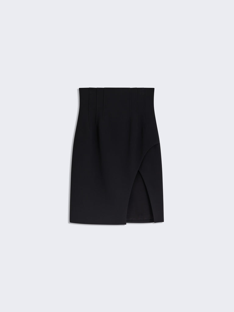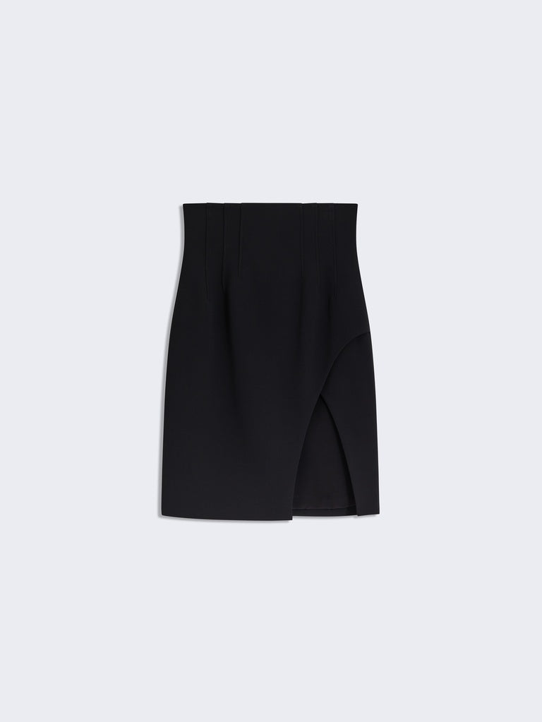 This short skirt, slit on the left side in black cadi, is enhanced with a tone-on-tone high-waisted corset-effect belt.