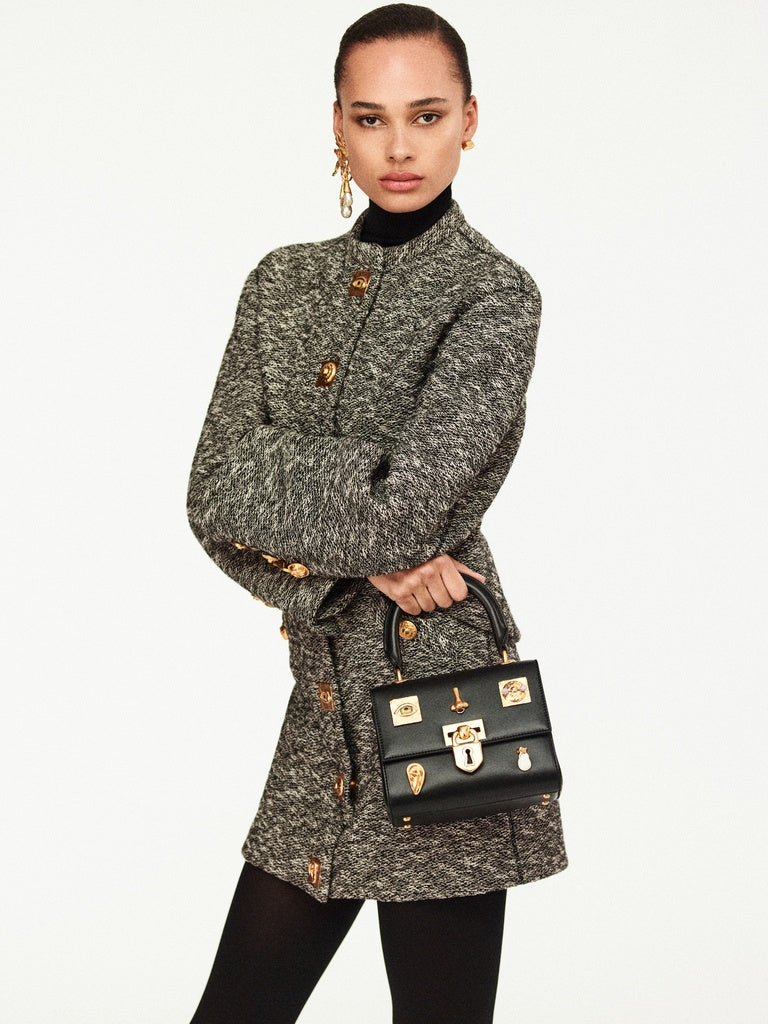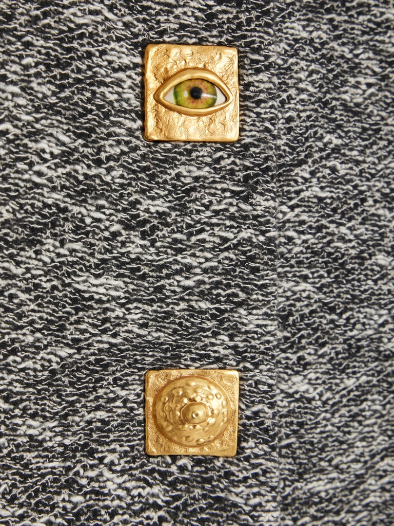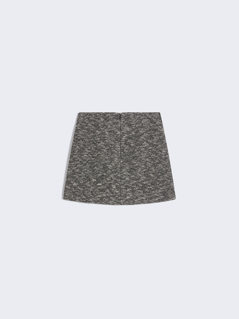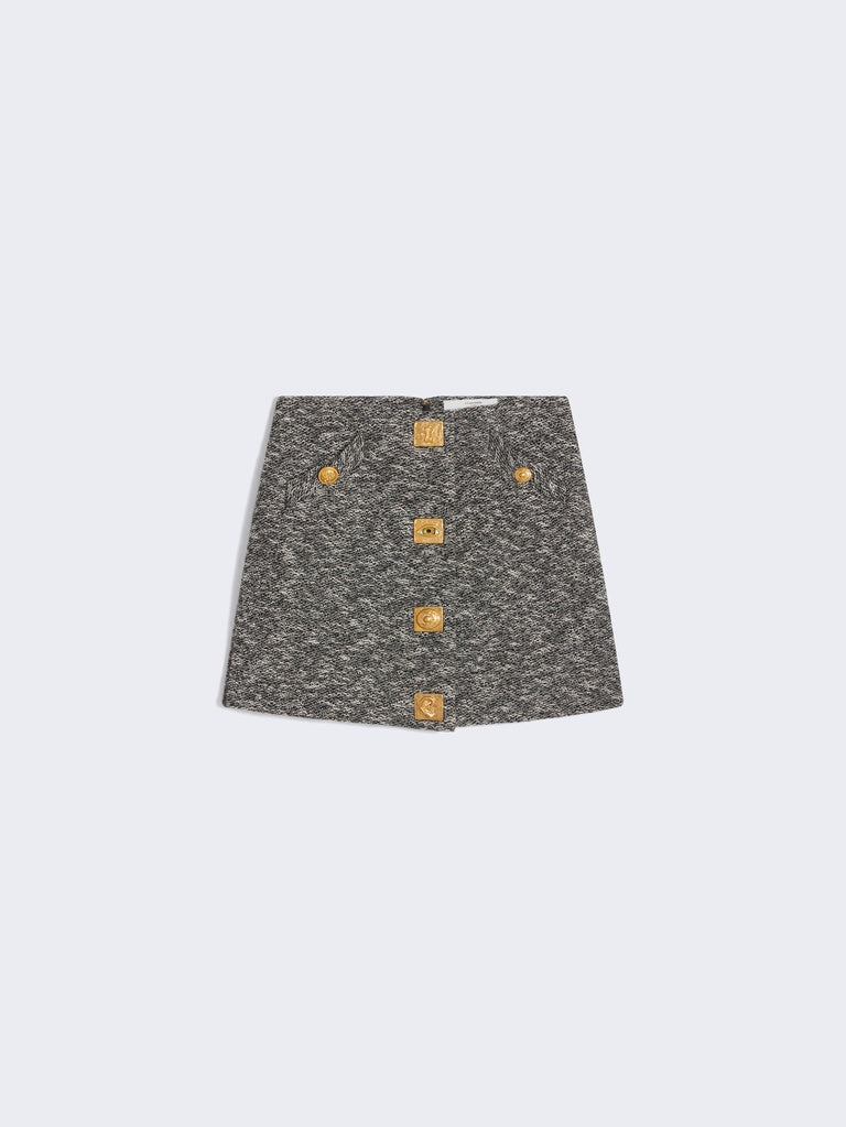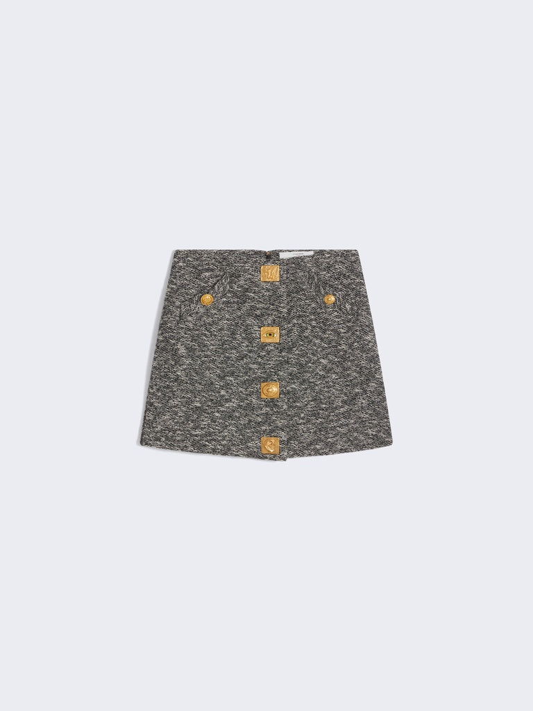 This heather grey jersey trapeze miniskirt is enhanced with a faux button placket adorned with square gold metal anatomical snap buttons in the center front, buttoned pockets and a zip on the left side.
