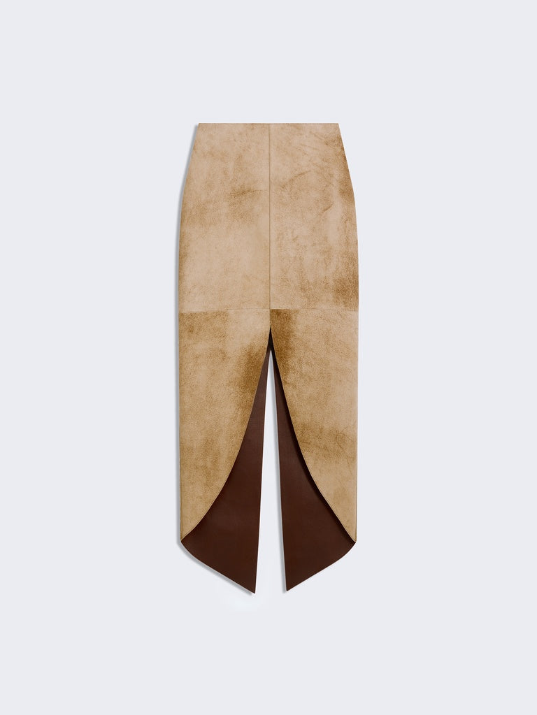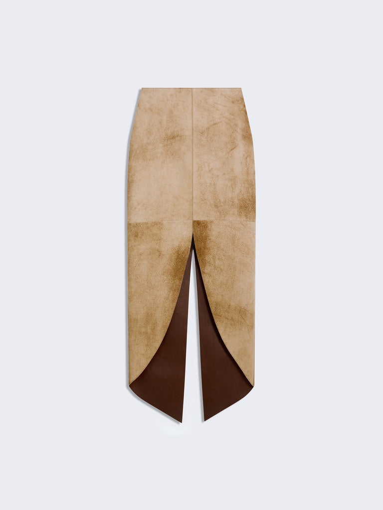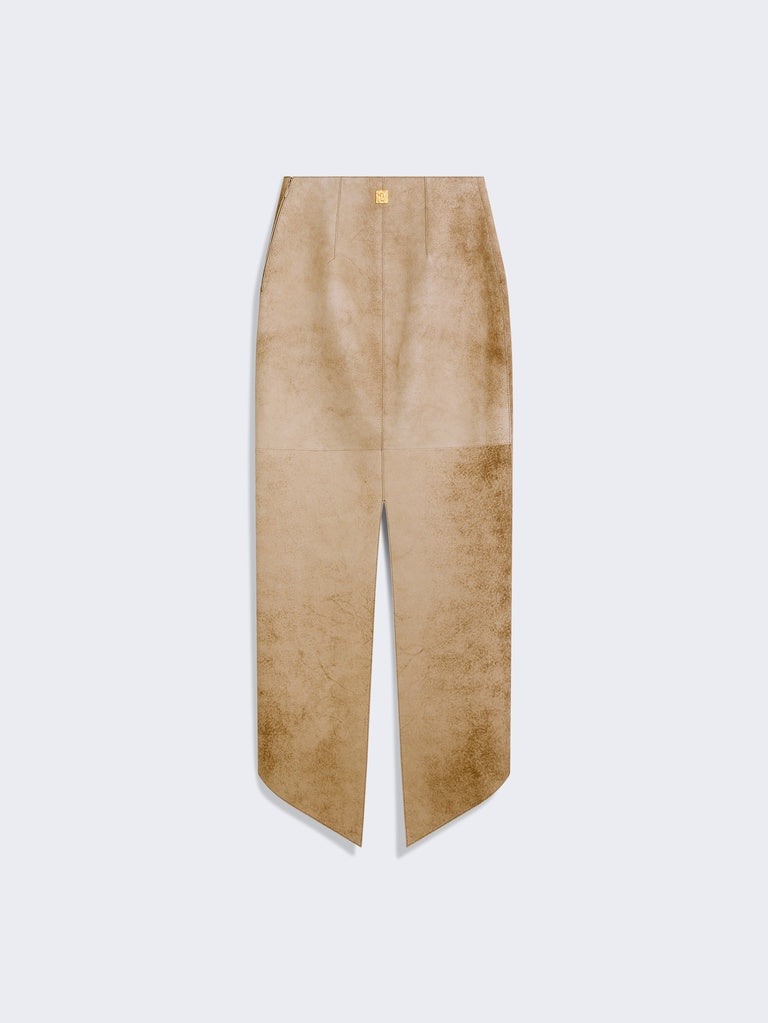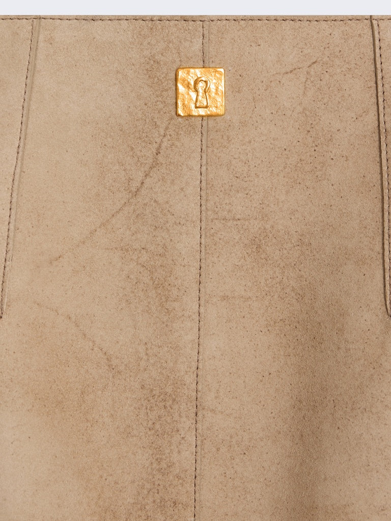 This taupe lambskin suede pencil skirt is enhanced with a rounded, openwork hem. It is embellished with a center back slit, a gold keyhole rivet, and an invisible zip on the left side.