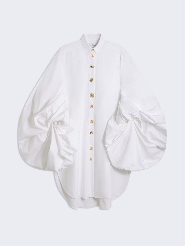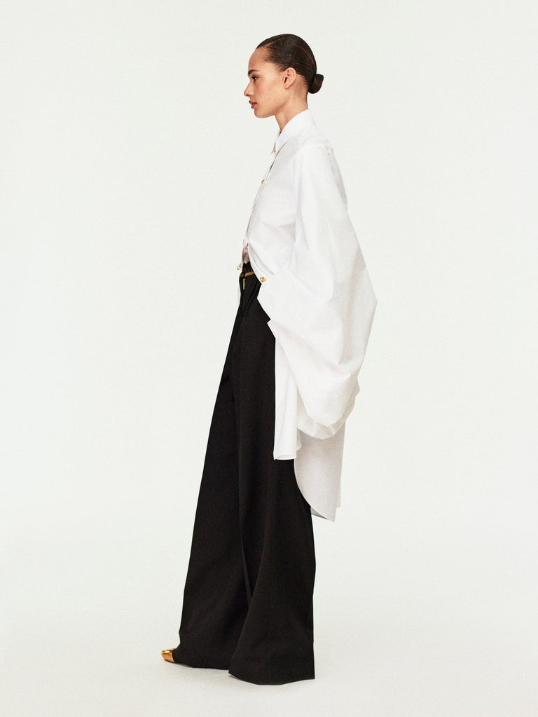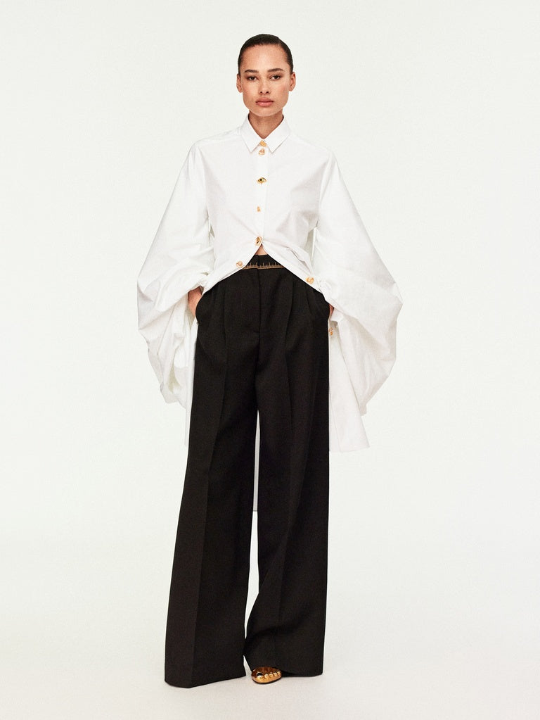 Its straight silhouette, slit on each side, is enhanced by generous puffy pleats that edge the shoulders.
