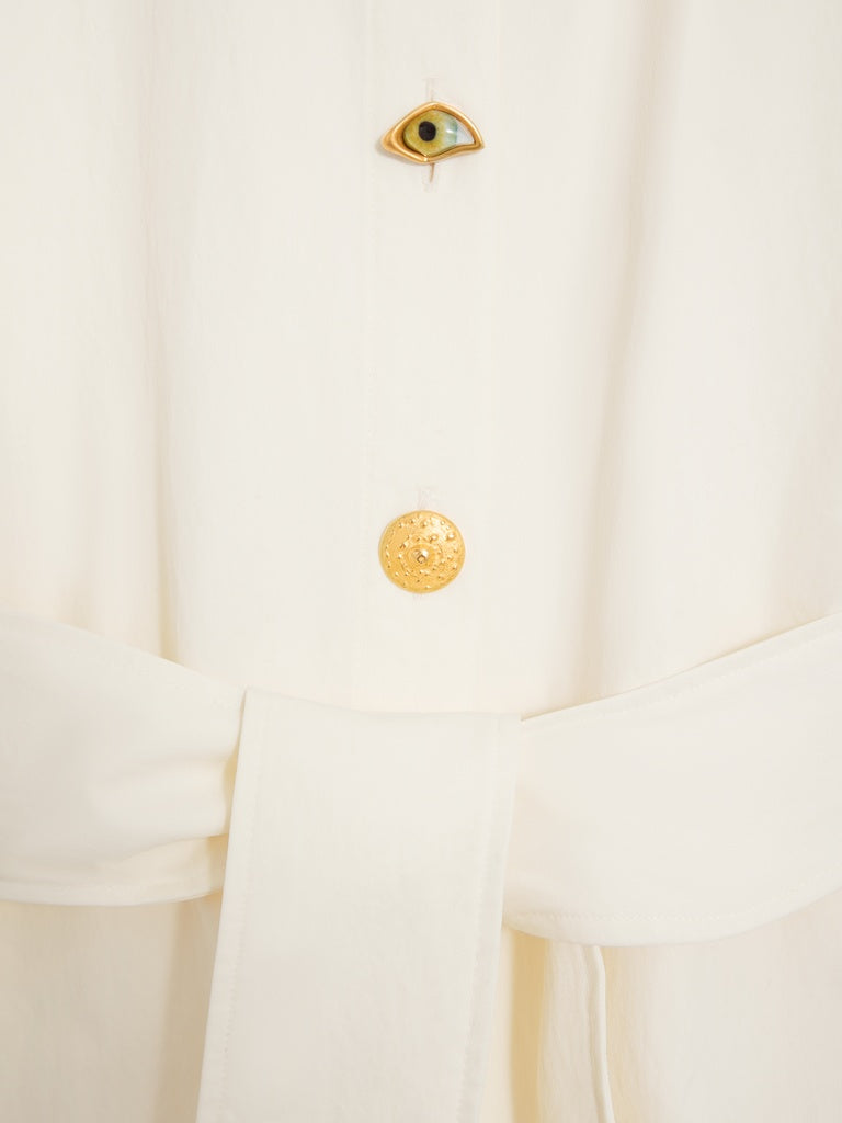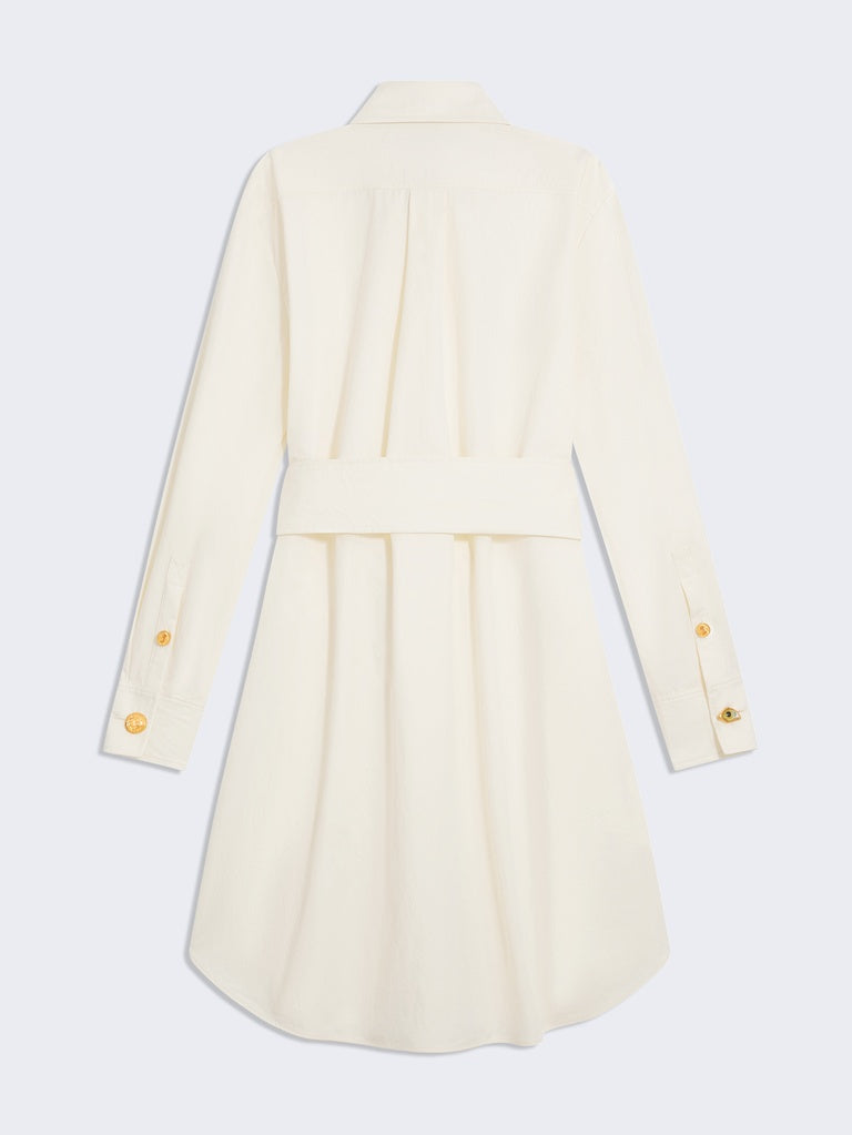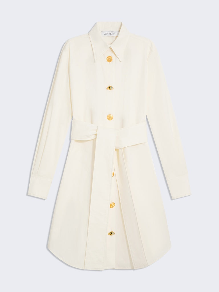 This short-cut shirt dress in ecru cotton poplin is enhanced with a wide tone-on-tone belt and a button placket adorned with gold jewel buttons in the center front.
