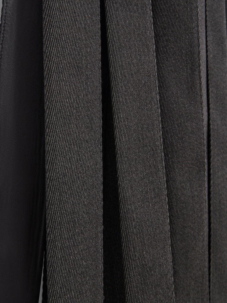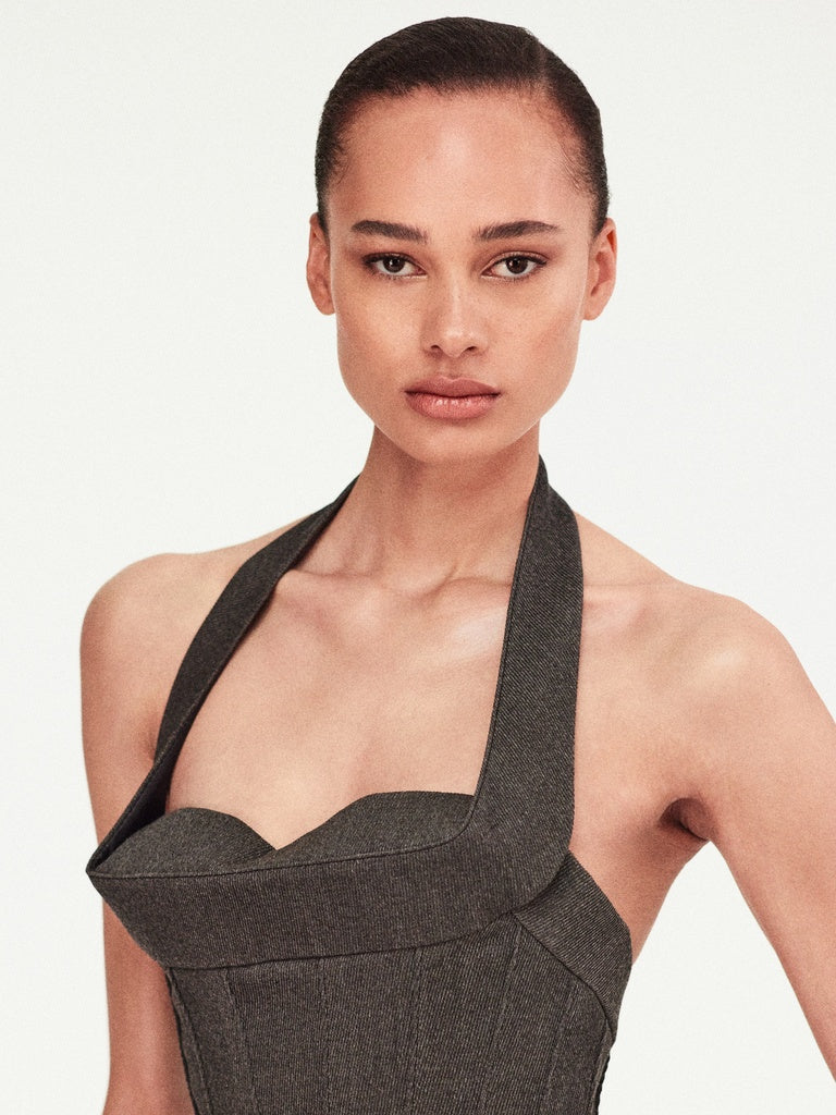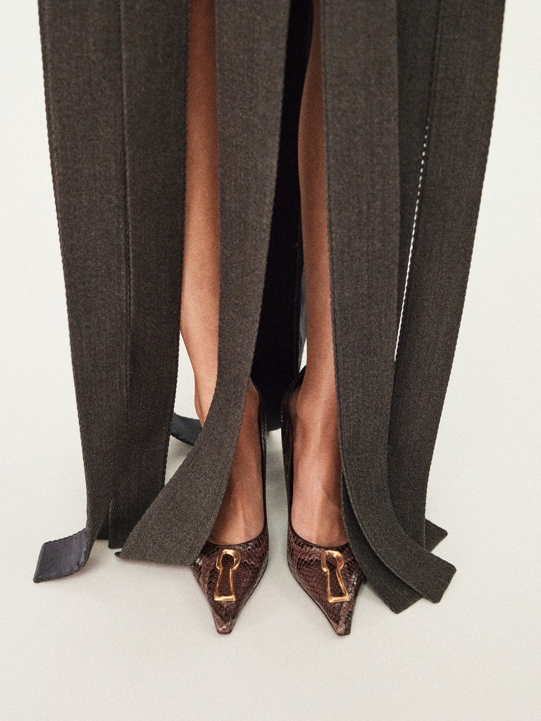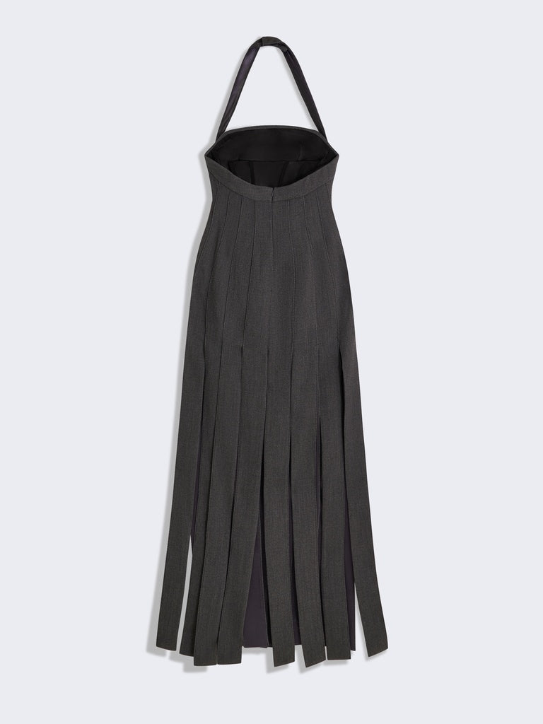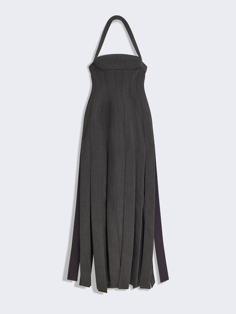 This long, sleeveless dress with a nude cut is made of grey wool twill with a play of ribbons sewn and then released from the hips which creates movement in the dress.
