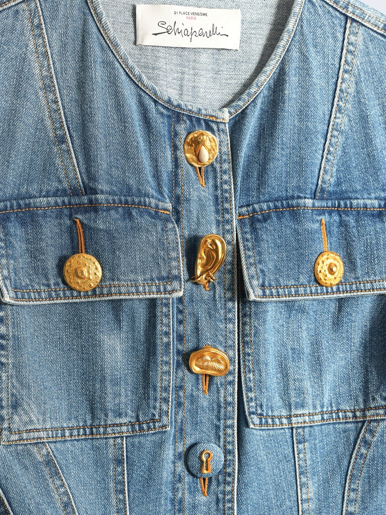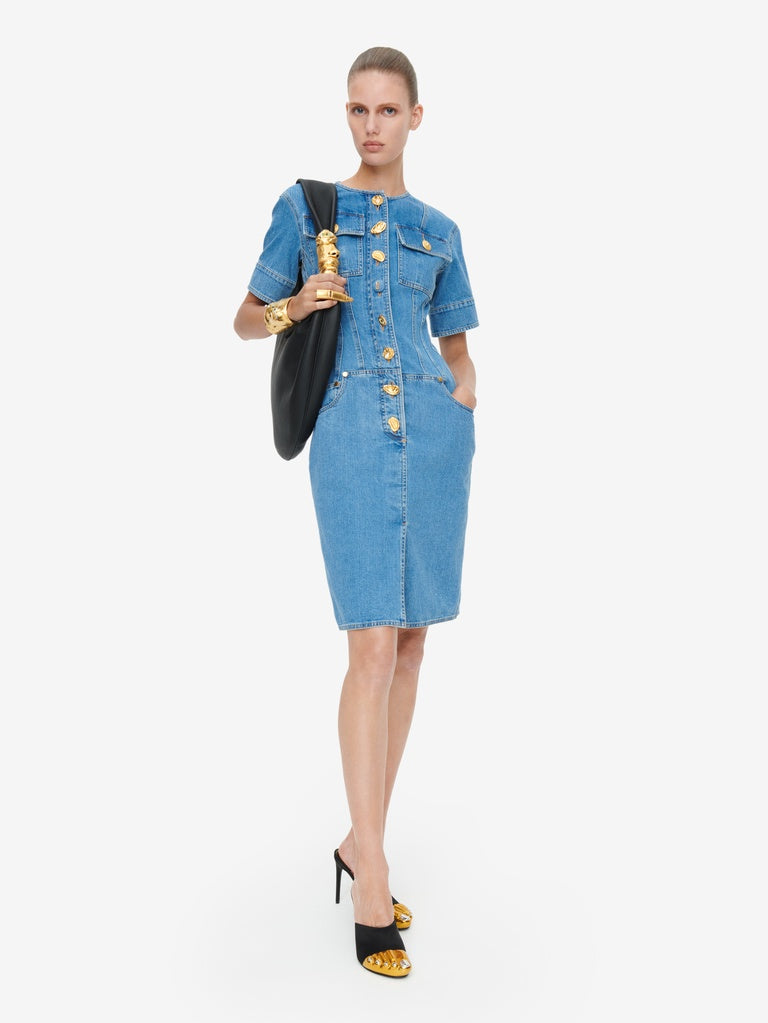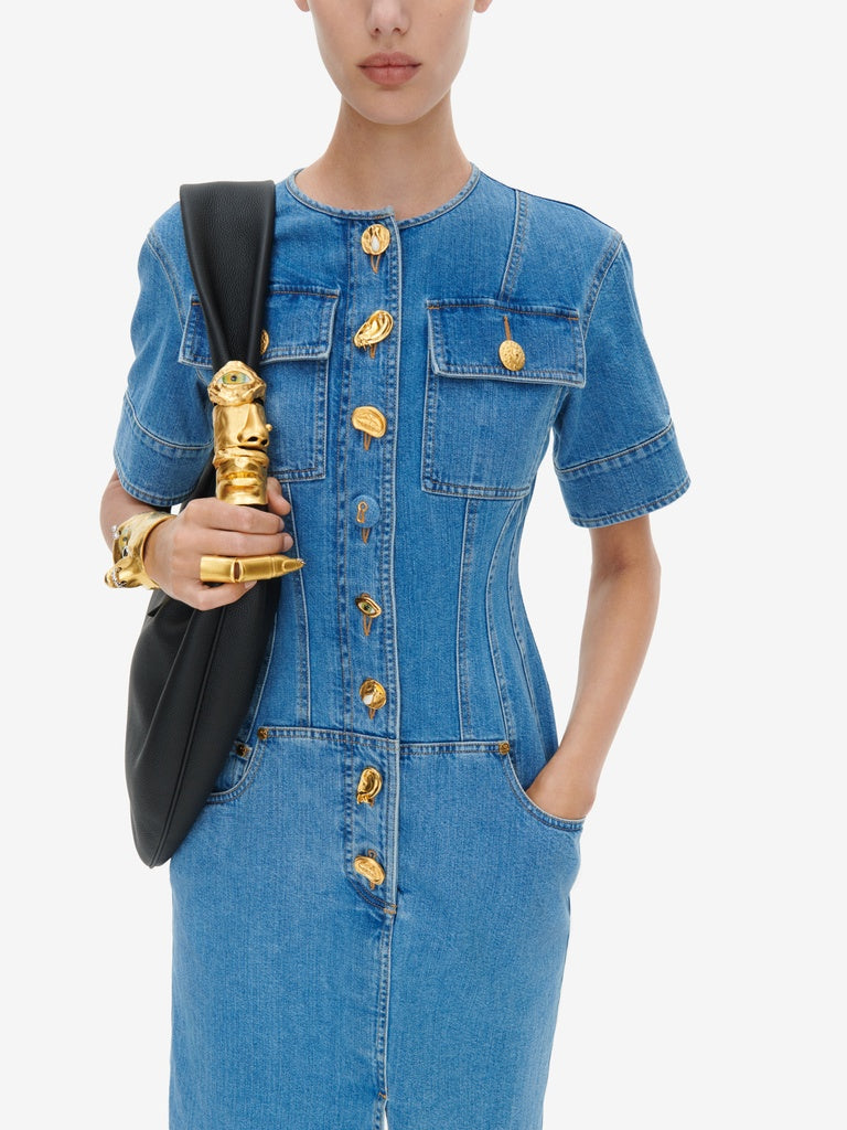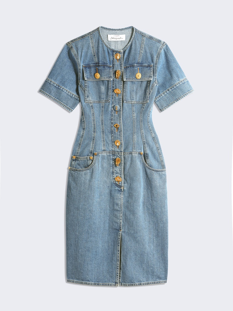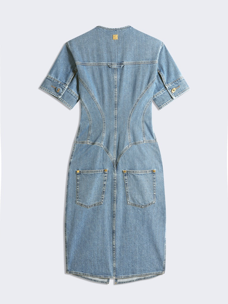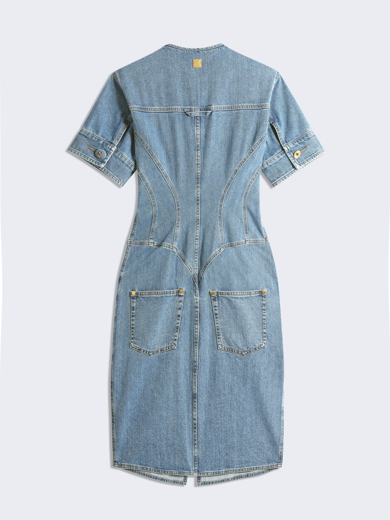 Midi dress in washed blue denim, corset-inspired design enhanced with bijoux buttons and breast pockets.