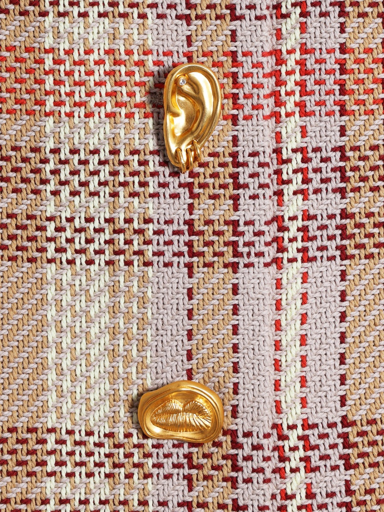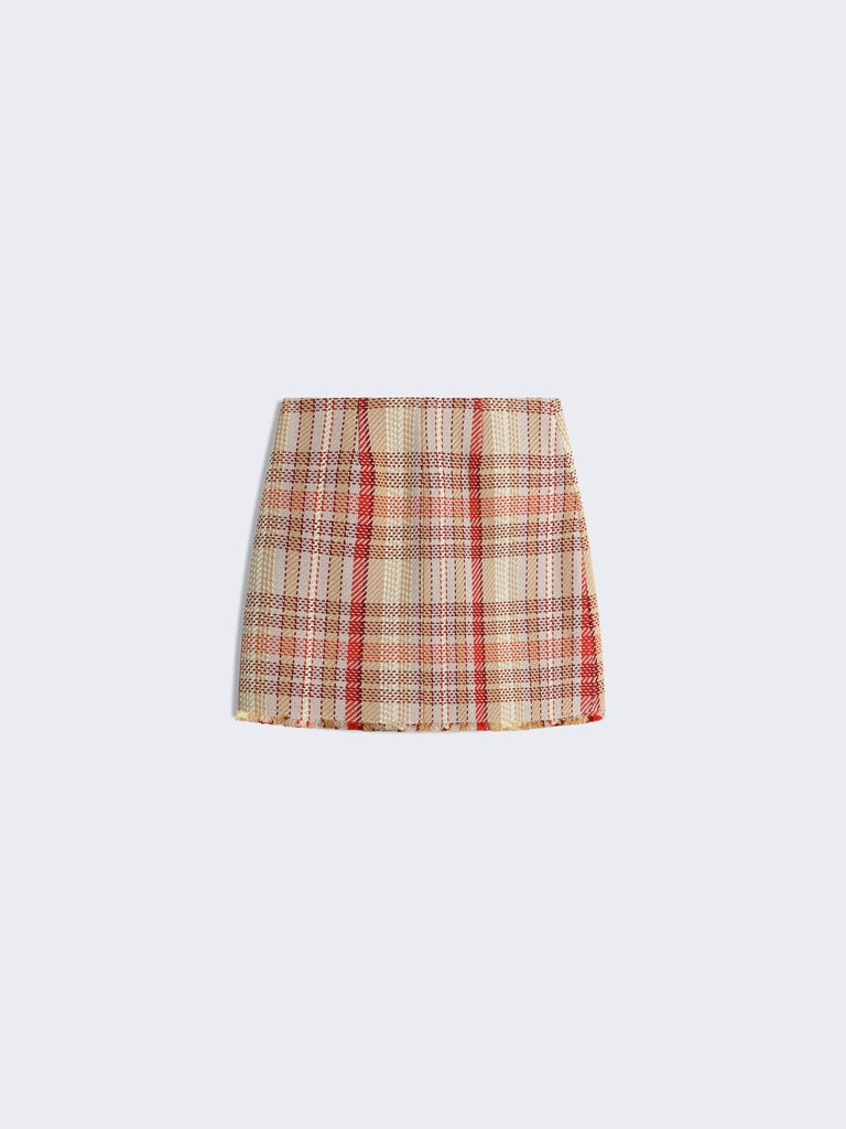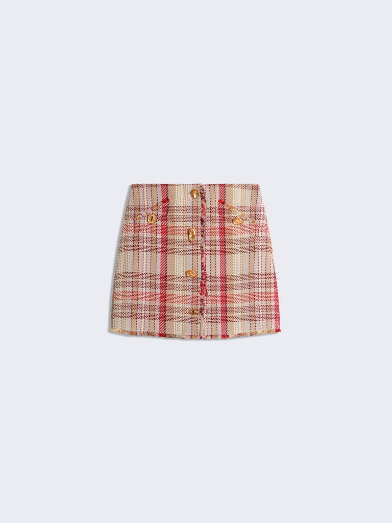 Multicoloured checked tweed A-line mini skirt embellished with gold bijoux buttons.