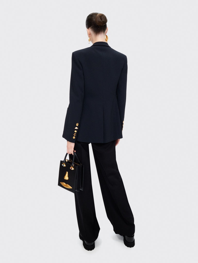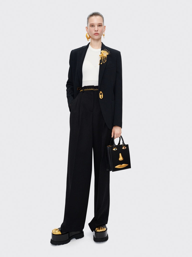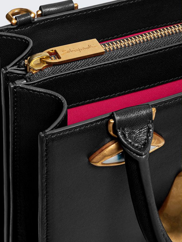 This Bijoux handbag in black calfskin leather and lambskin leather interior is decorated with signature anatomical jewelry in enamel and hammered gold brass forming a trompe-l'œil face.