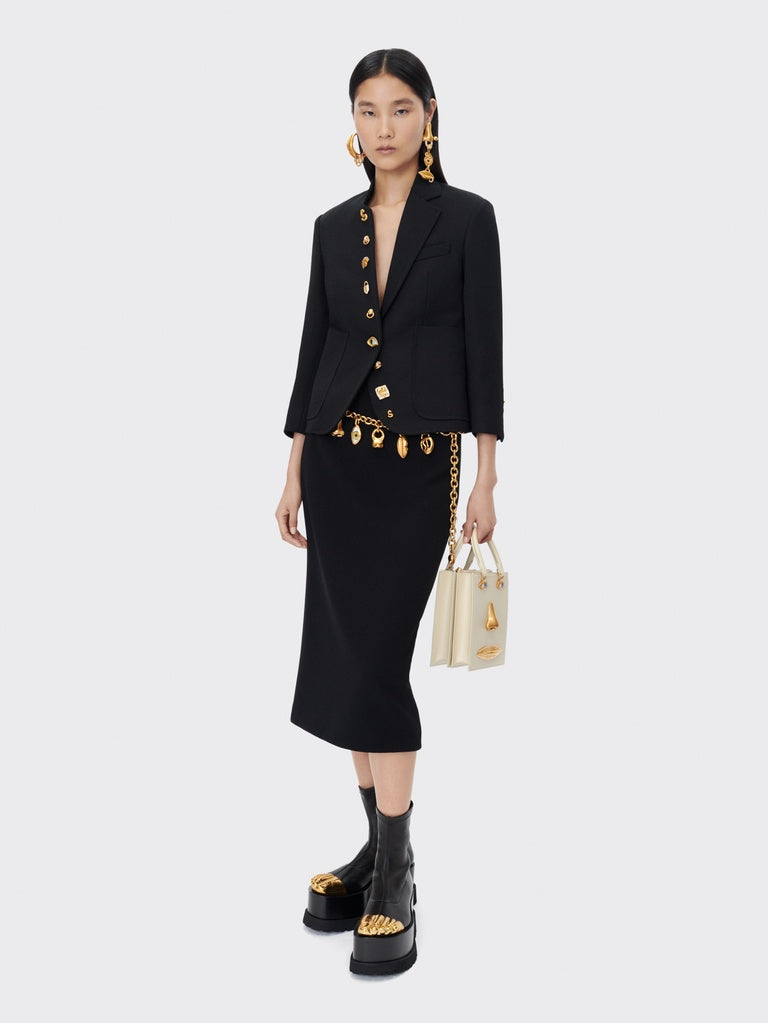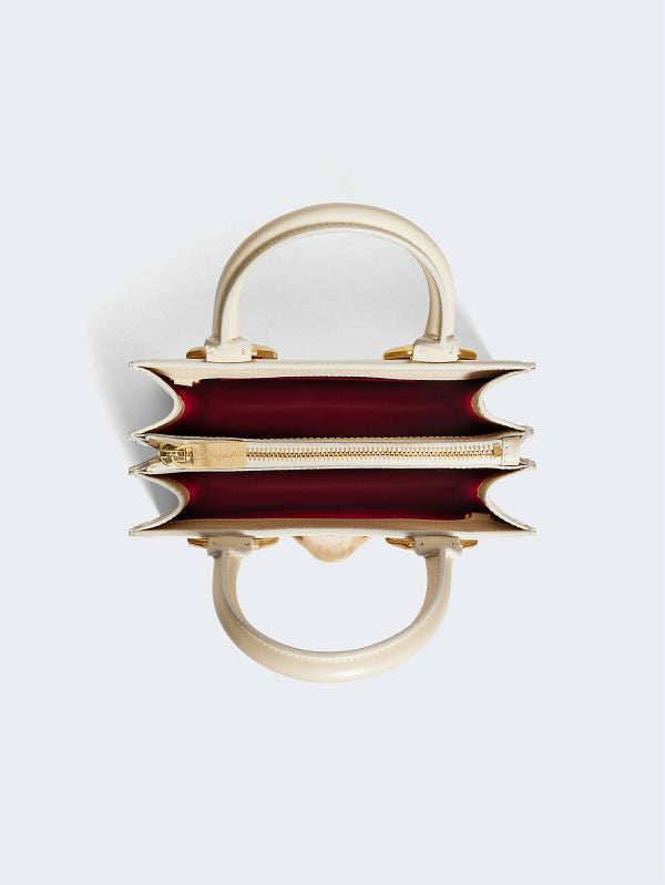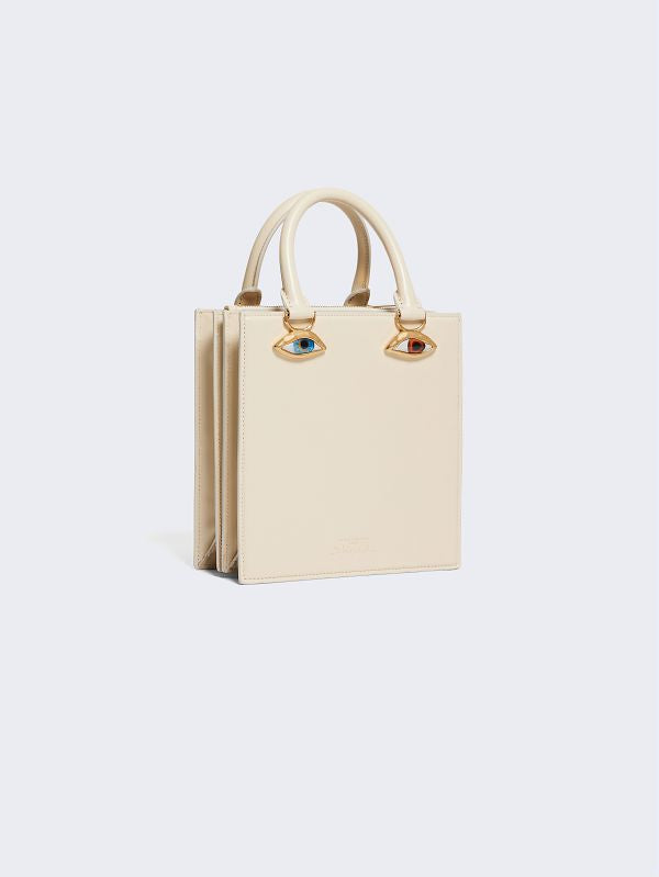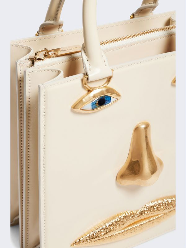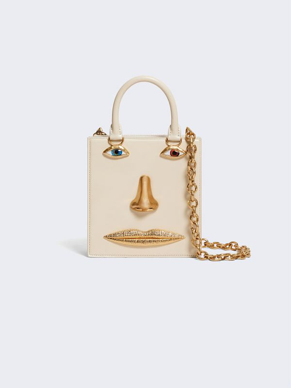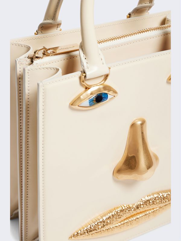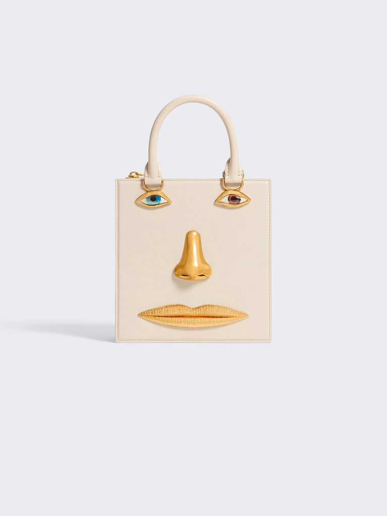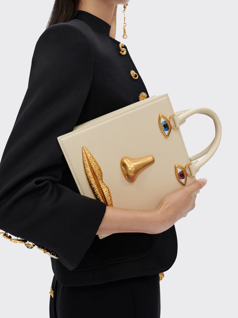 This Face handbag in ecru calfskin and lambskin interior is decorated with signature anatomical jewelry in enamel and hammered gilt brass forming a trompe-l'œil face.
