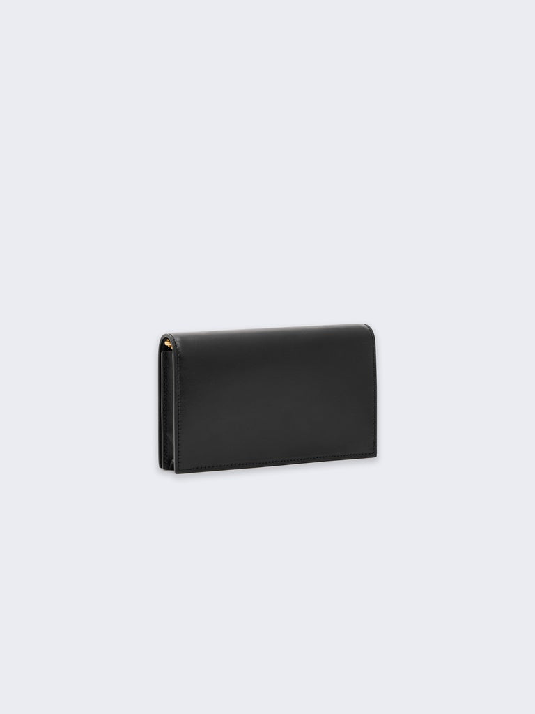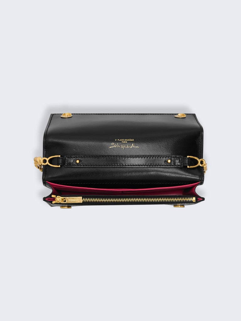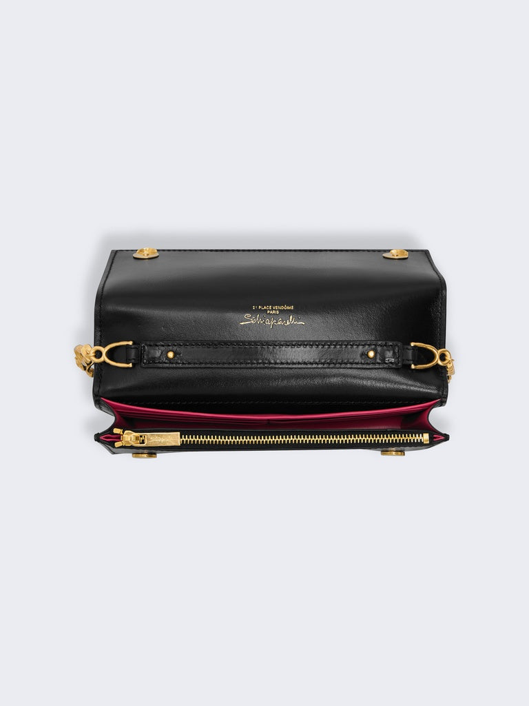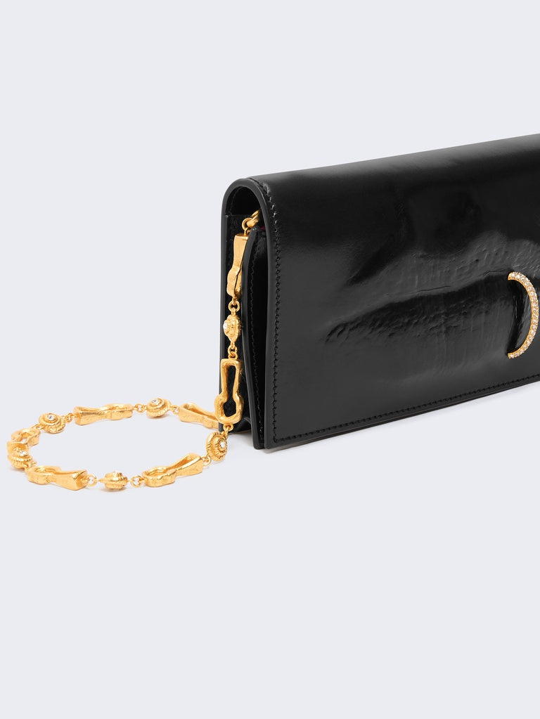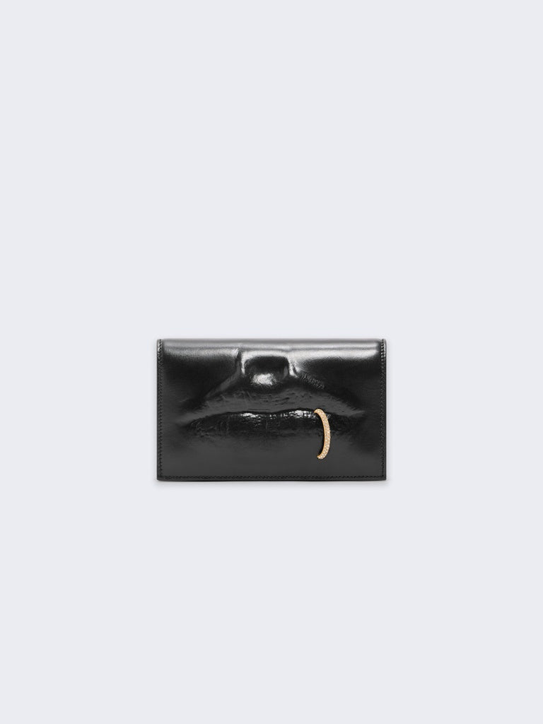 This black leather clutch with lambskin interior is inlaid with a molded signature mouth adorned with a rhinestone piercing and enhanced with a signature keyhole-shaped chain in gold-tone metal.