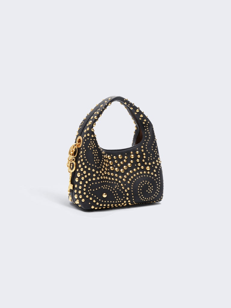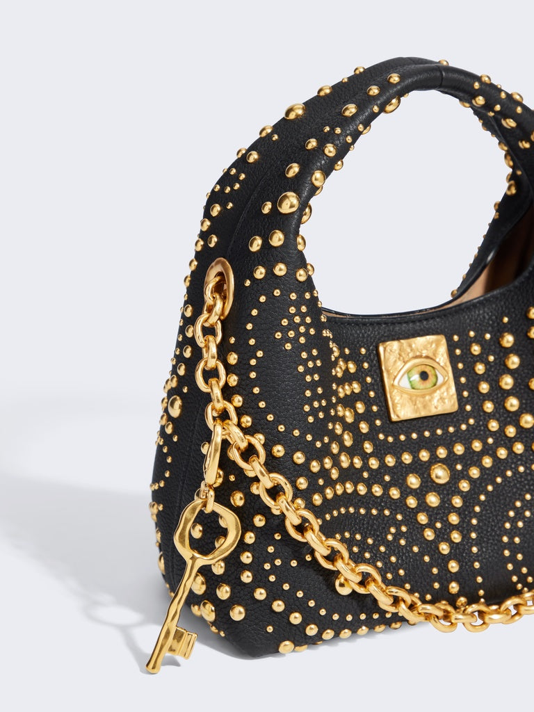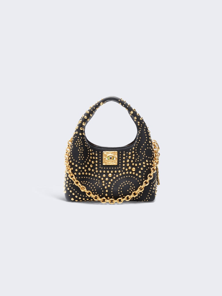 This mini Soufflé bag is crafted from black grained calfskin leather enhanced with gold studs forming a motif that echoes the House's iconic codes. It is adorned with a detachable chain of gold-plated brass links and the signature Eye detail in gold-plated brass on the front.