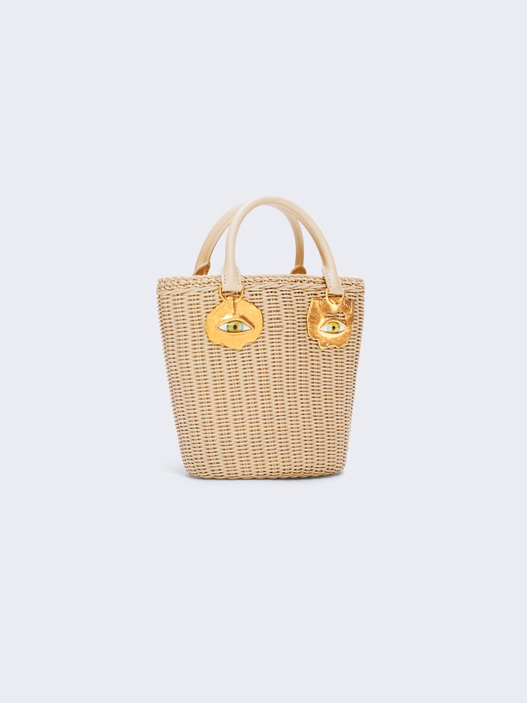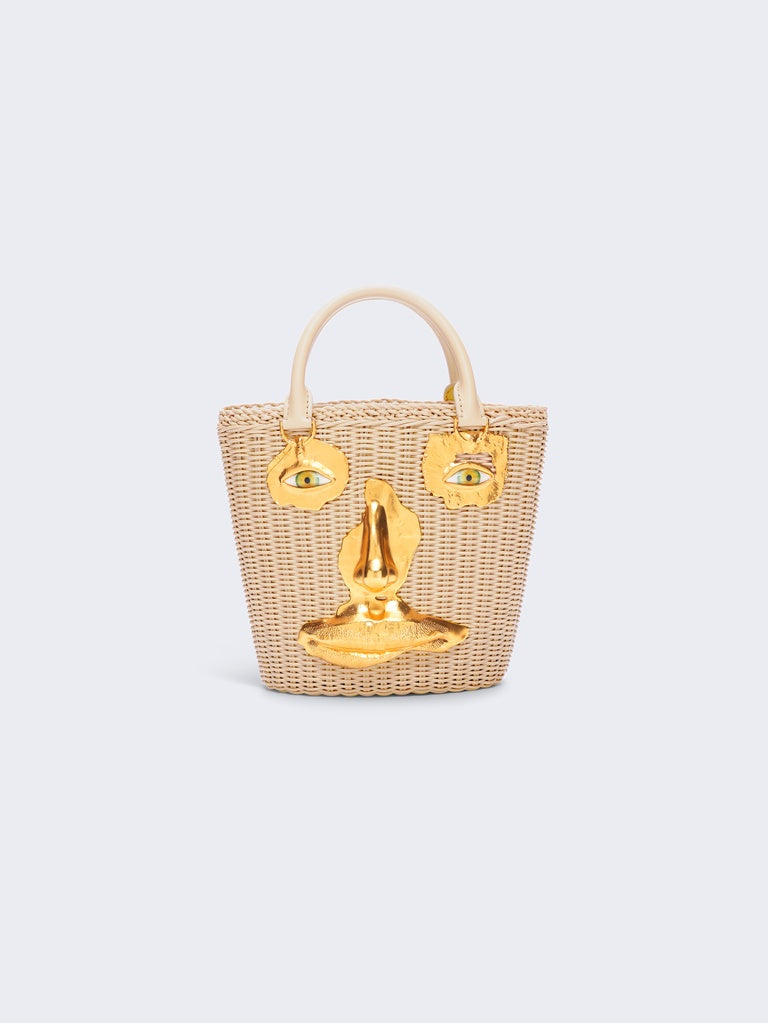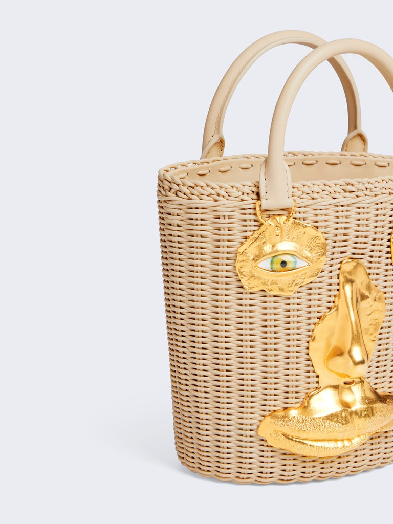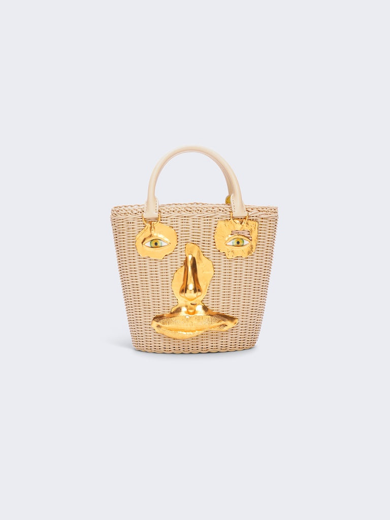 This Face bag is made from beige calfskin with a wicker effect created using leather cords. It is decorated with anatomical bijoux in gold-plated brass and enamel forming a melting face.