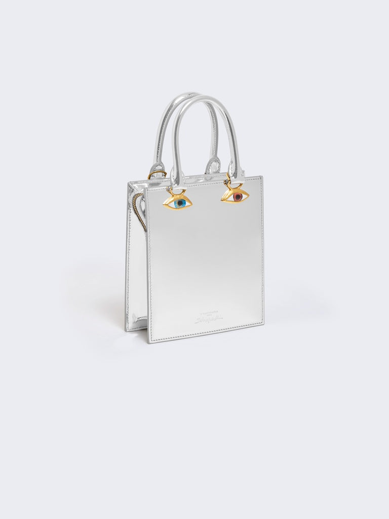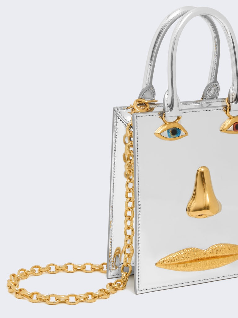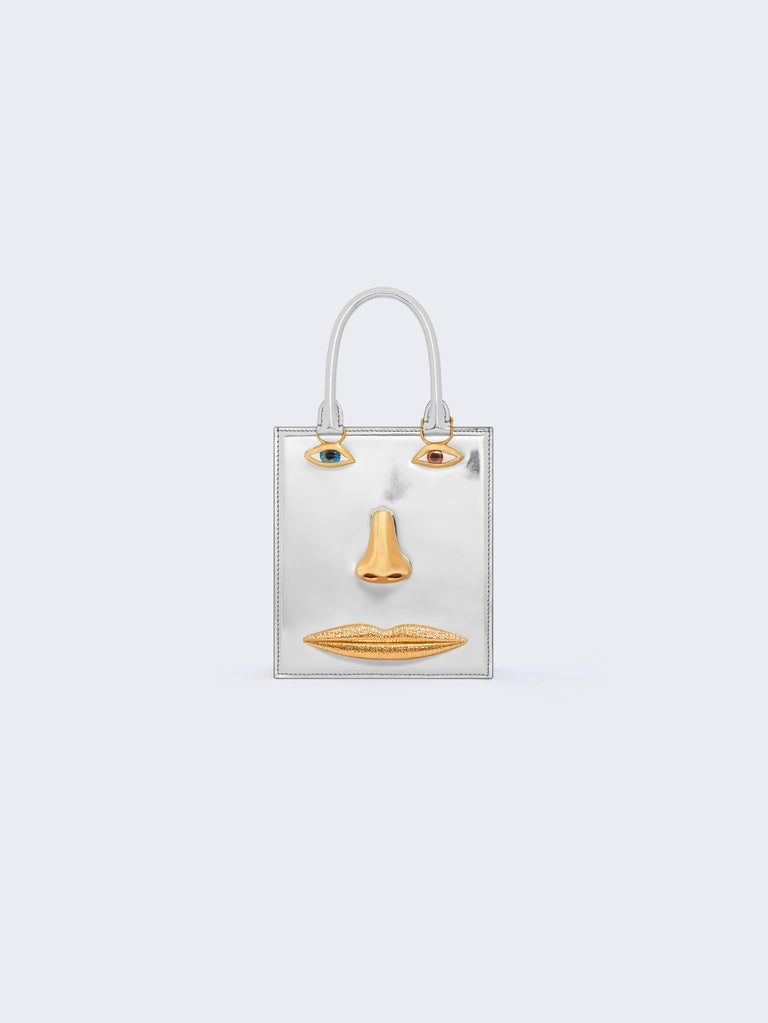 This Face handbag in a mini size, crafted from silver laminated calfskin with a pink lambskin lining, is adorned with signature anatomical jewels in enamel and hammered gold-tone brass, forming a trompe-l'œil face. It features the House's iconic Shocking! pink lining, two leather handles, and a jeweled gold-tone metal shoulder strap.