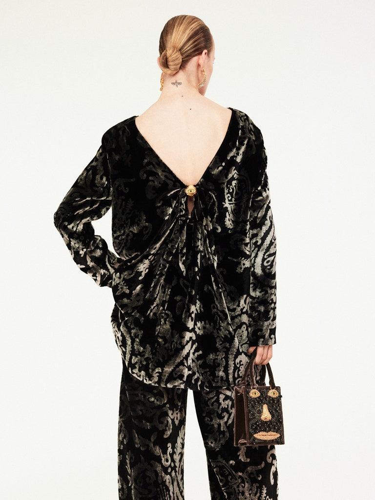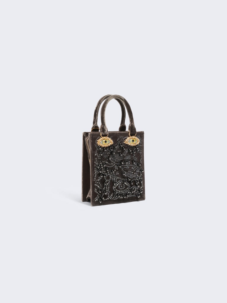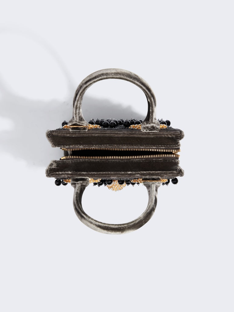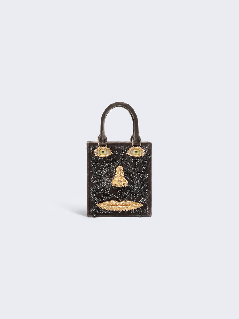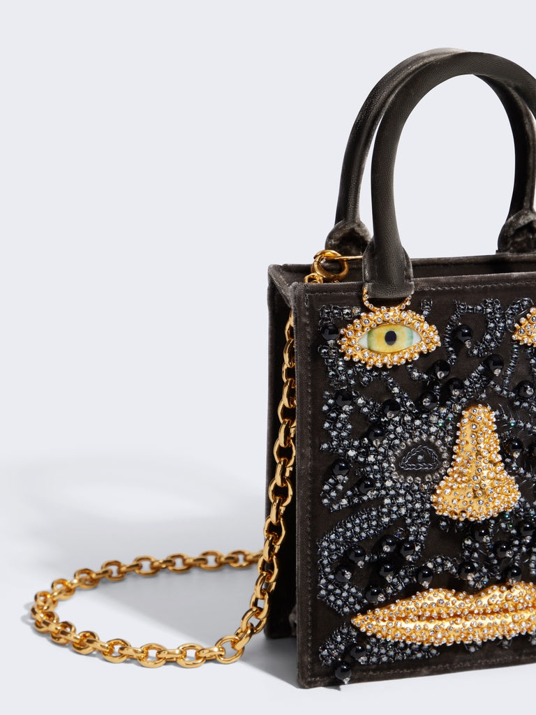 This Face au formas mini bag is crafted from black velvet adorned with embroidery featuring the House's iconic codes. It is decorated with signature anatomical jewels forming a trompe-l'œil face.