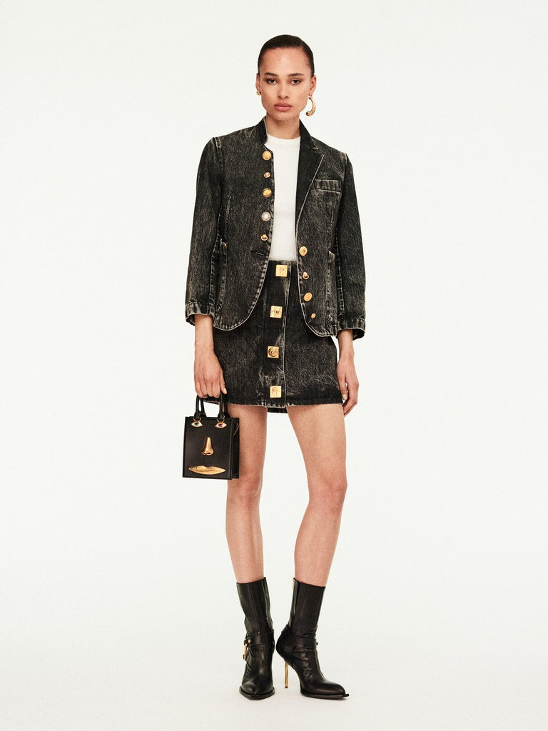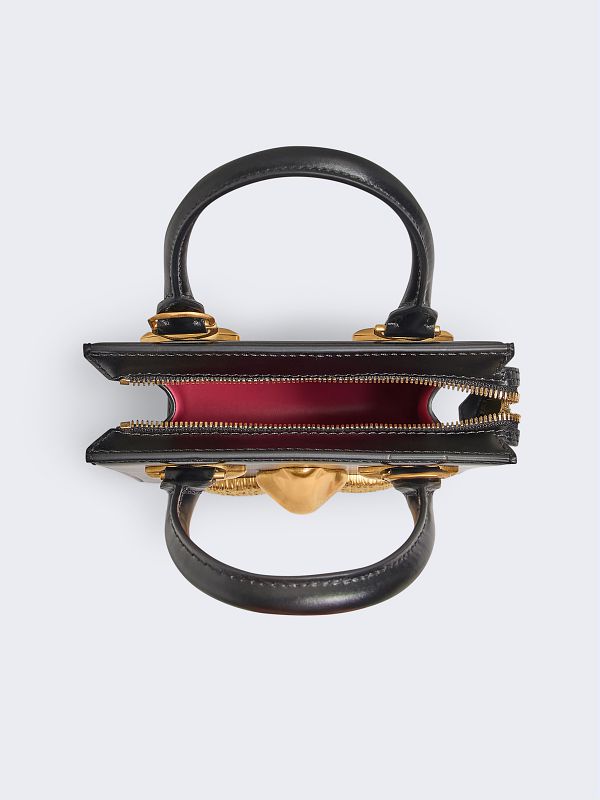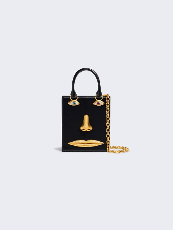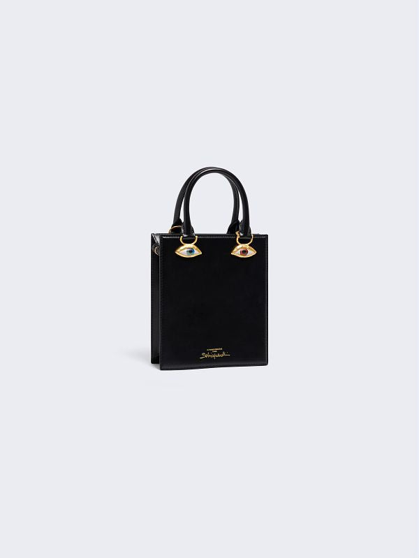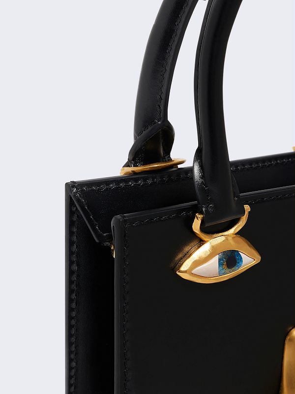 The front features a pair of printed resin eyes, with rhinestone-encrusted eyelashes adorned with natural baroque pearls and mother-of-pearl cabochons. A gold-plated brass chain is detachable thanks to two padlock-shaped lobster clasps.