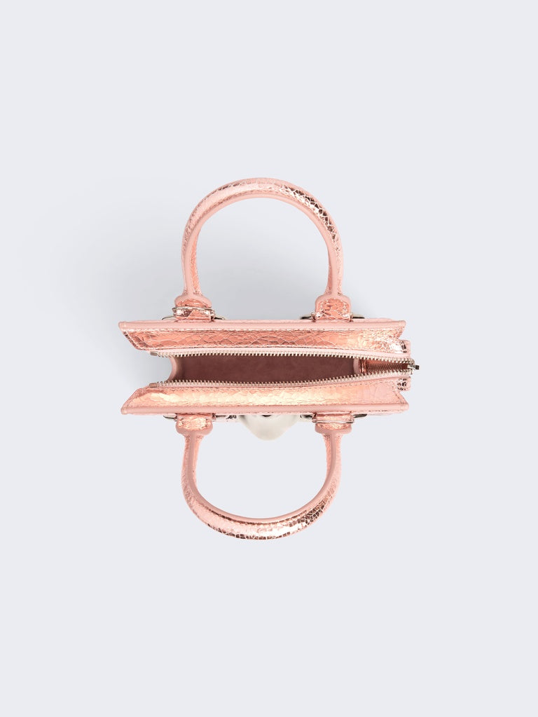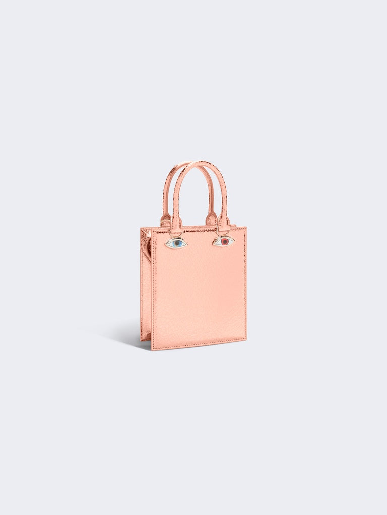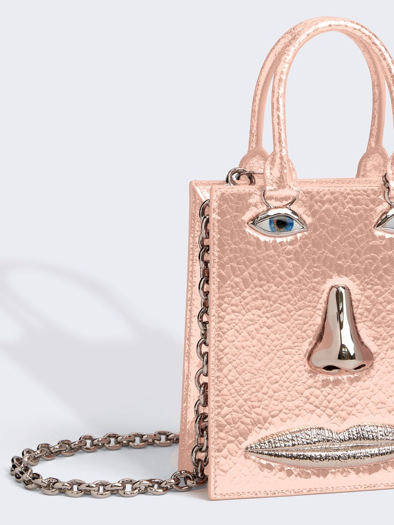 This Face handbag in mini format, made of laminated rose gold crackled calfskin and lambskin interior, is decorated with signature anatomical jewelry in enamel and hammered gold brass forming a trompe-l'œil face.