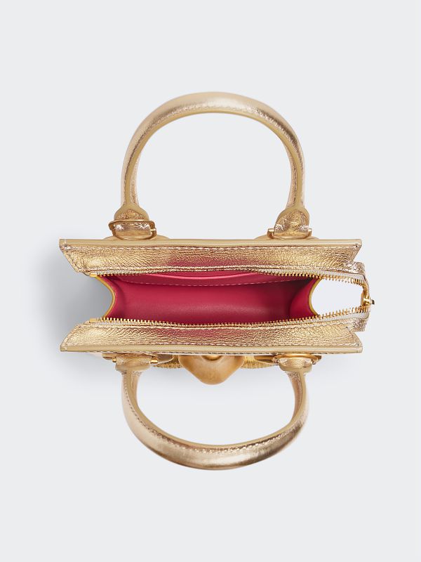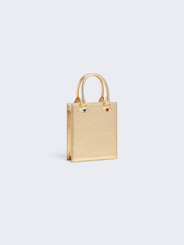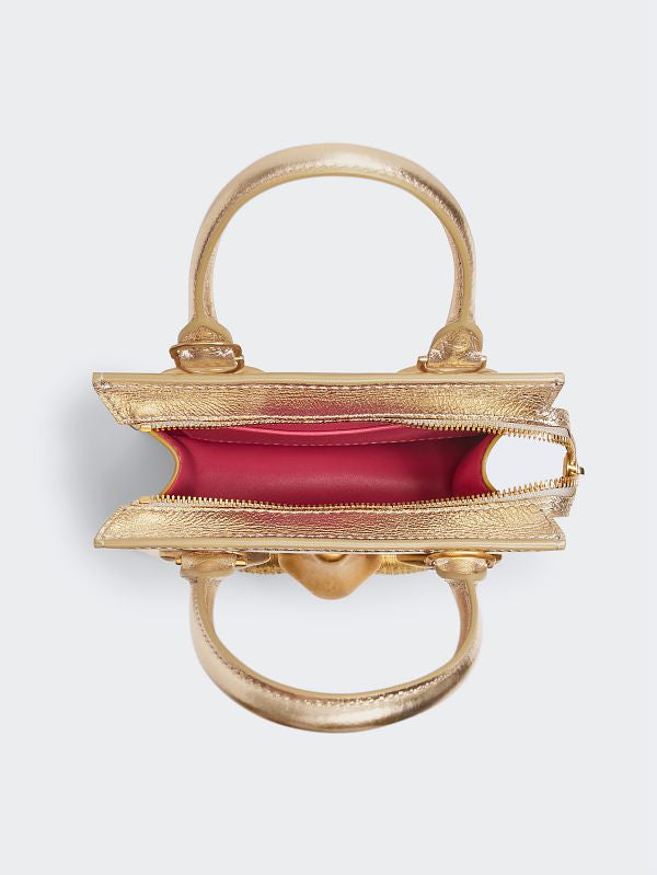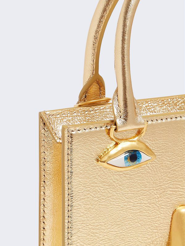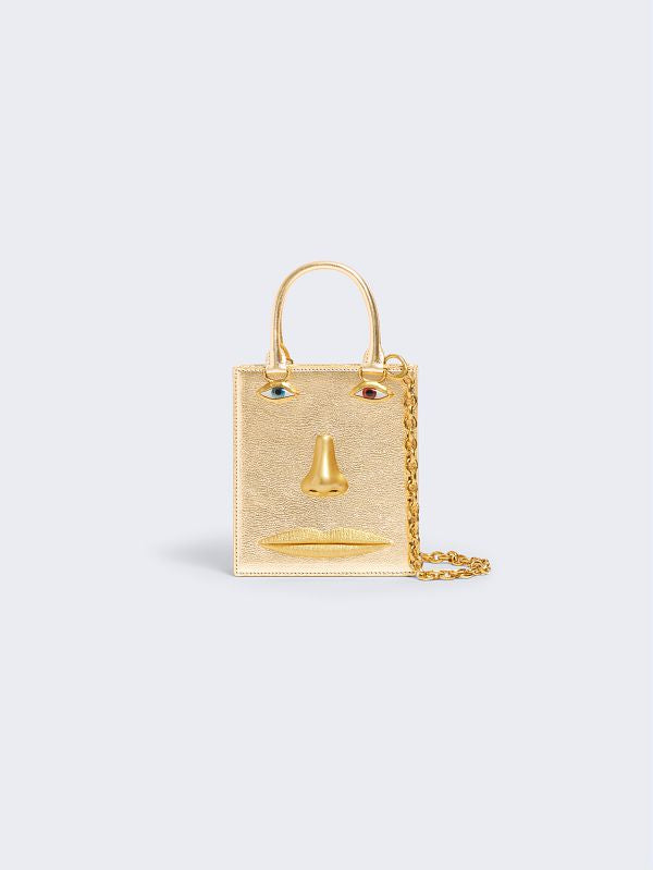 This Face handbag in a mini size, crafted from gold-laminated calfskin with a pink lambskin lining, is adorned with signature anatomical jewels in enamel and hammered gold-plated brass, forming a trompe-l'œil face. It features the House's iconic Shocking! pink lining, two leather handles, and a jeweled gold-plated metal shoulder strap.