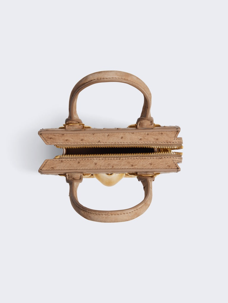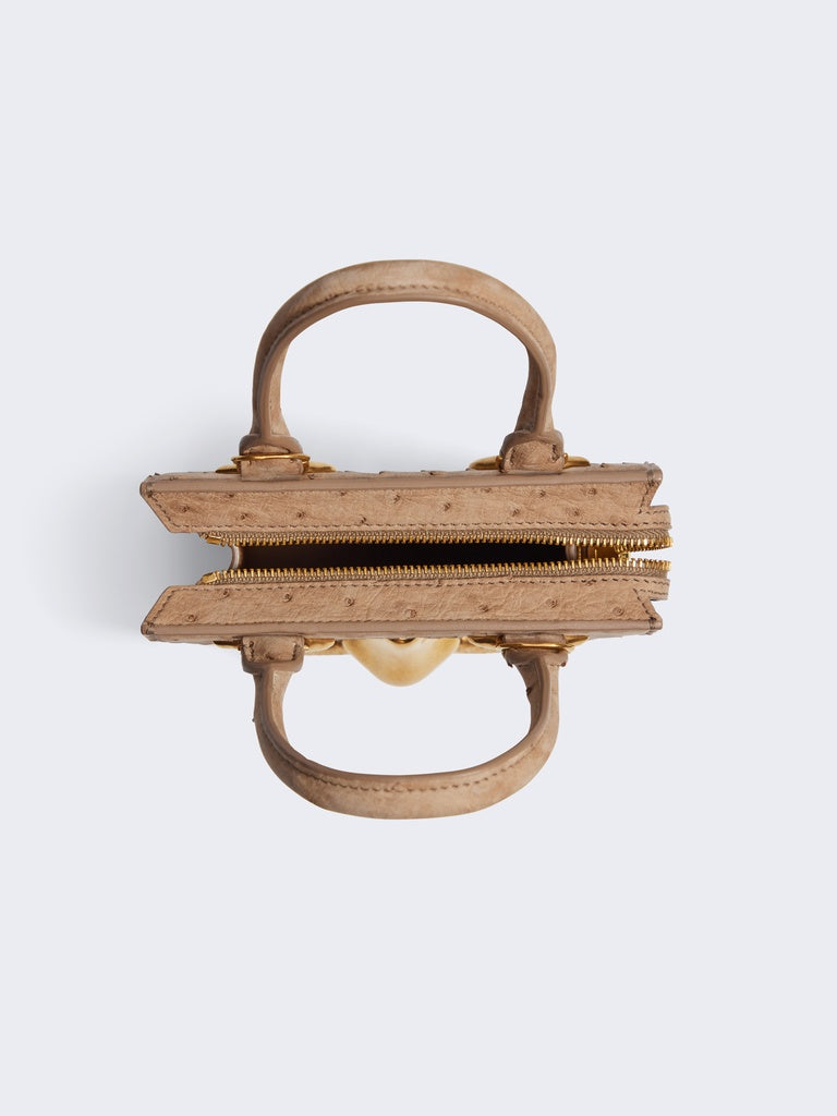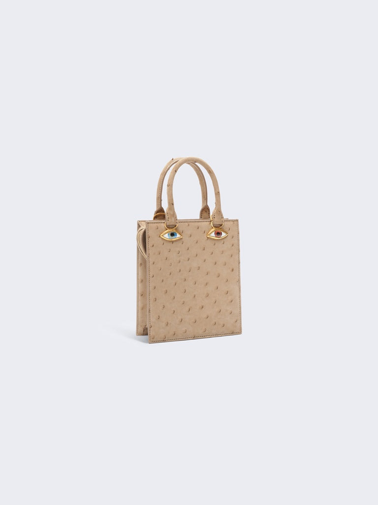 This mini Face bag is crafted from taupe ostrich leather. It is decorated with signature anatomical jewelry forming a trompe-l'œil face.