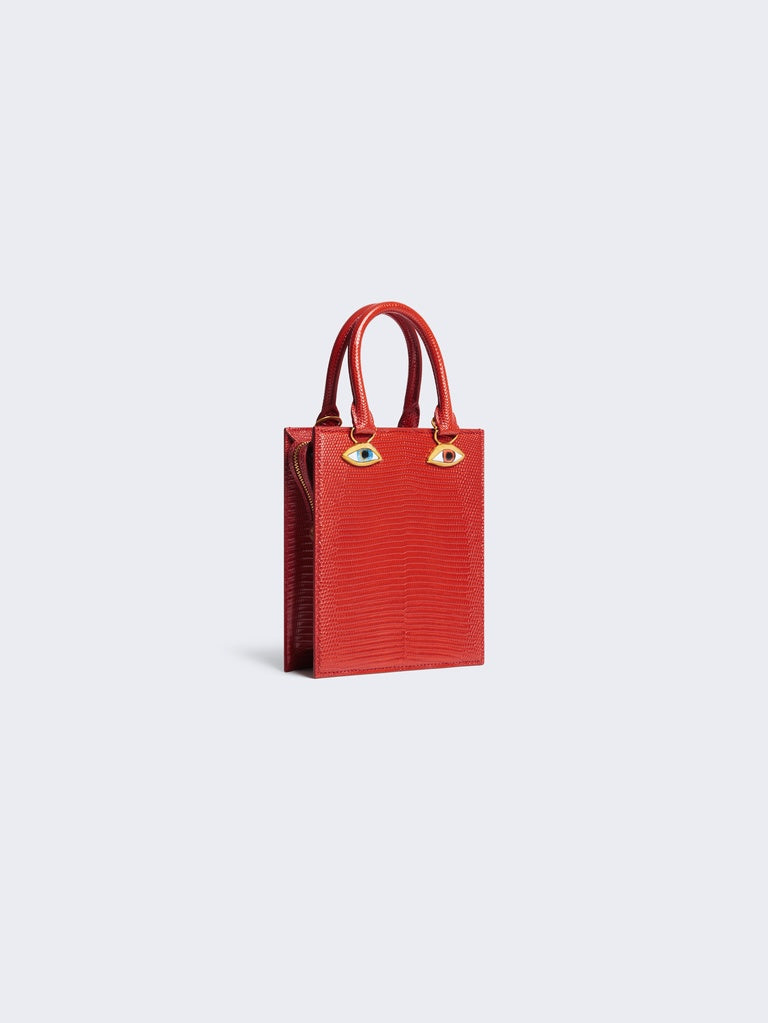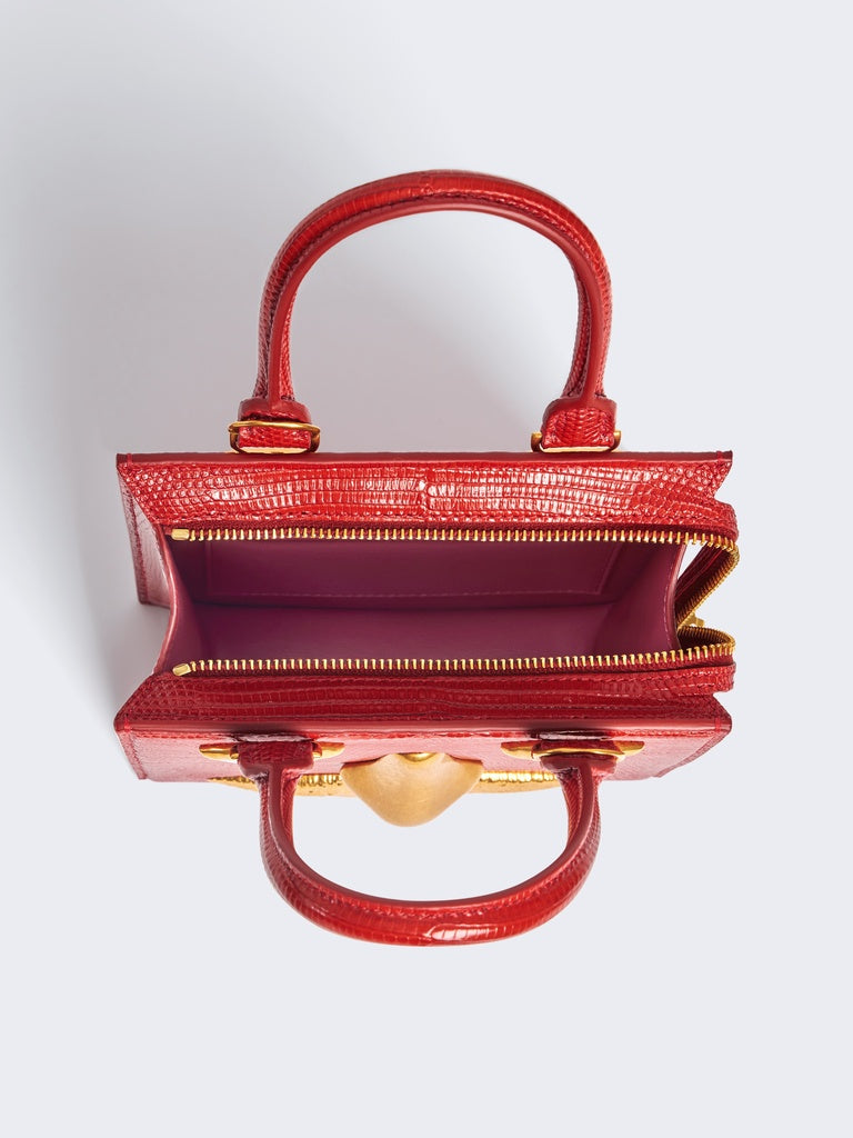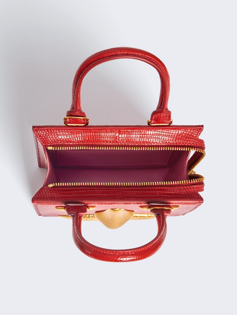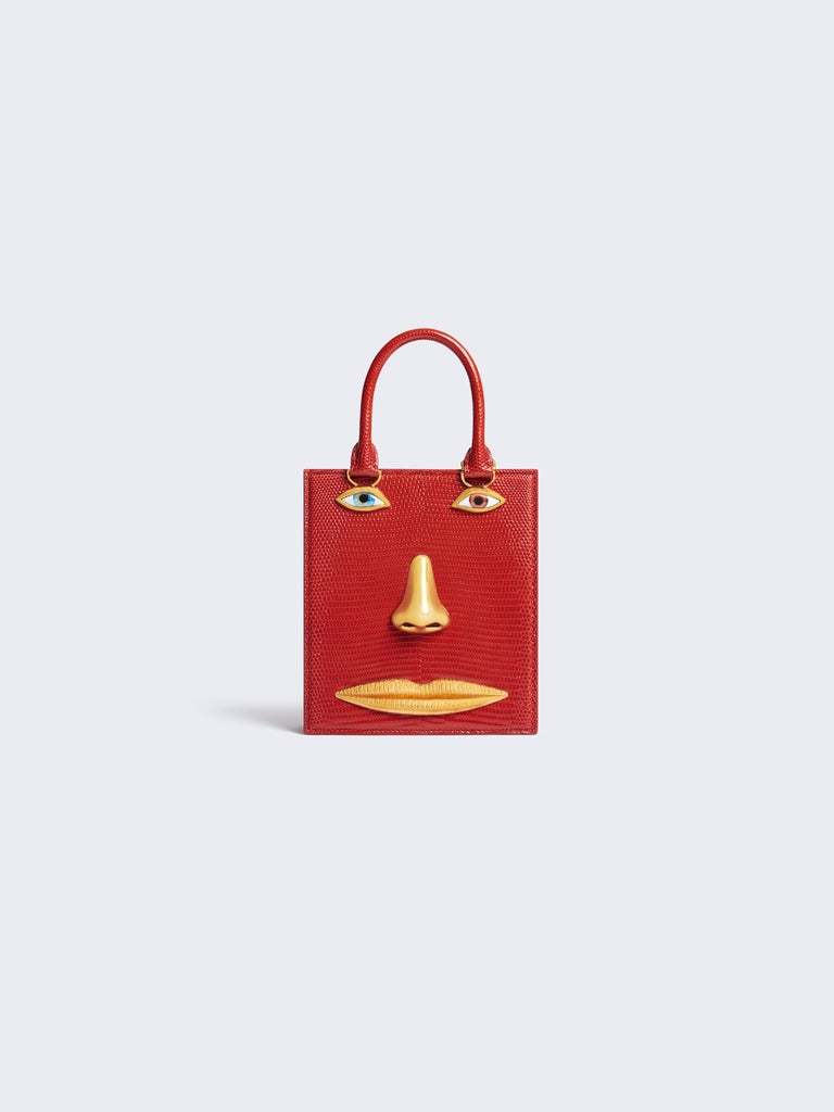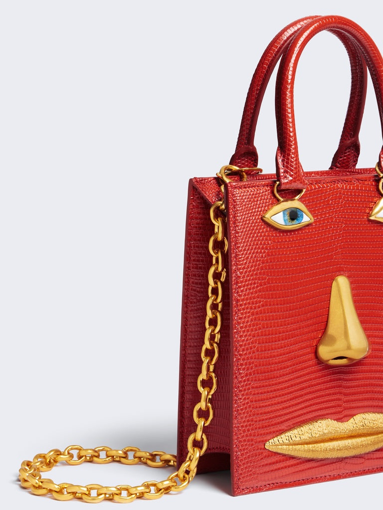 This mini Bijoux handbag in red lizard leather with a pink lambskin interior is decorated with signature anatomical jewelry in enamel and hammered gold brass forming a trompe-l'œil face.