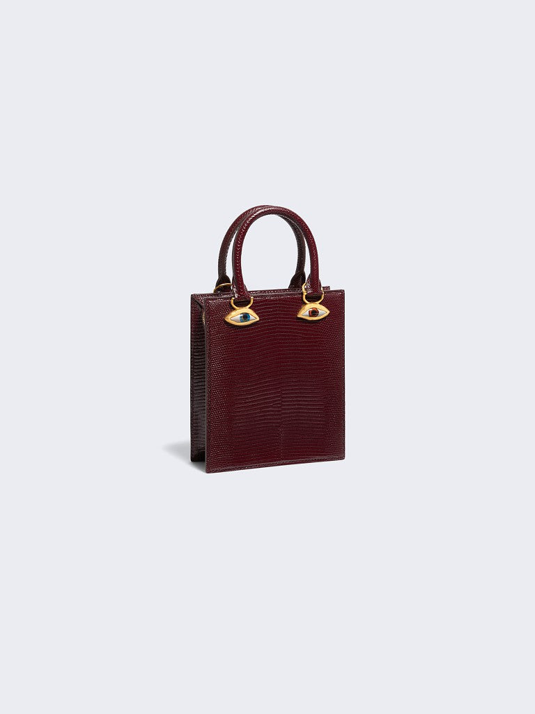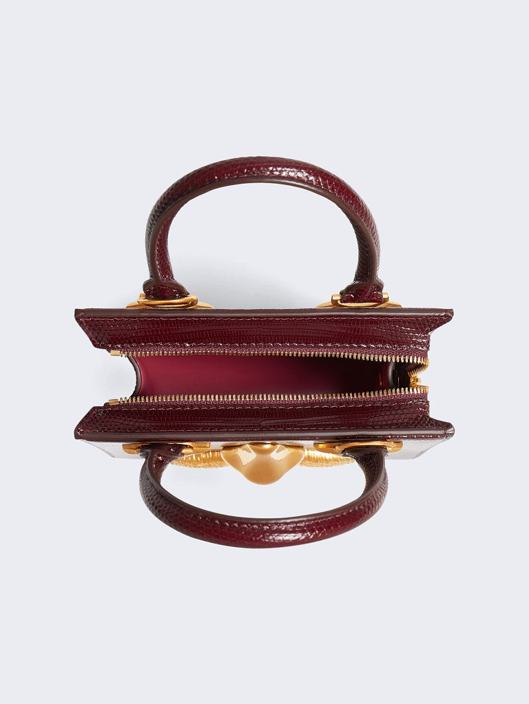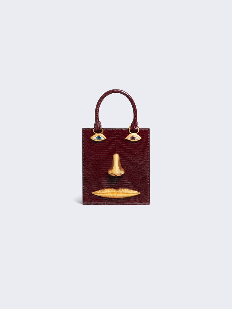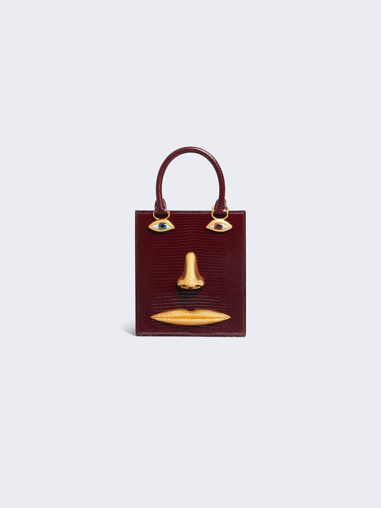 This mini Bijoux handbag in brown lizard leather with a pink lambskin interior is decorated with signature anatomical jewelry in enamel and hammered gold brass forming a trompe-l'œil face.