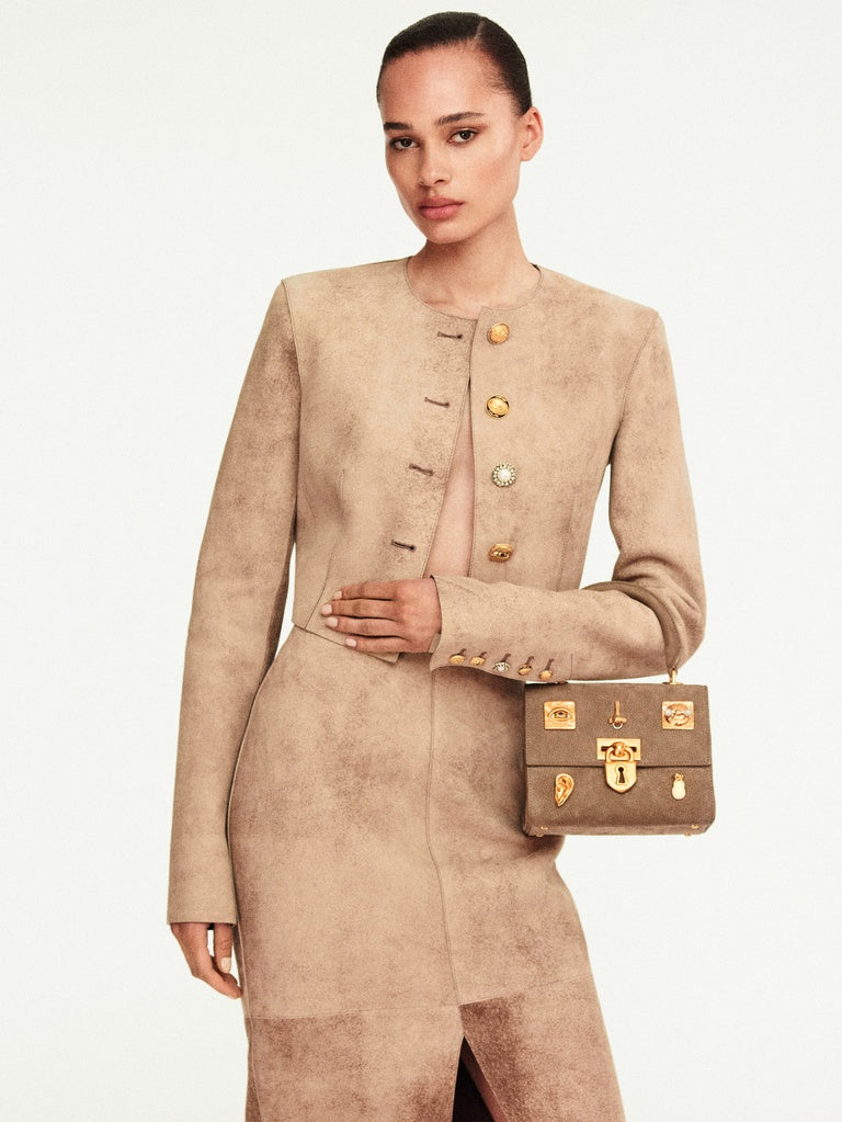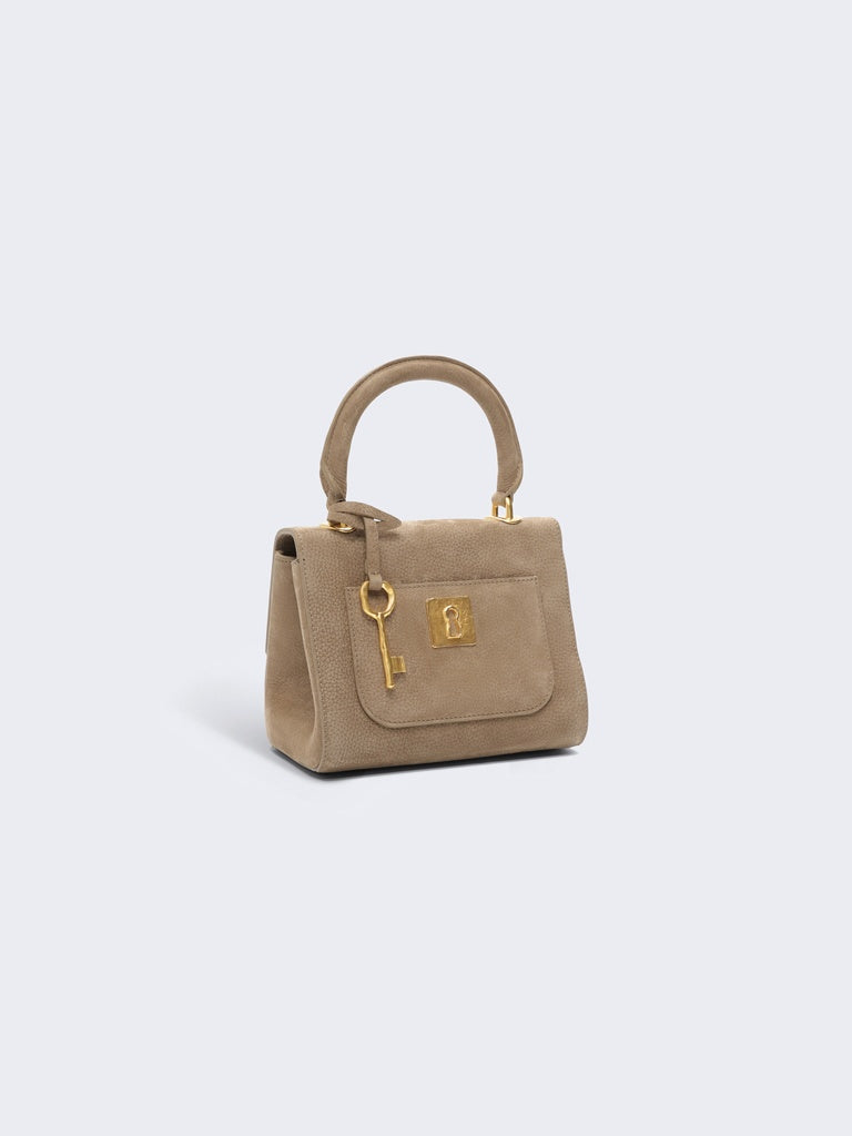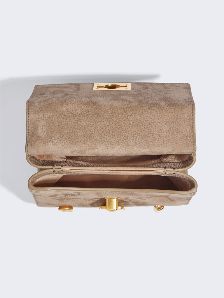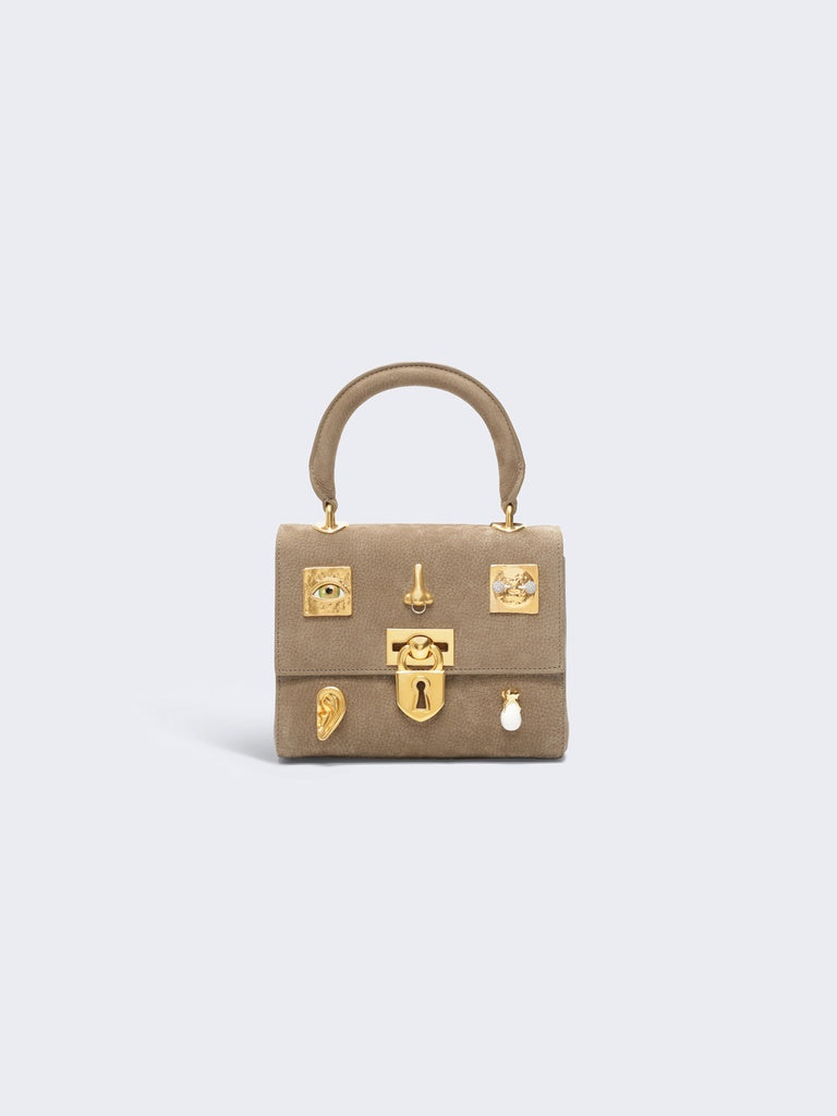 This mini Secret Bijoux bag is crafted from taupe nubuck calfskin leather. It is decorated with jeweled buttons bearing the Maison's signature codes in hammered gold-plated brass and a signature padlock clasp.