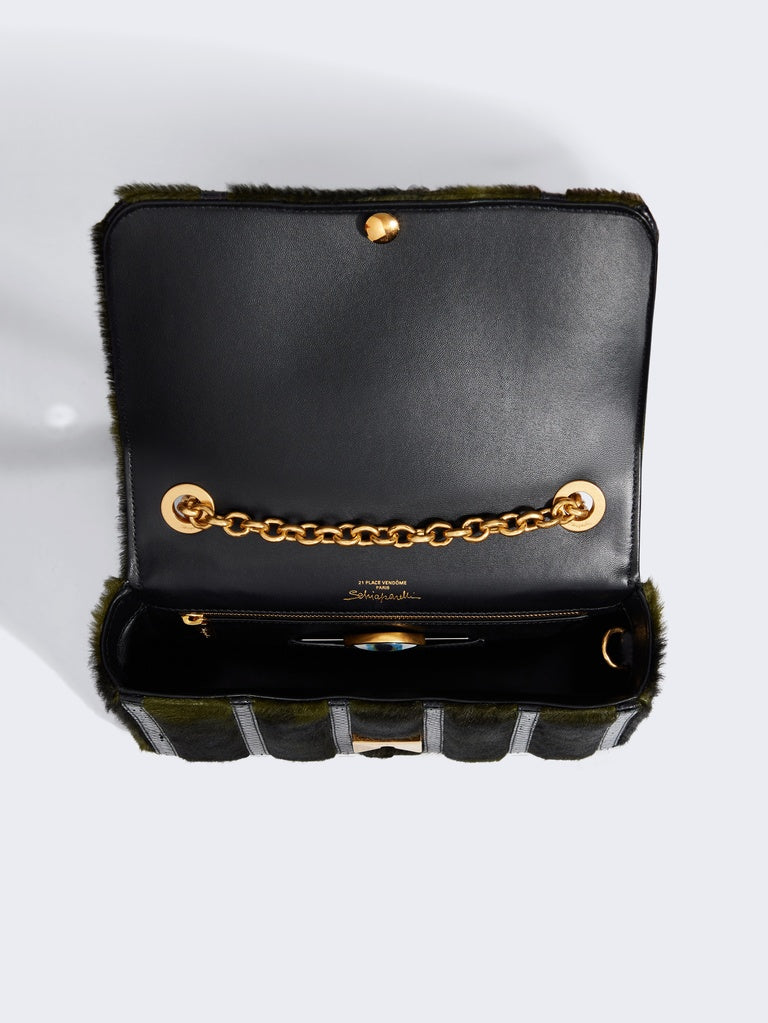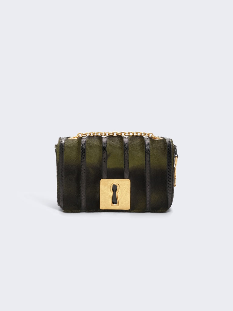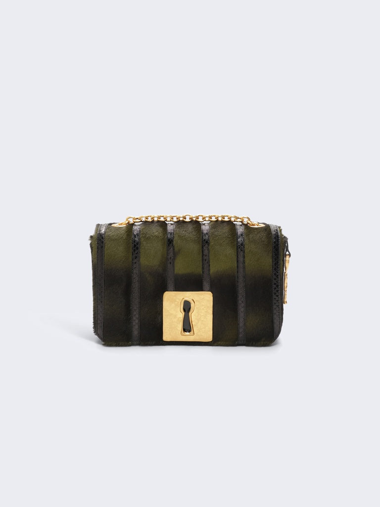 This Schiap bag is crafted from dark green short-haired calfskin leather with a pony effect and tonal stitched elaphe leather strips.