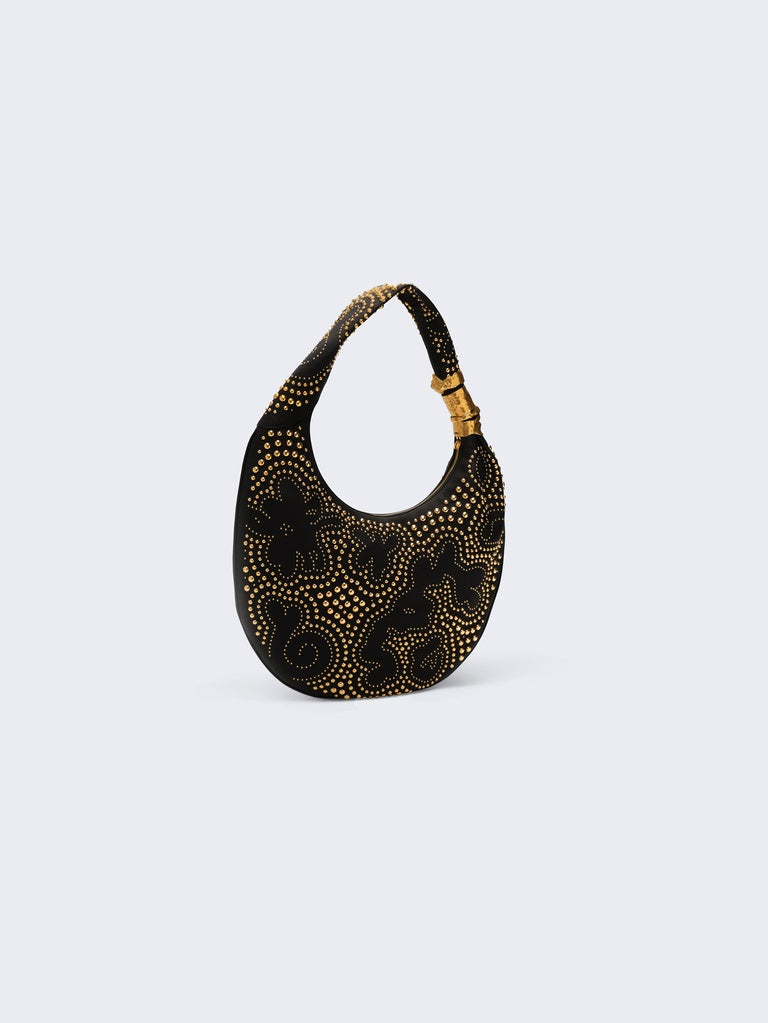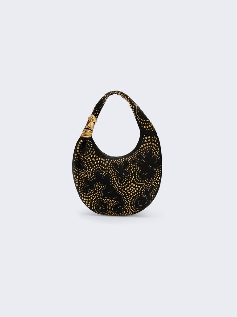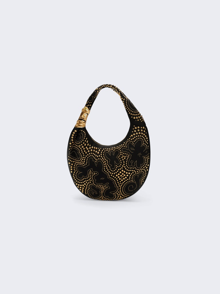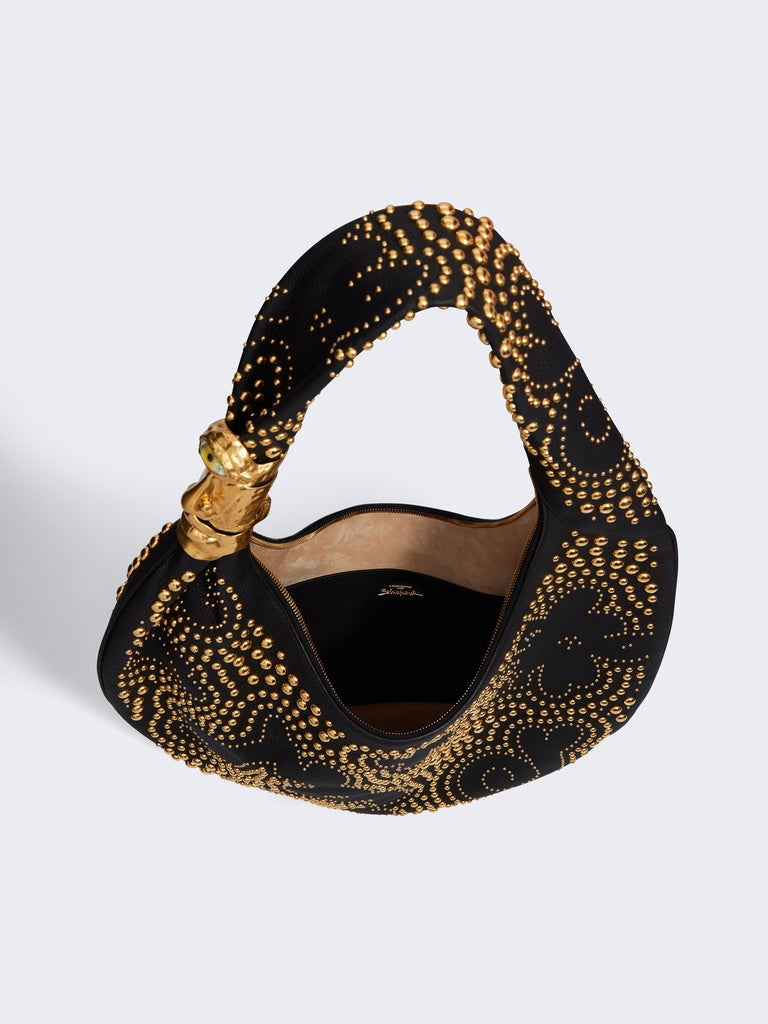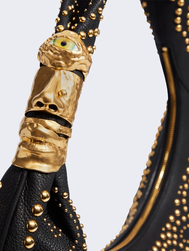 This large Soufflé bag is crafted from black grained calfskin leather adorned with gold studs forming a motif that echoes the House's iconic codes. It is embellished with signature Anatomie jewelry in hammered gold-plated brass, forming a face on the handle.