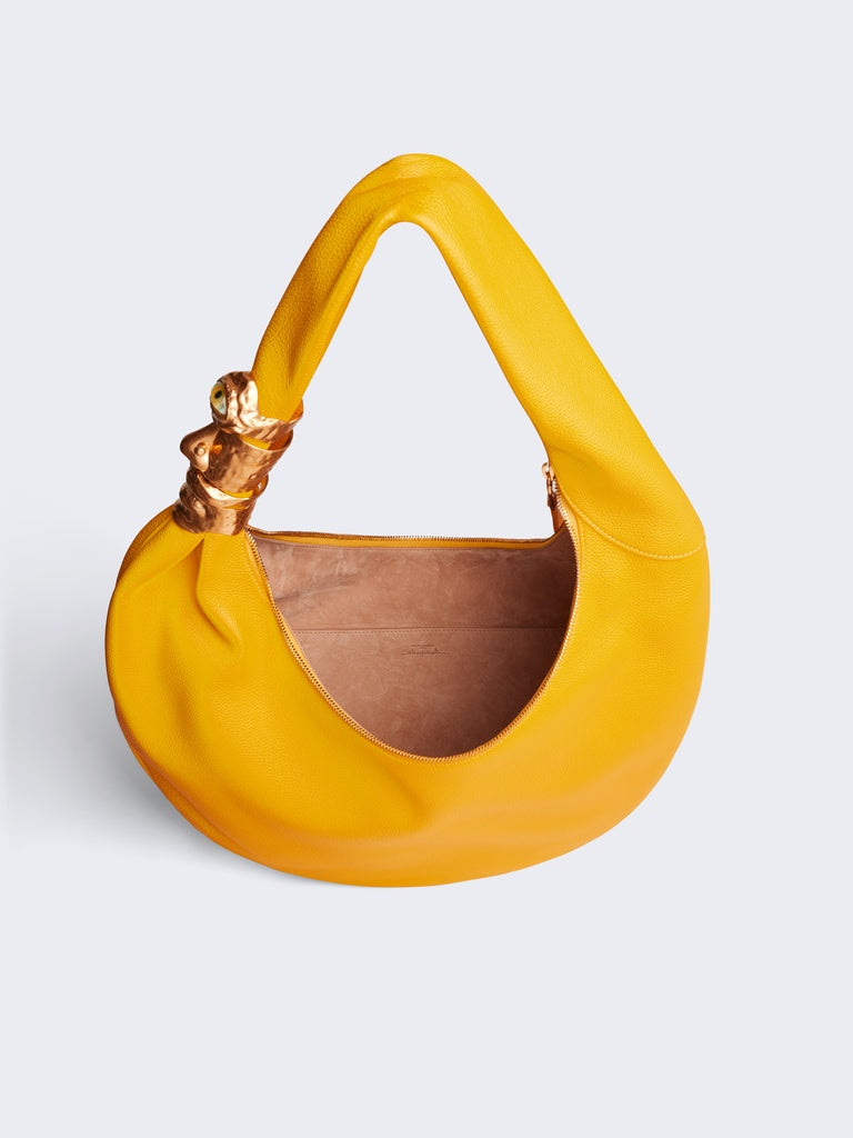 Our Soufflé bag with curved lines is crafted from yellow grained calfskin leather enhanced with signature Anatomie jewelry in hammered gold brass forming a face on the handle.