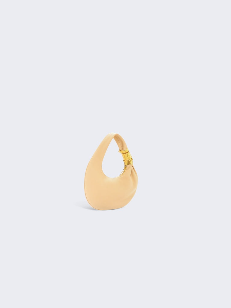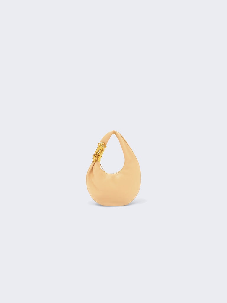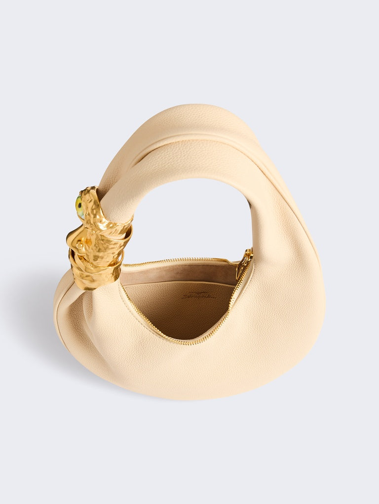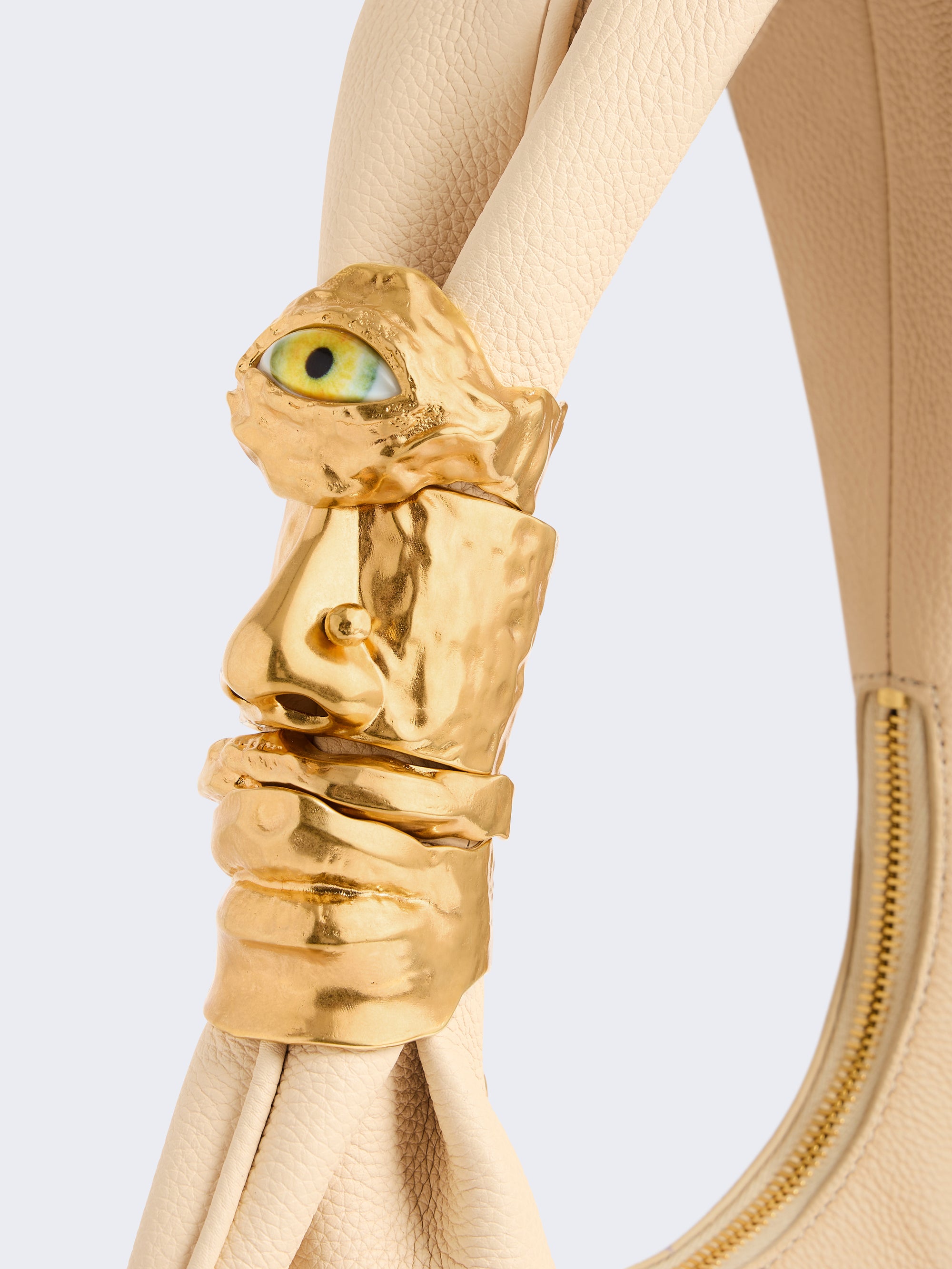 The small Soufflé bag with curved lines is made from sand grained calfskin leather enhanced with signature Anatomie jewelry in hammered gold brass forming a face on the handle.