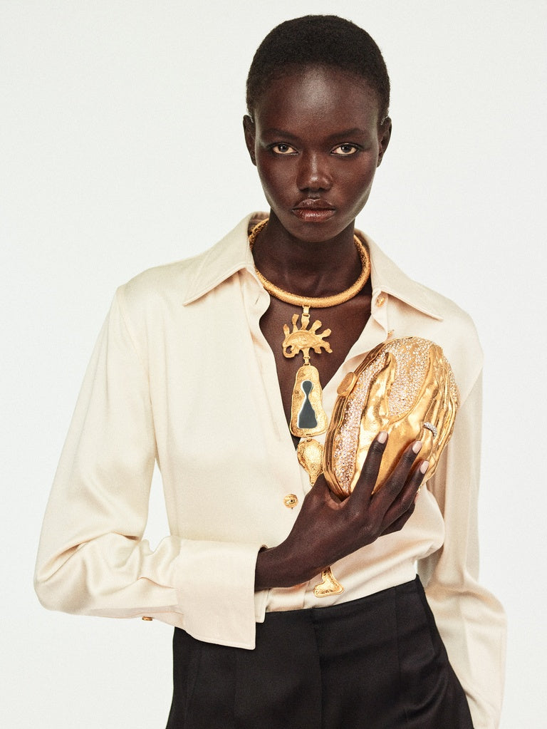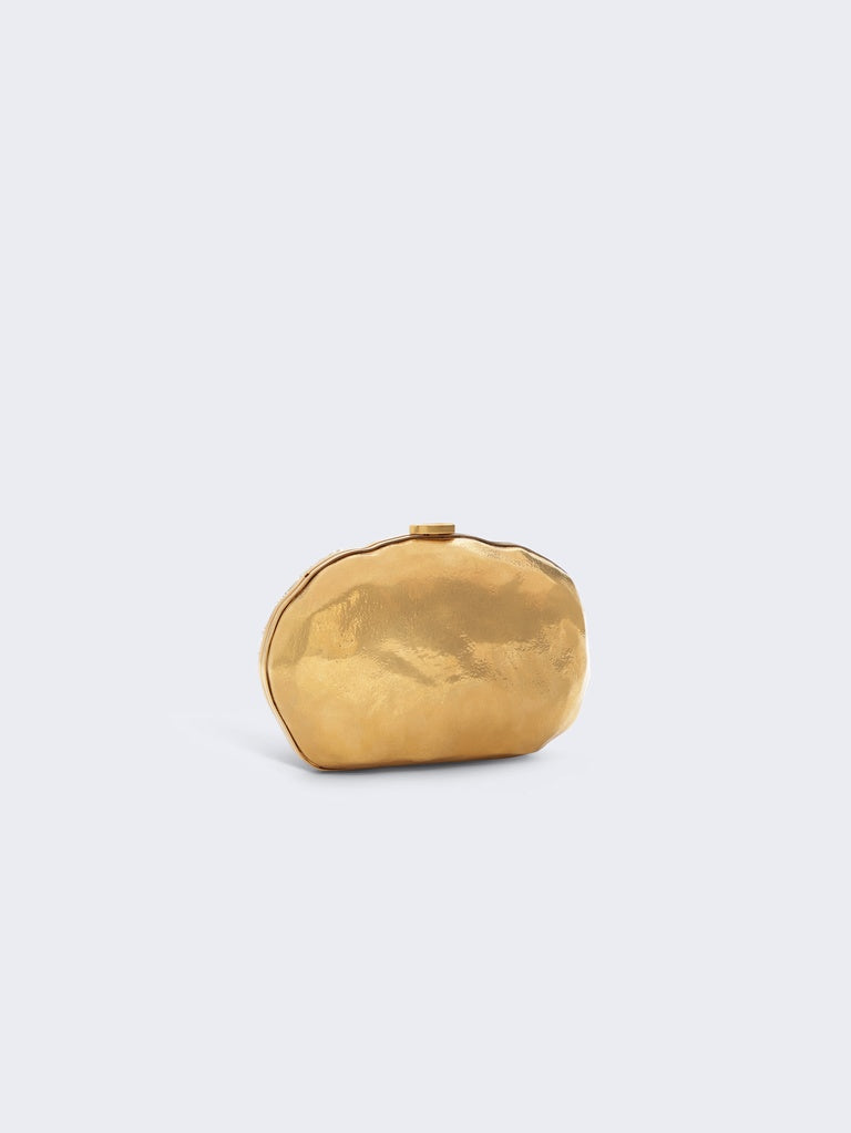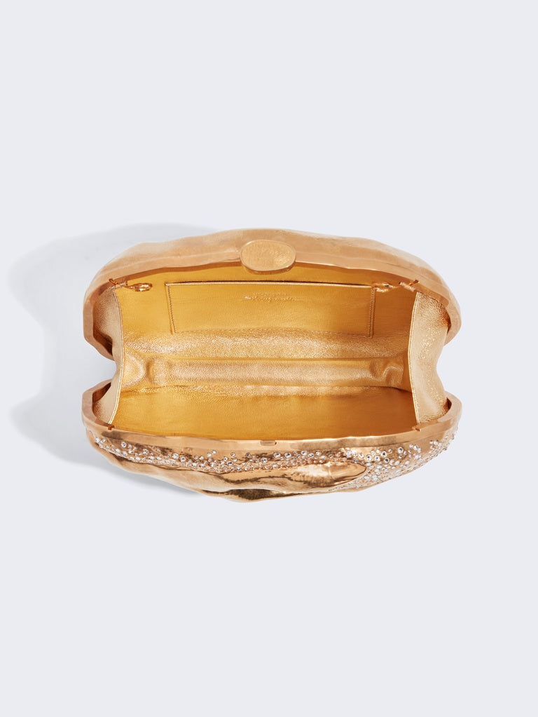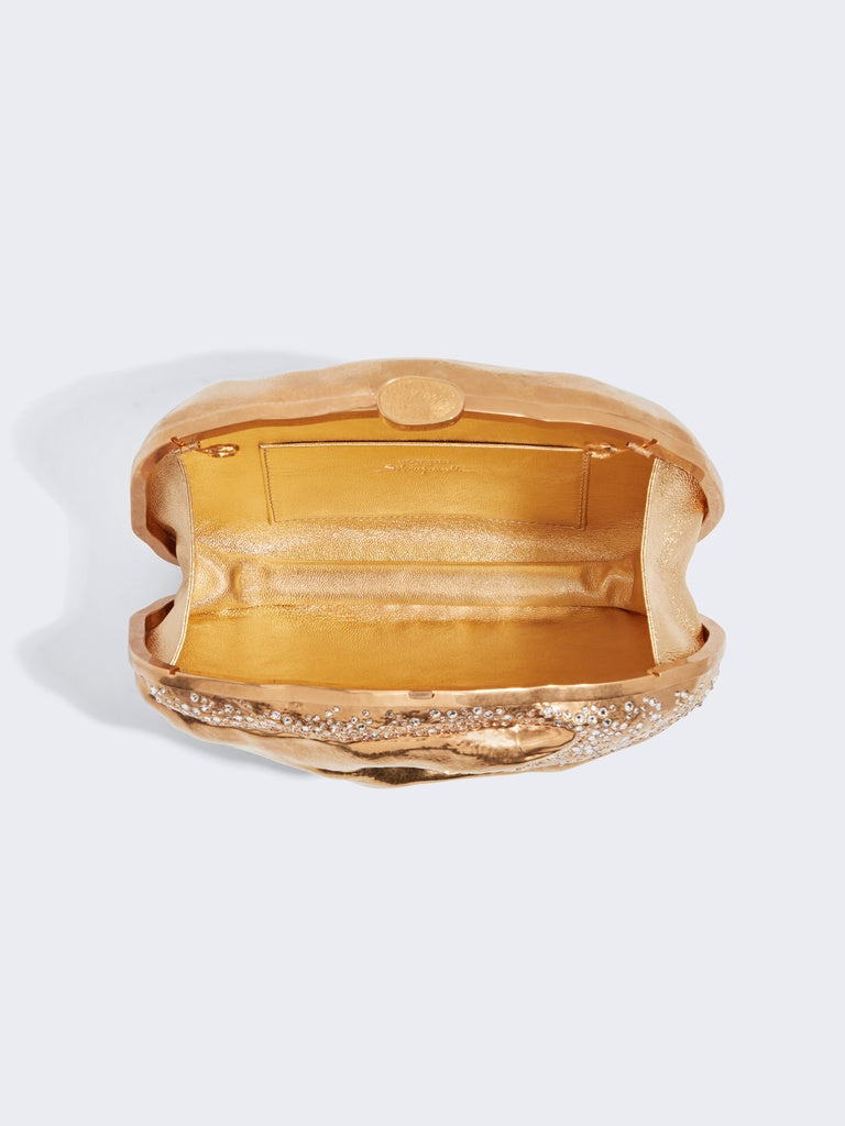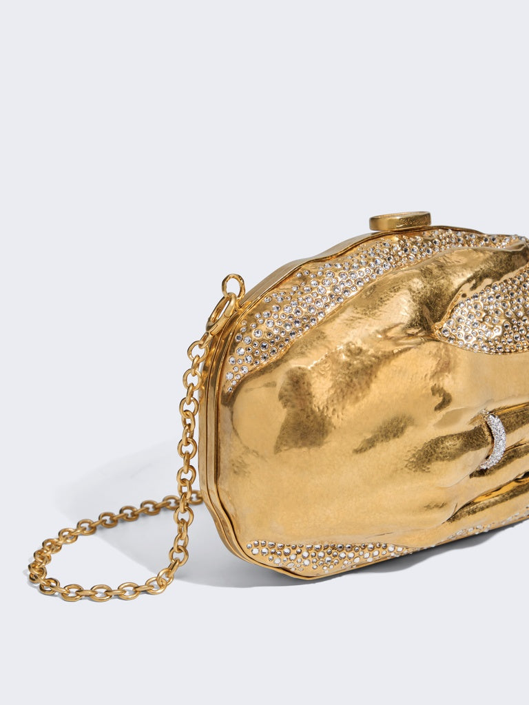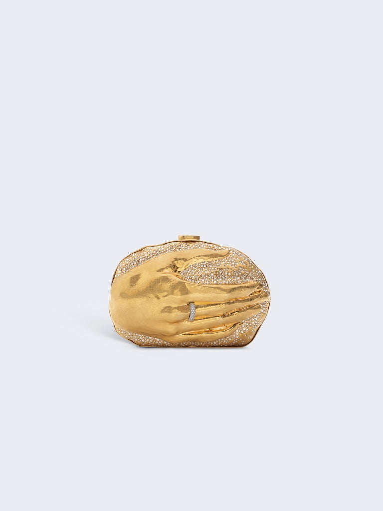 This rigid copper minaudière, set with rhinestones, is decorated with a hand inset adorned with a rhinestone ring. It is enhanced by a delicate gold-plated brass chain.