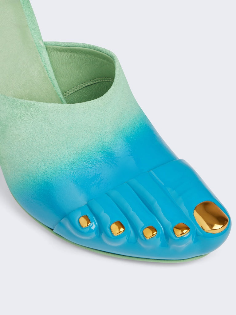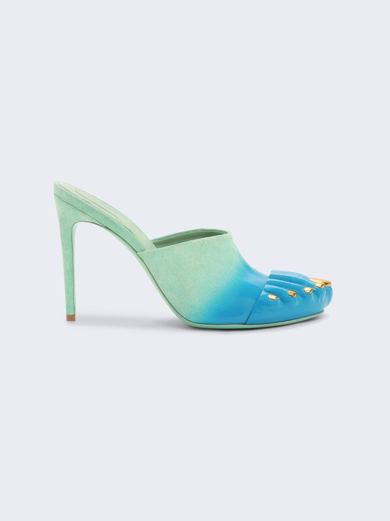 These turquoise suede heeled mules have been hand-spray-painted to create this glossy gradient effect.