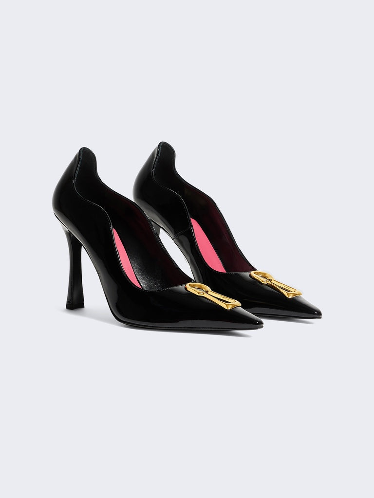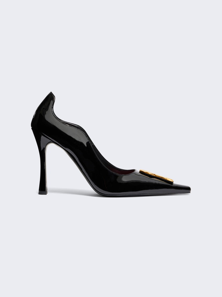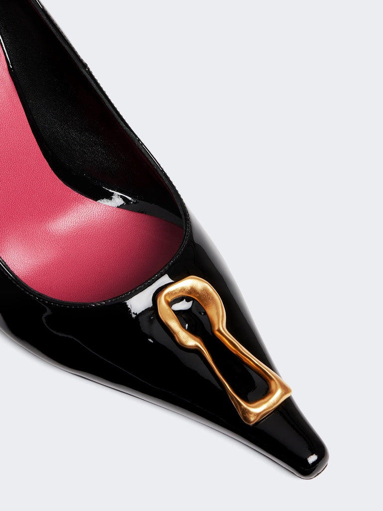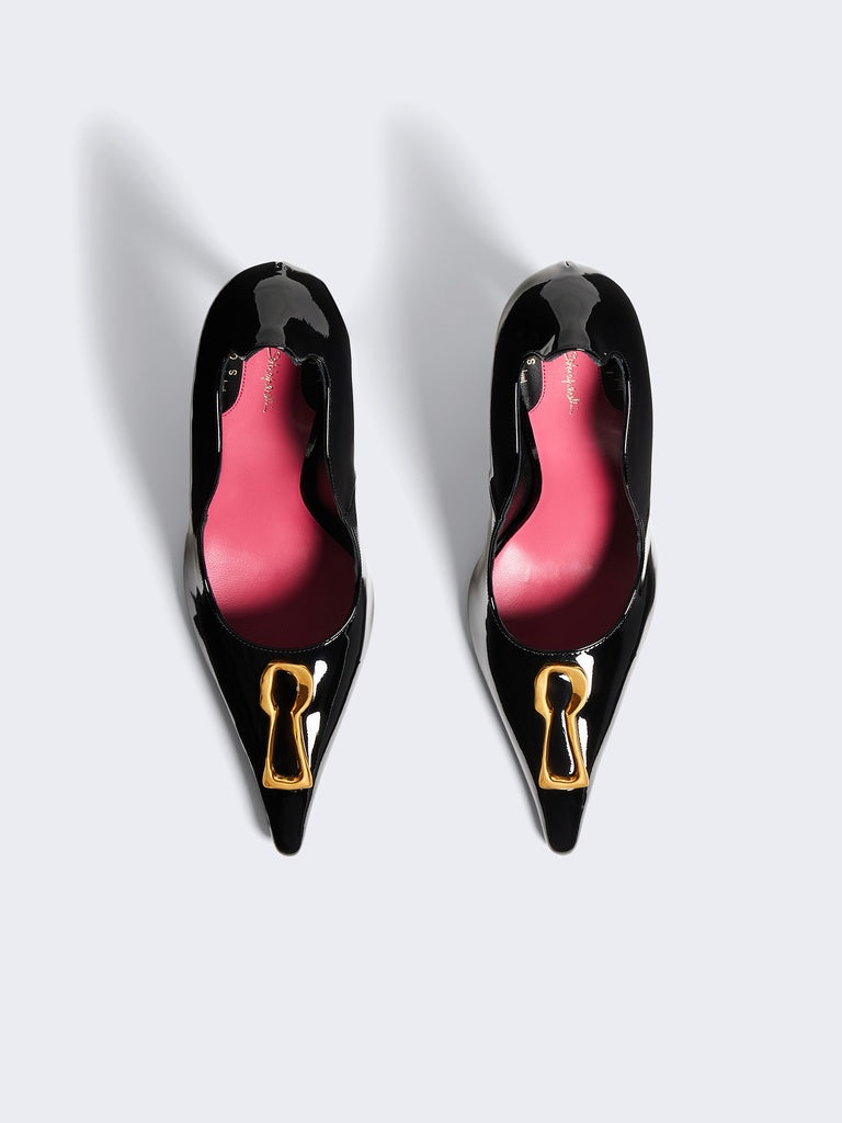 This pointed-toe pump in black patent leather with a leather lining is decorated with the House's signature gold-tone metal keyhole detail. Its low-cut design at the sides and its 105mm heel accentuate the leg's shape.