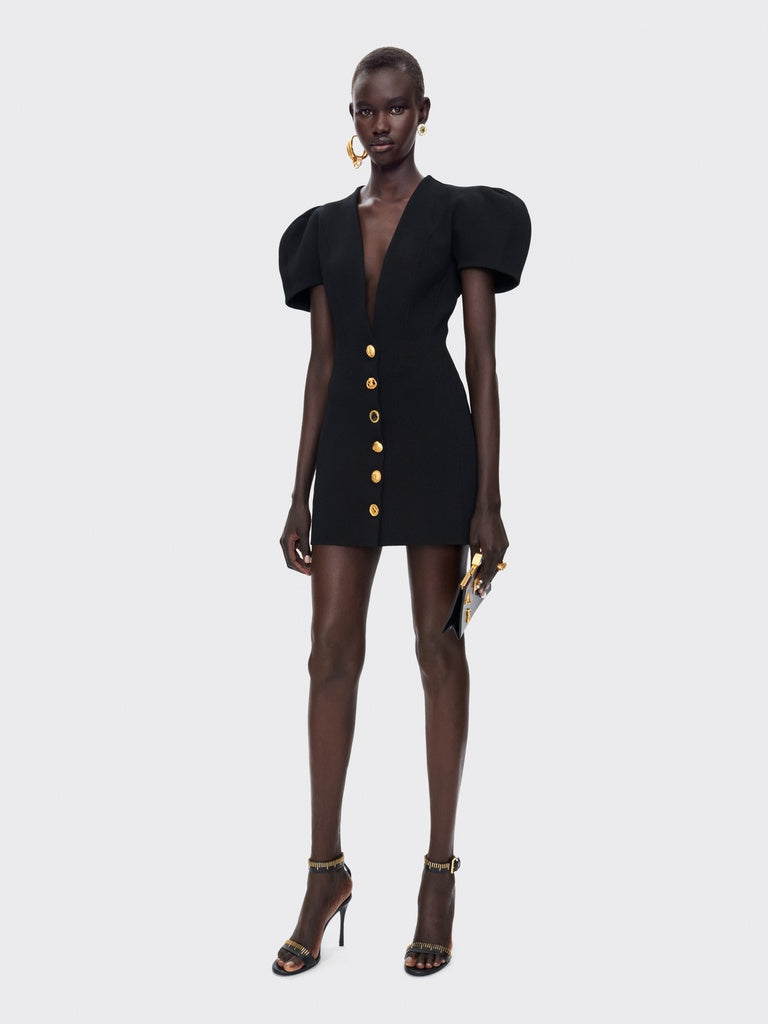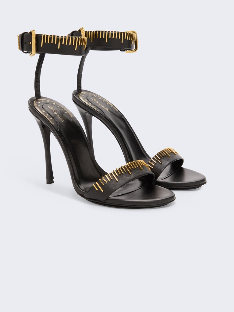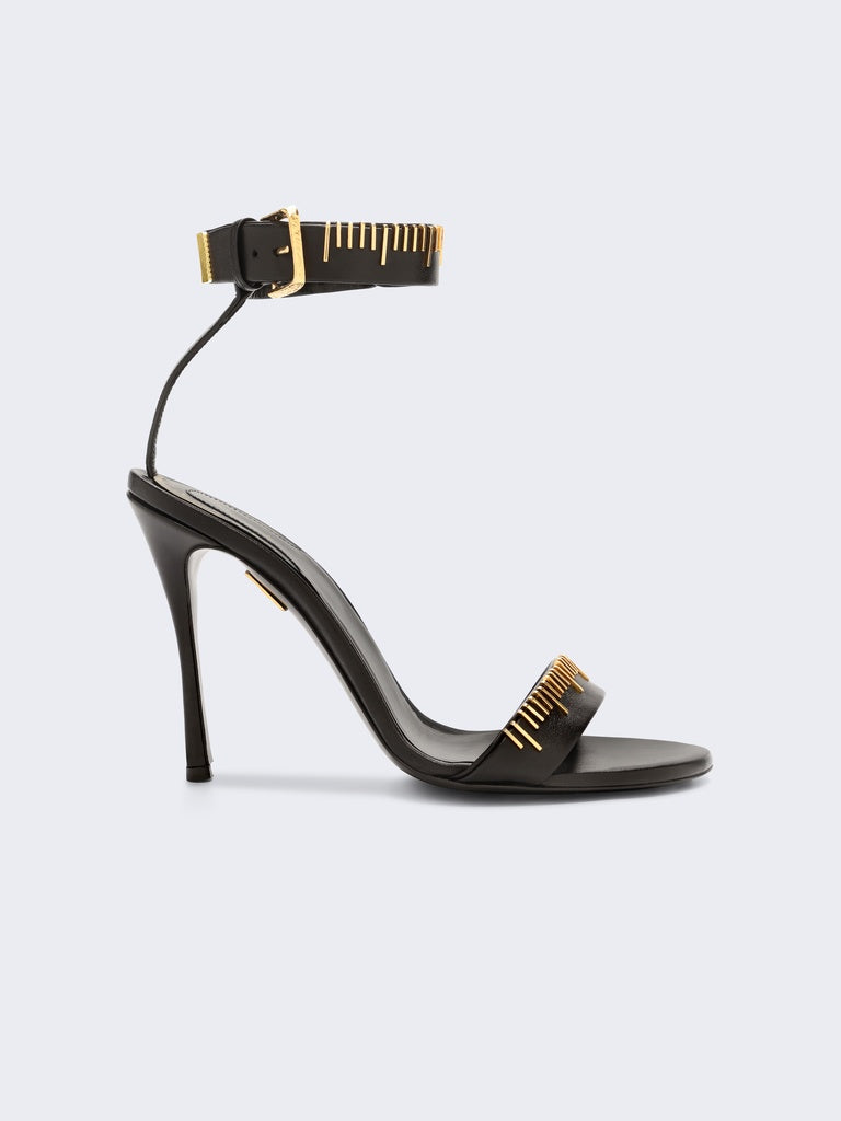 These black leather heeled sandals decorated with a signature tape measure embroidery are inspired by one of the House's iconic codes.