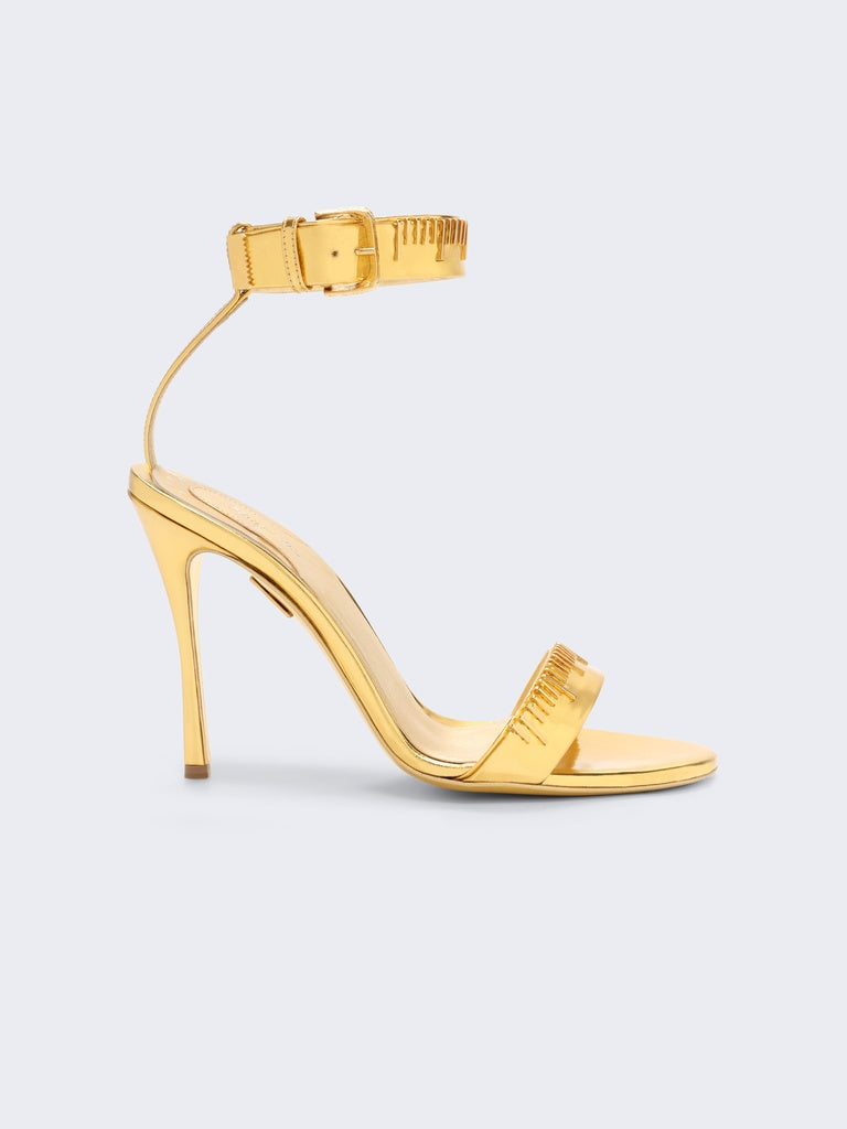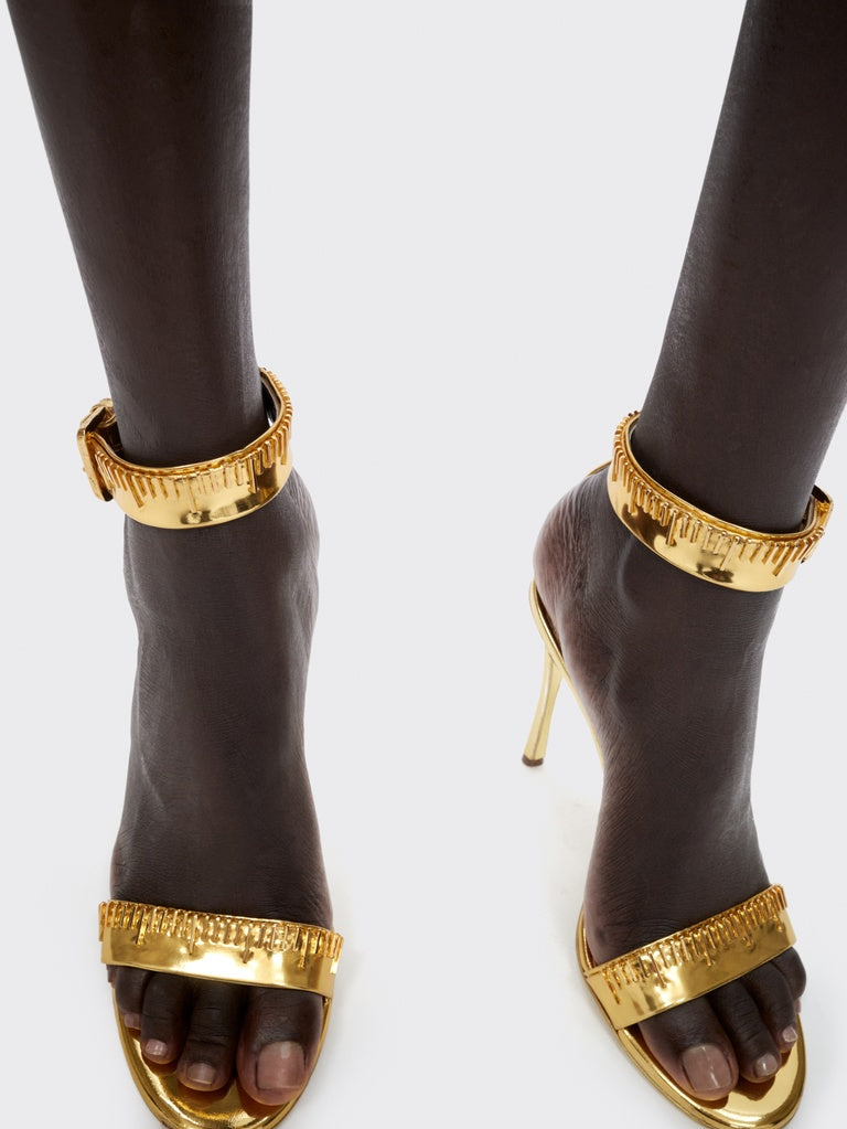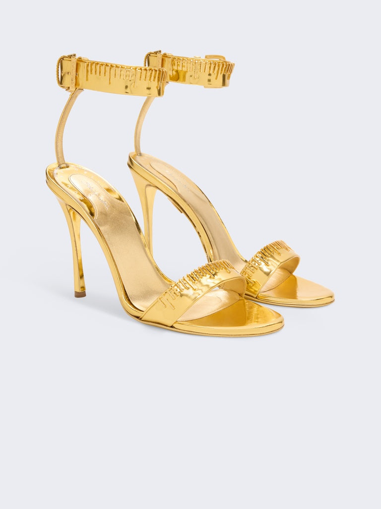 These gold leather heeled sandals decorated with signature tape measure embroidery are inspired by one of the House's iconic codes.