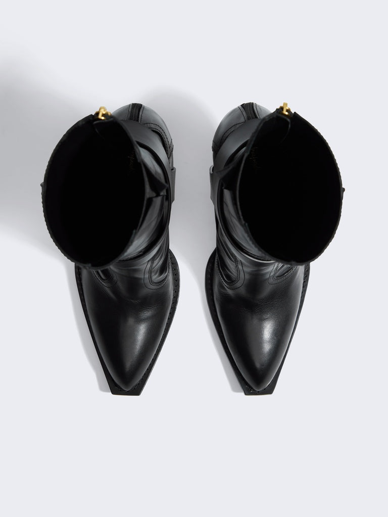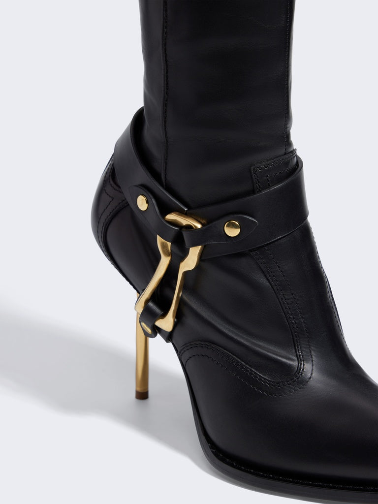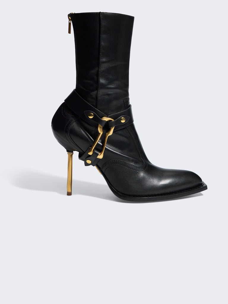 This pair of western-inspired ankle boots in black leather with a stiletto heel adorned with a rhinestone ring and a removable strap enhanced with the gold metal Keyhole detail pays homage to one of the House's iconic codes.