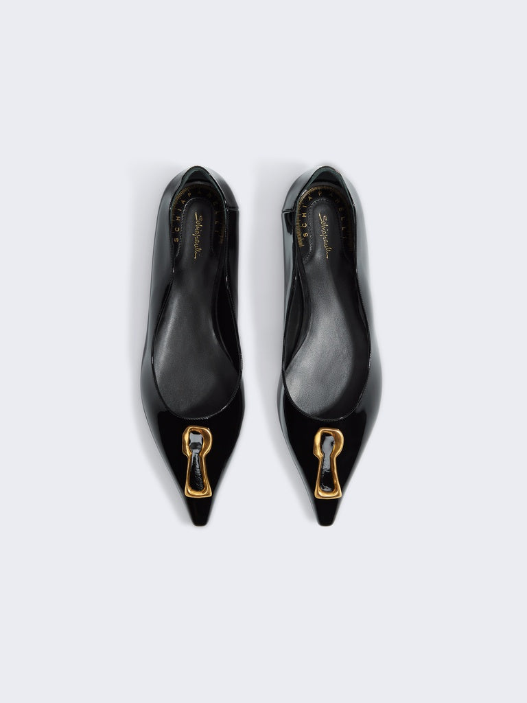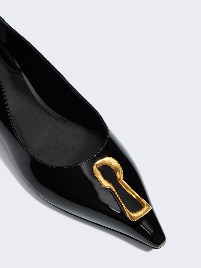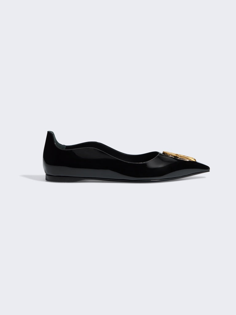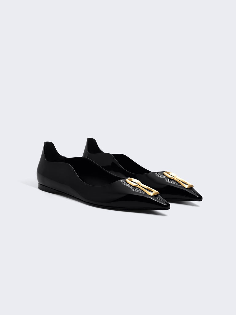 This pair of black patent leather ballerina flats with a wavy upper enhanced with the signature Trou de Serrure detail in gold metal pays homage to one of the House's iconic codes.