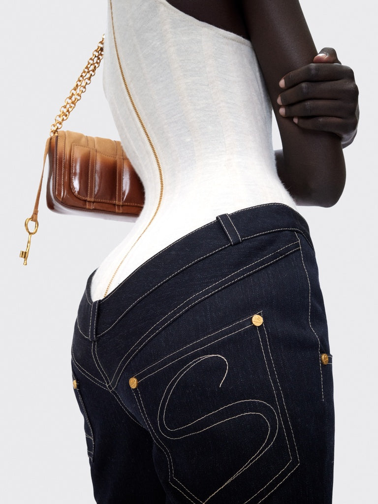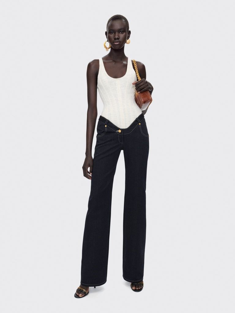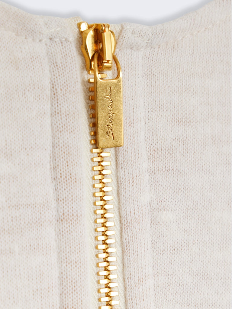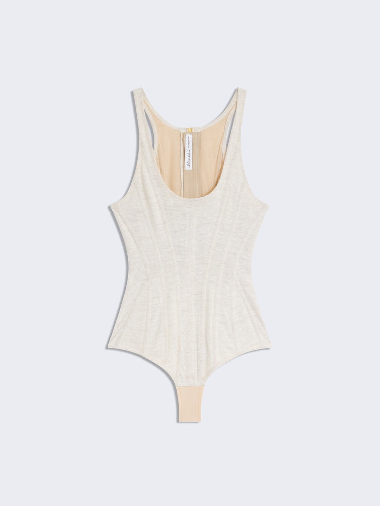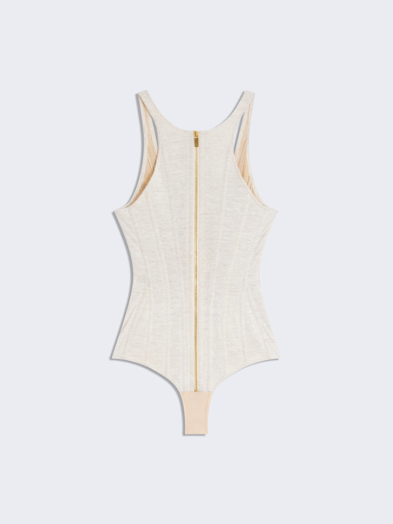 This ecru wool jersey bodysuit features a corset-inspired construction that accentuates the waist. It is embellished with tone-on-tone topstitching details and a gold metal zip at the center back.