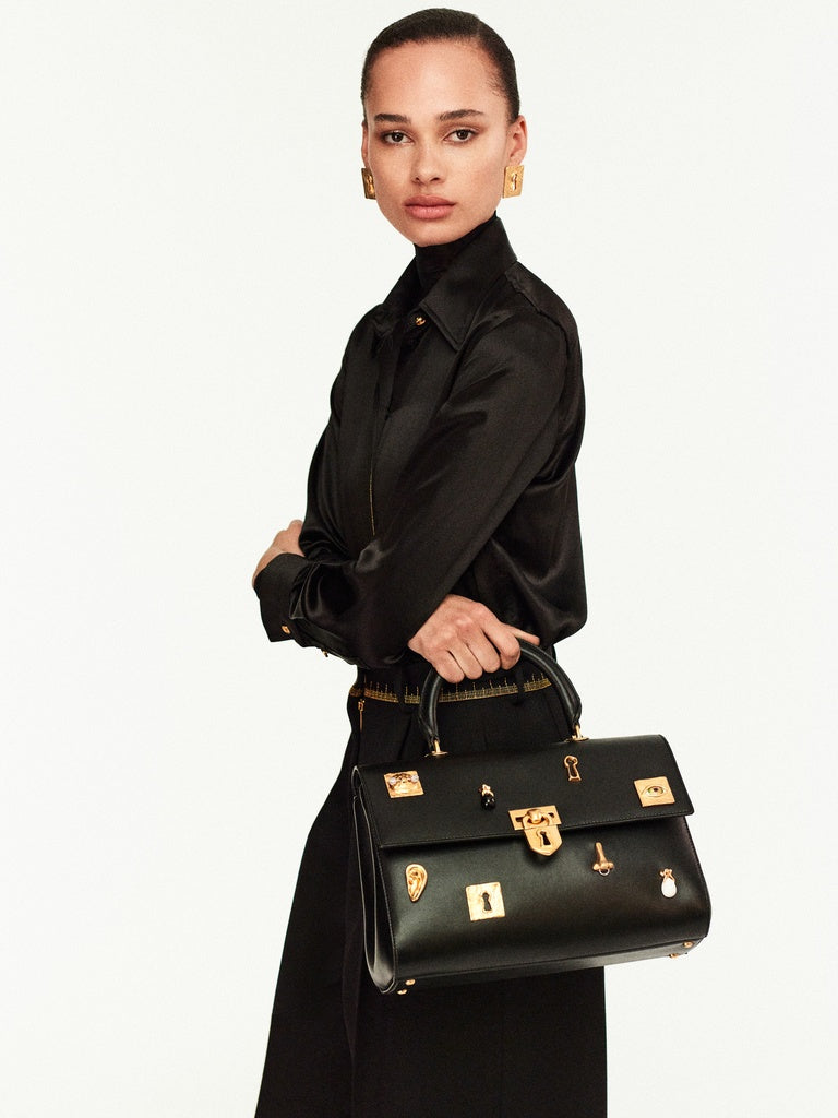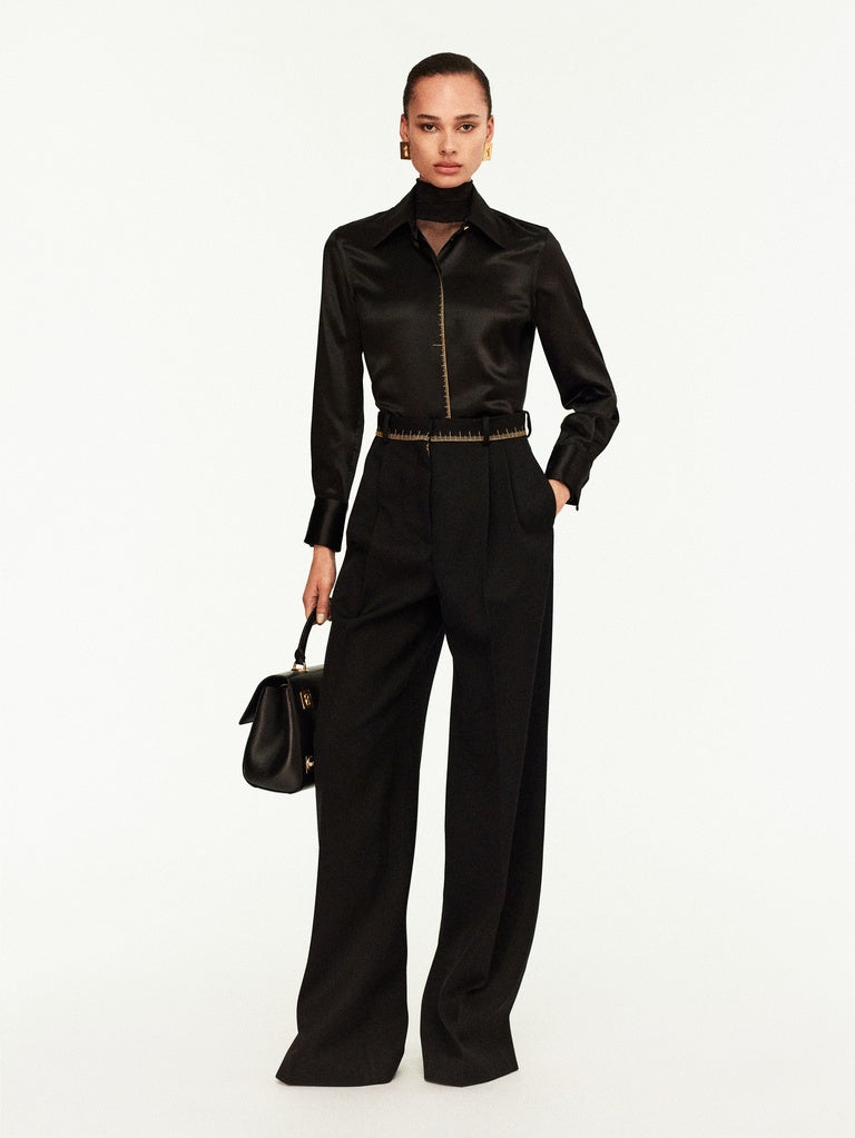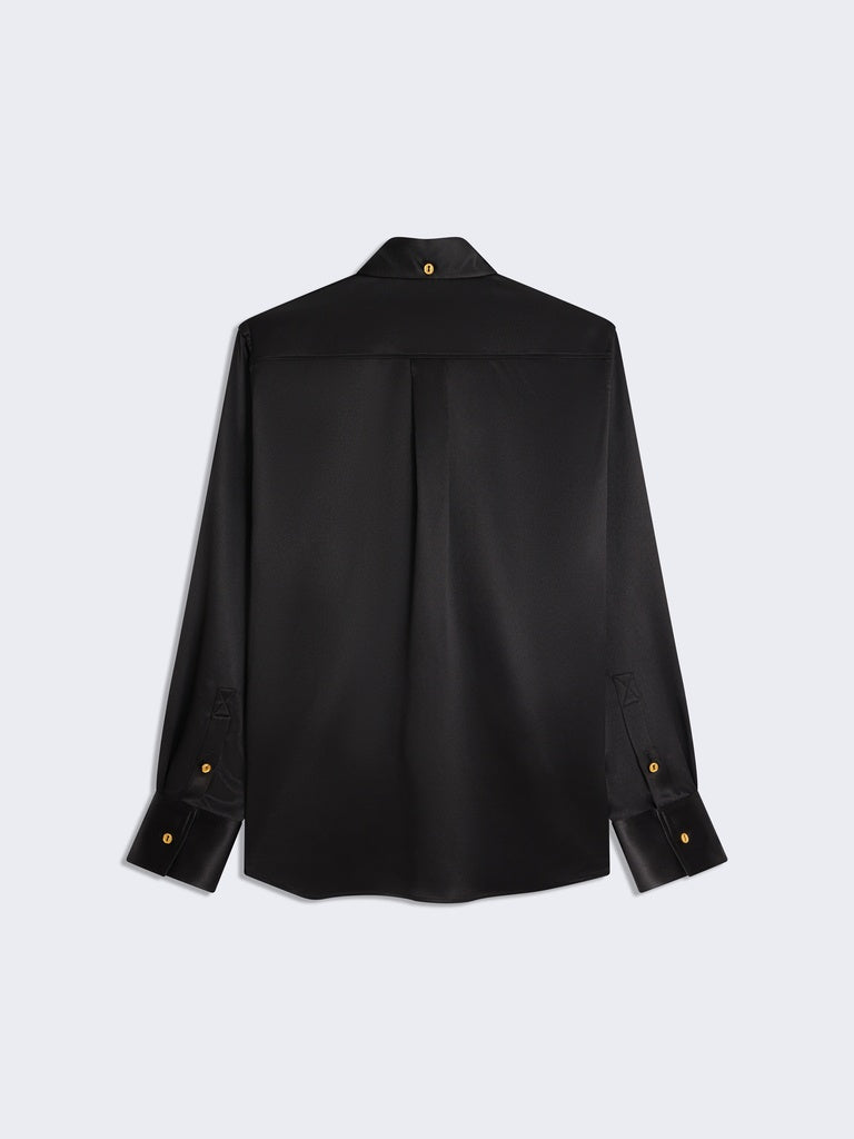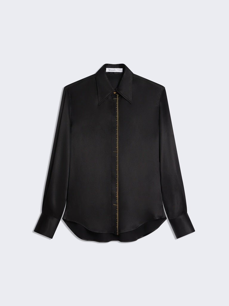 This shirt is made of flowing black satin. It is adorned with a signature gold measuring tape embroidery on the center front which conceals invisible buttons, and gold hammered brass jewel buttons at the bottom of the sleeves.