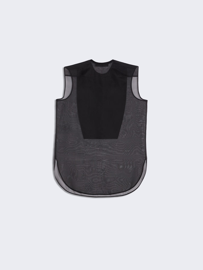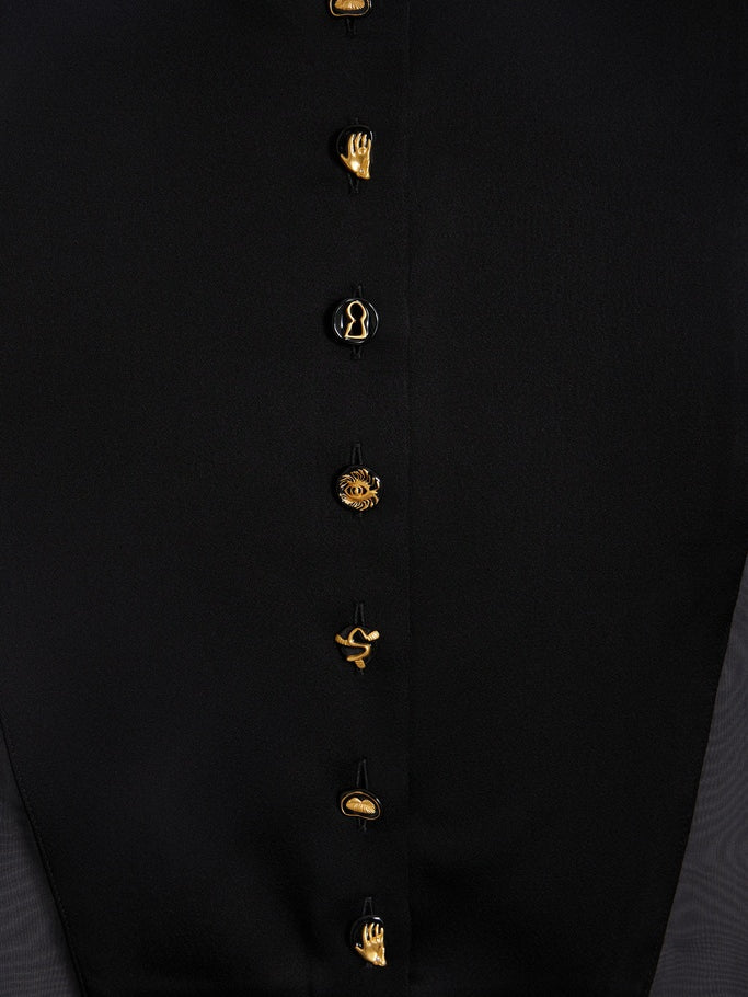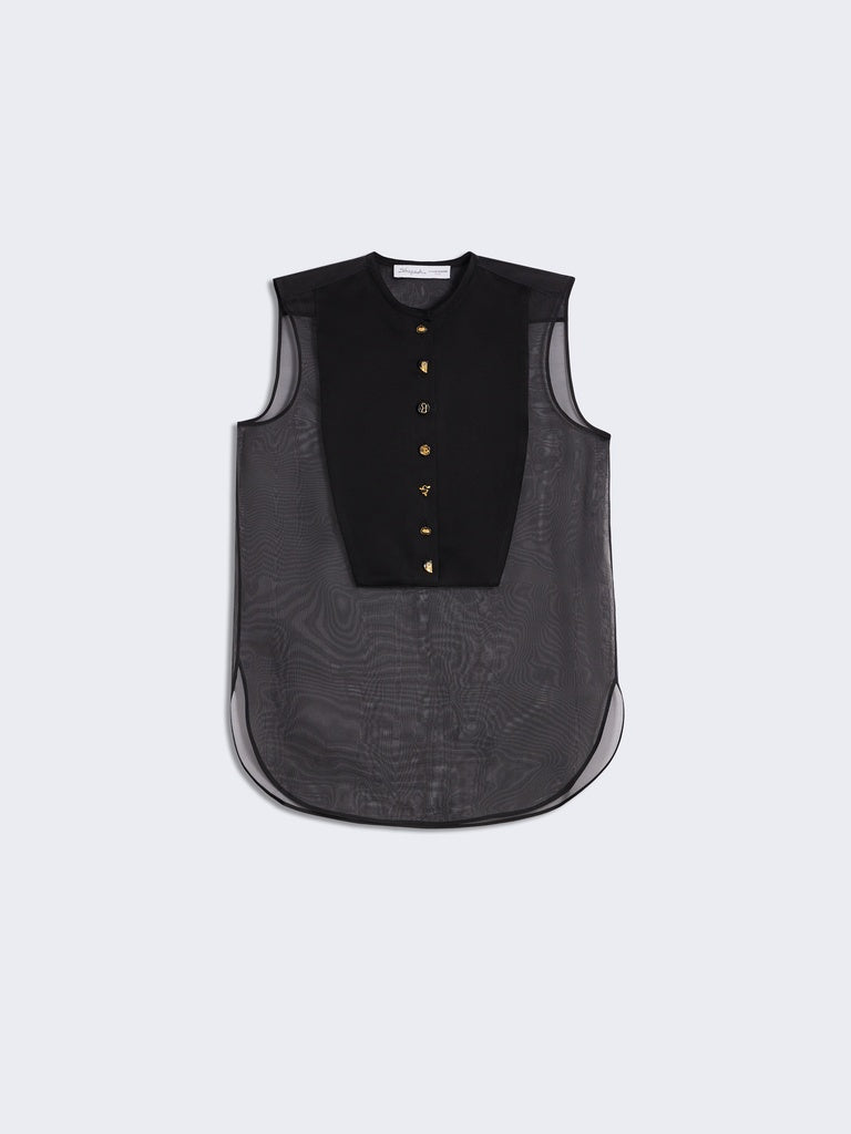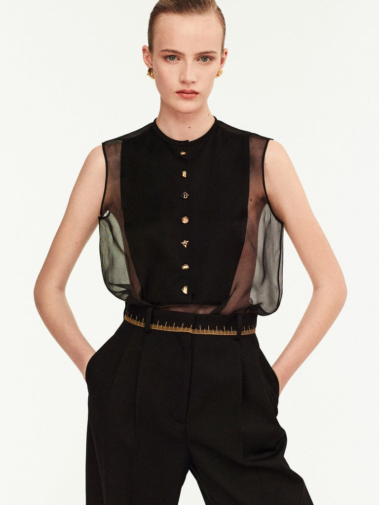 This sleeveless mandarin-collar shirt is made of fluid black organza. It features a tone-on-tone satin bib adorned with hammered gold-tone brass jewel buttons in the center.