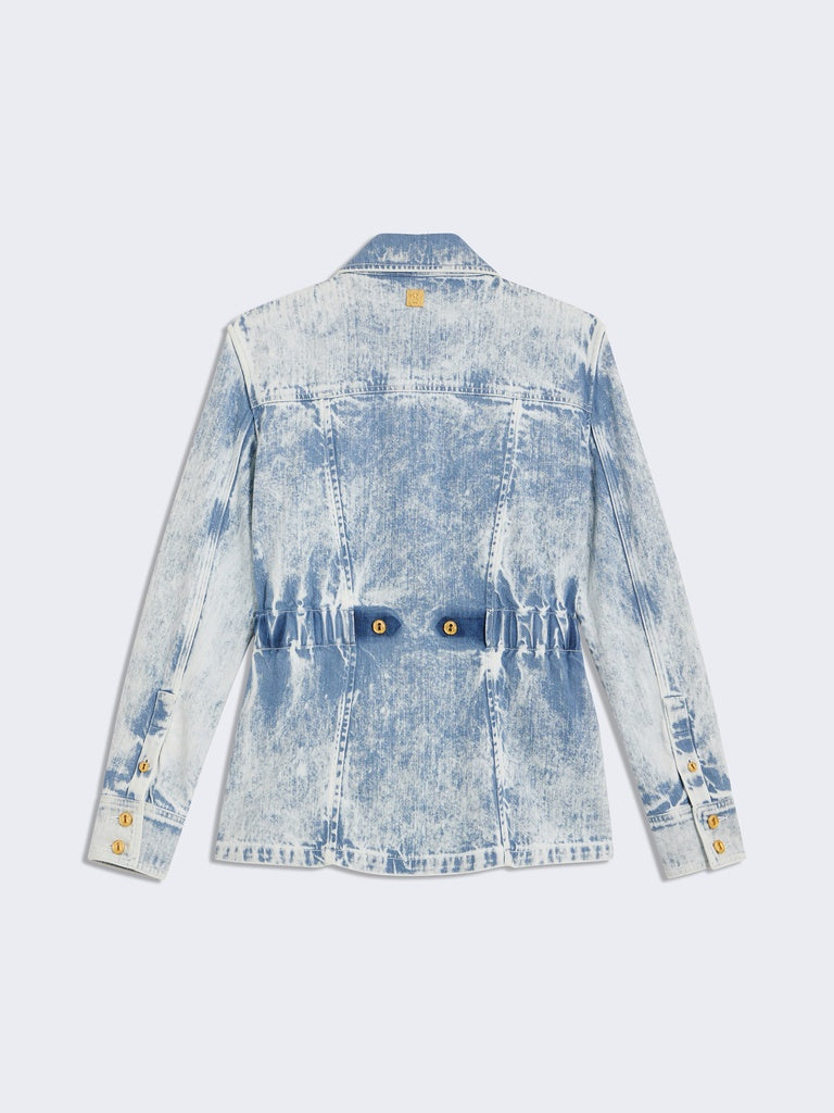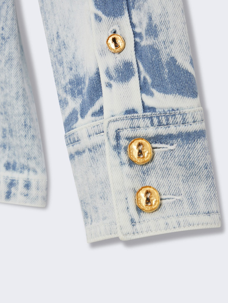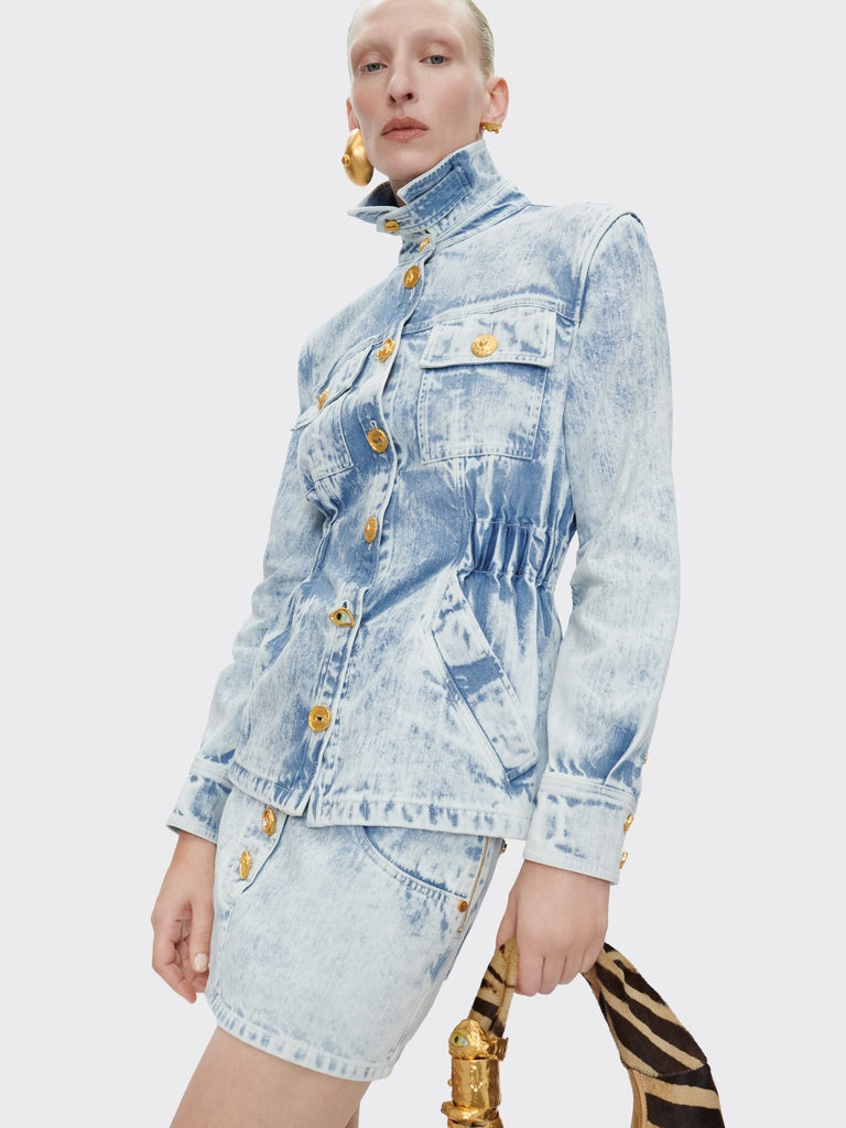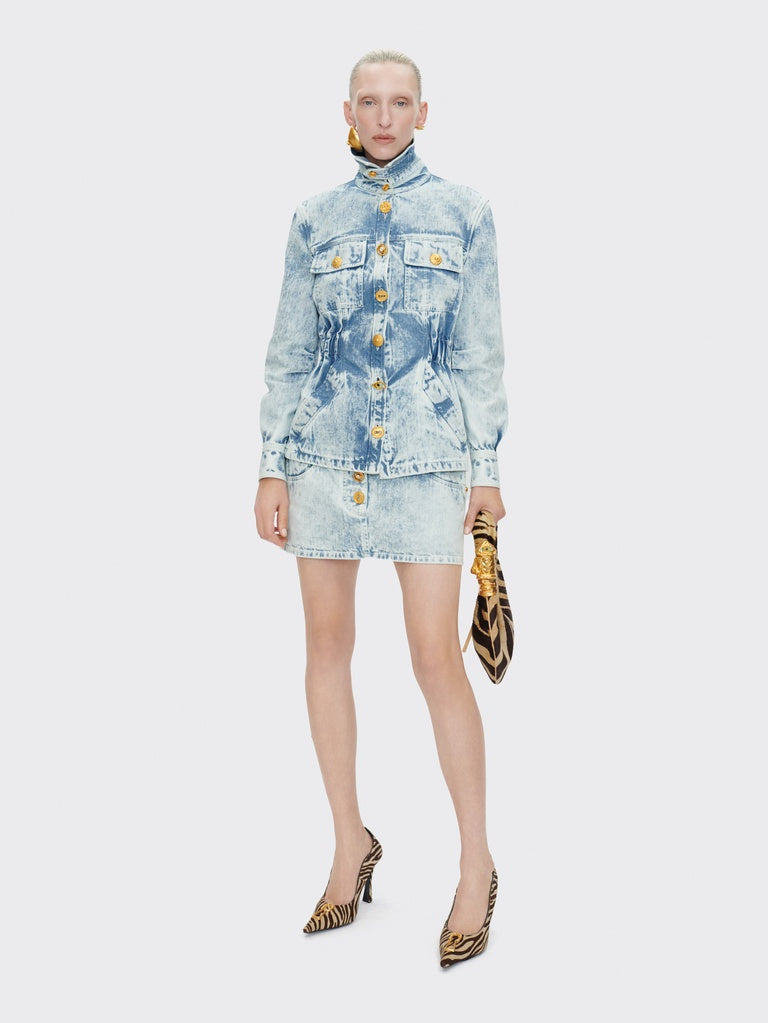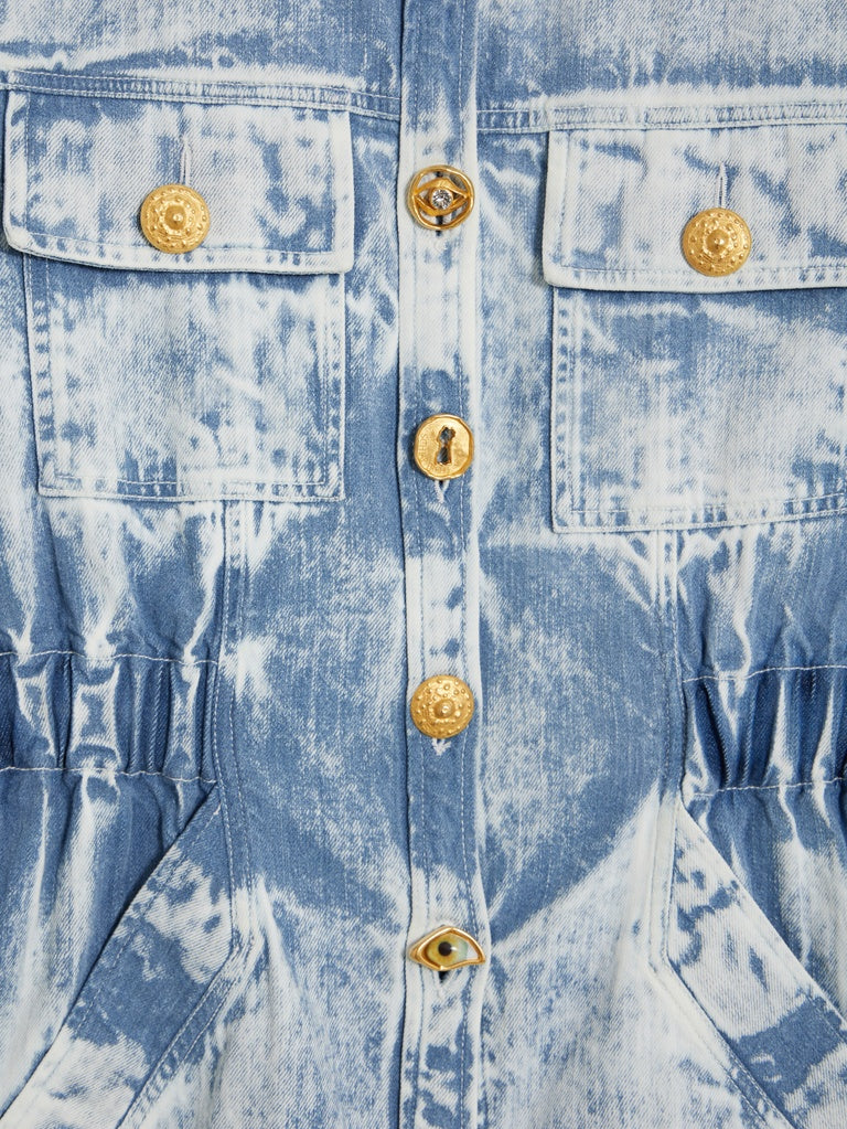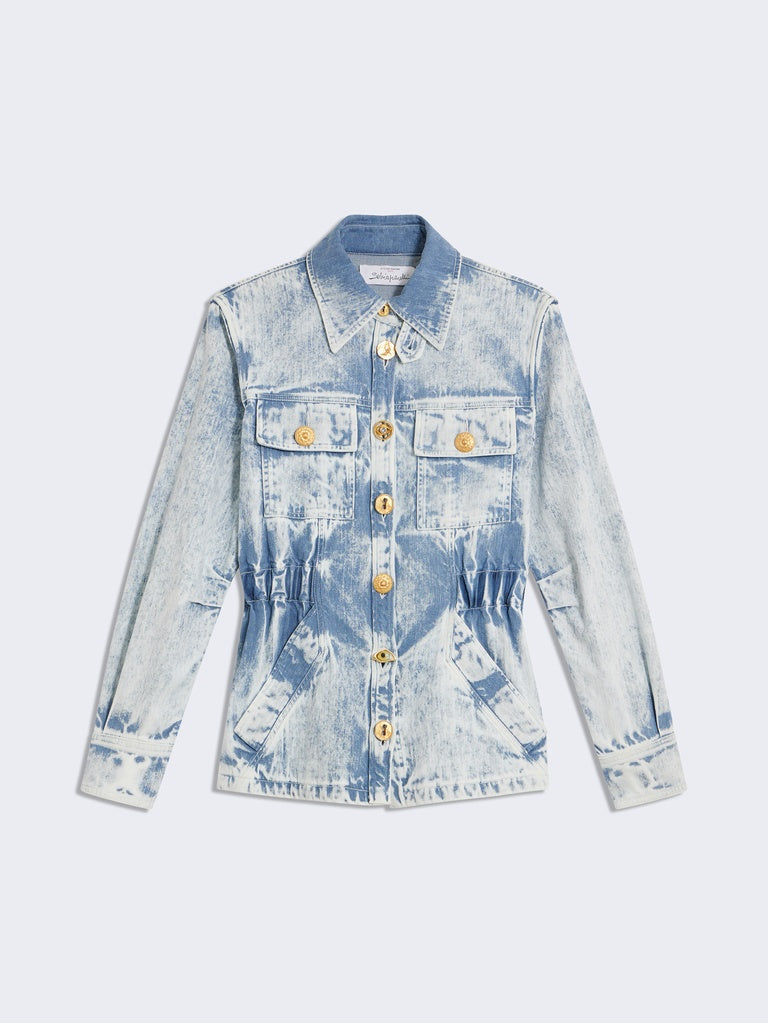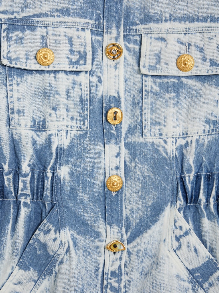 This long-sleeved, fitted safari shirt is made from washed blue denim with denim details. Smocked at the waist, it features two chest pockets, hammered gold-tone brass jewel buttons, and a button placket at the back.