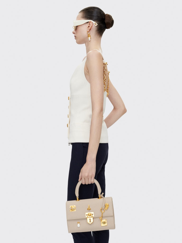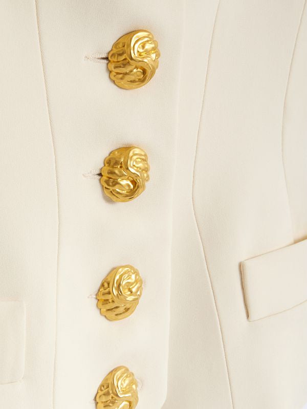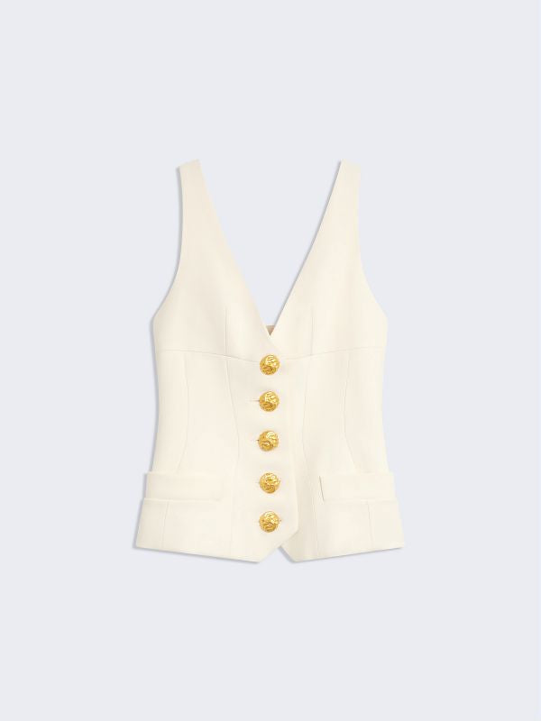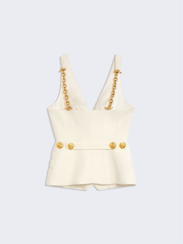 This fitted vest is crafted from opulent ivory cady. Its cut hugs the body's lines, with a peplum defining the waist. Embellished with gold chain straps featuring bone-effect bar clasps, it is adorned with large, hammered gold S-shaped jewel buttons at the front. Two large welt pockets and a jeweled button tab at the back complete its tailored silhouette.