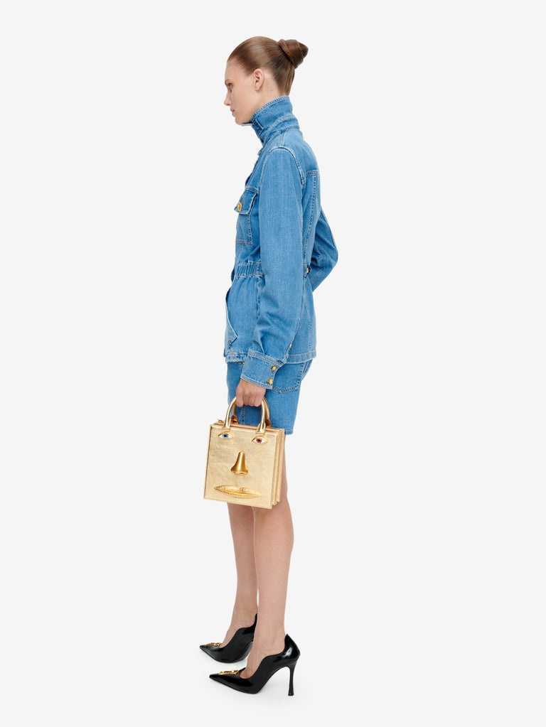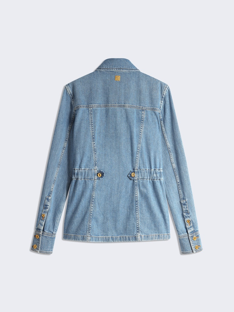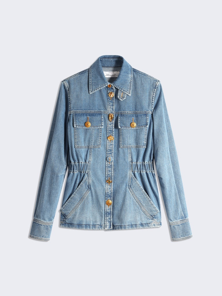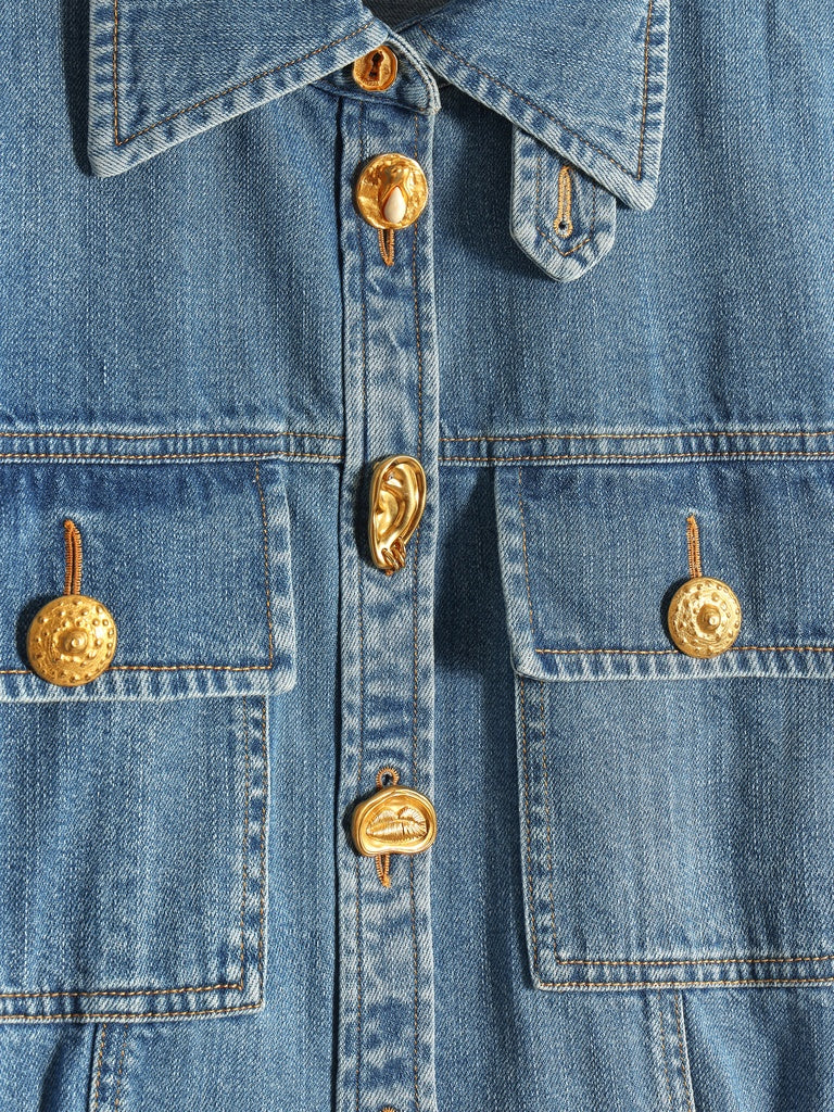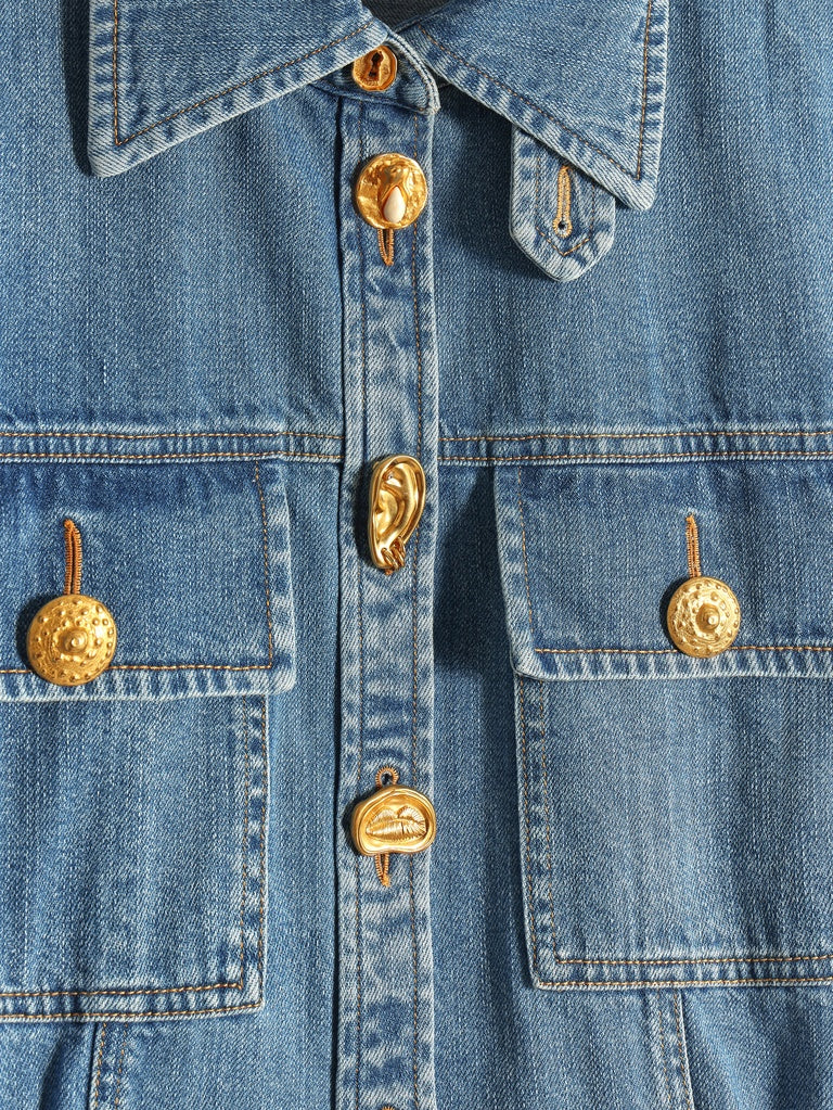 Safari shirt in blue washed denim embellished with gold bijoux buttons.