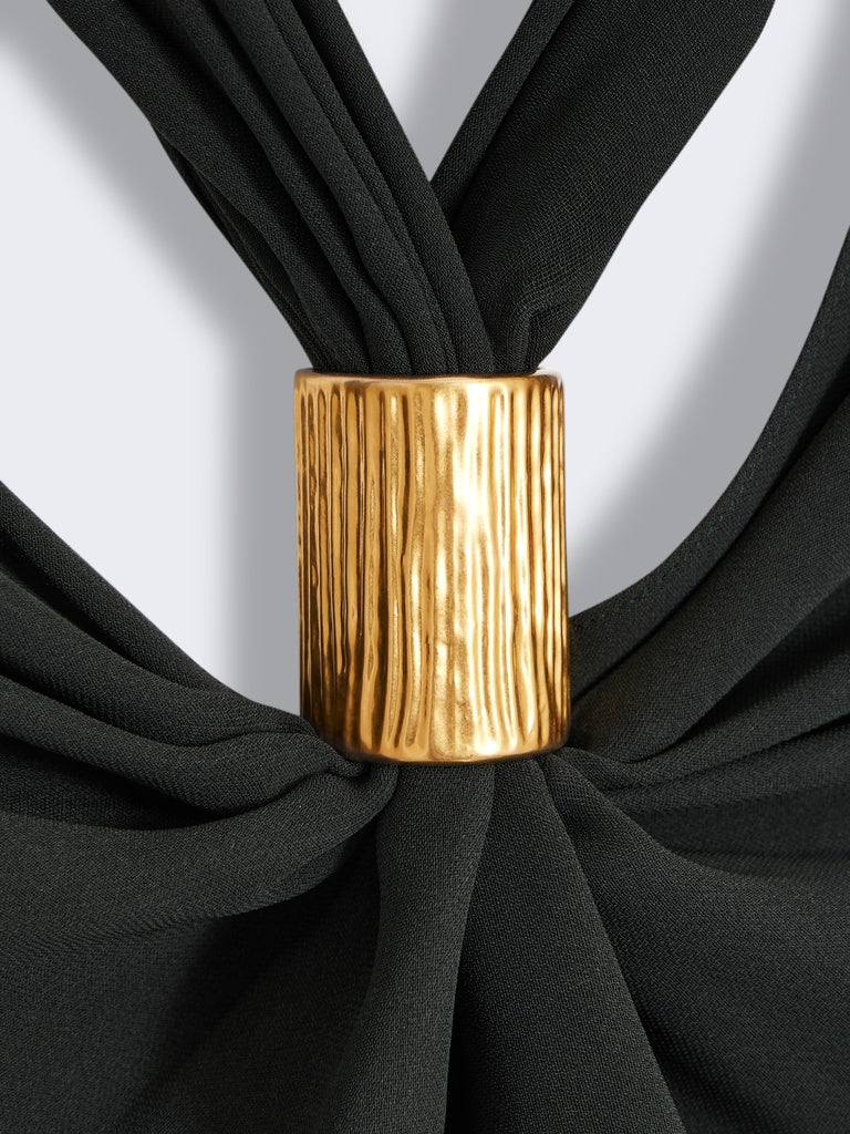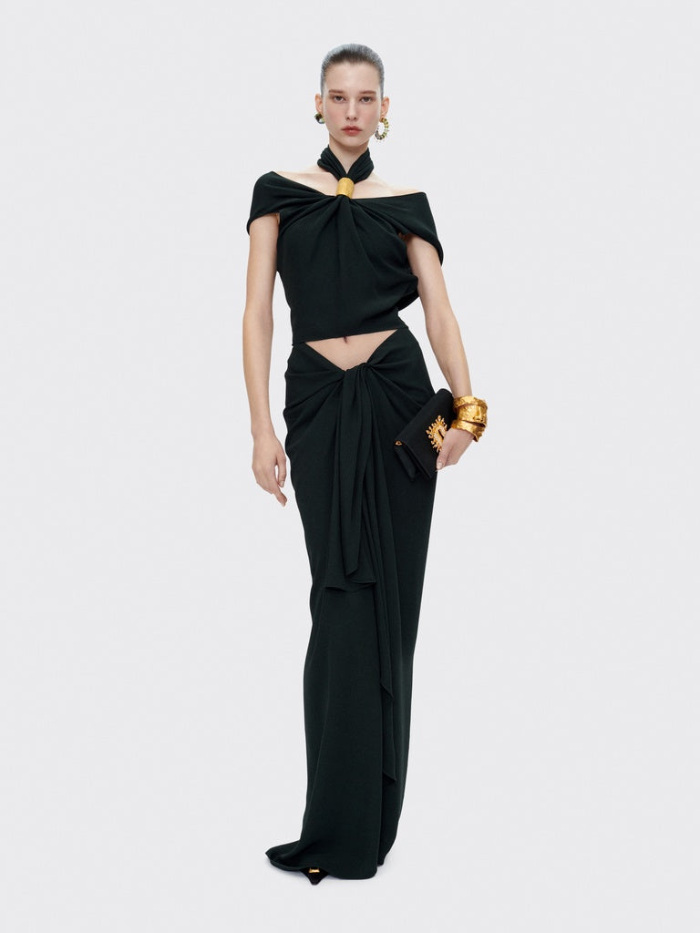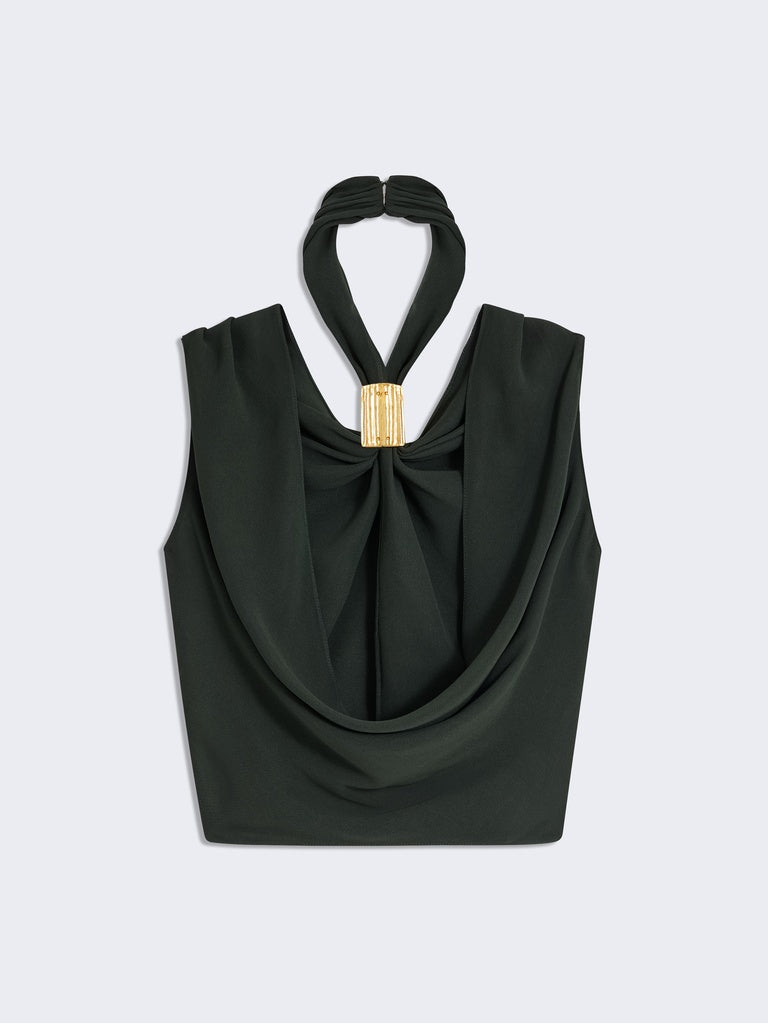 This draped top in dark green crepe, gathered at the front, is held at the neck by a gold-tone brass jewel. It is enhanced by a side slit and a cowl neck at the back.