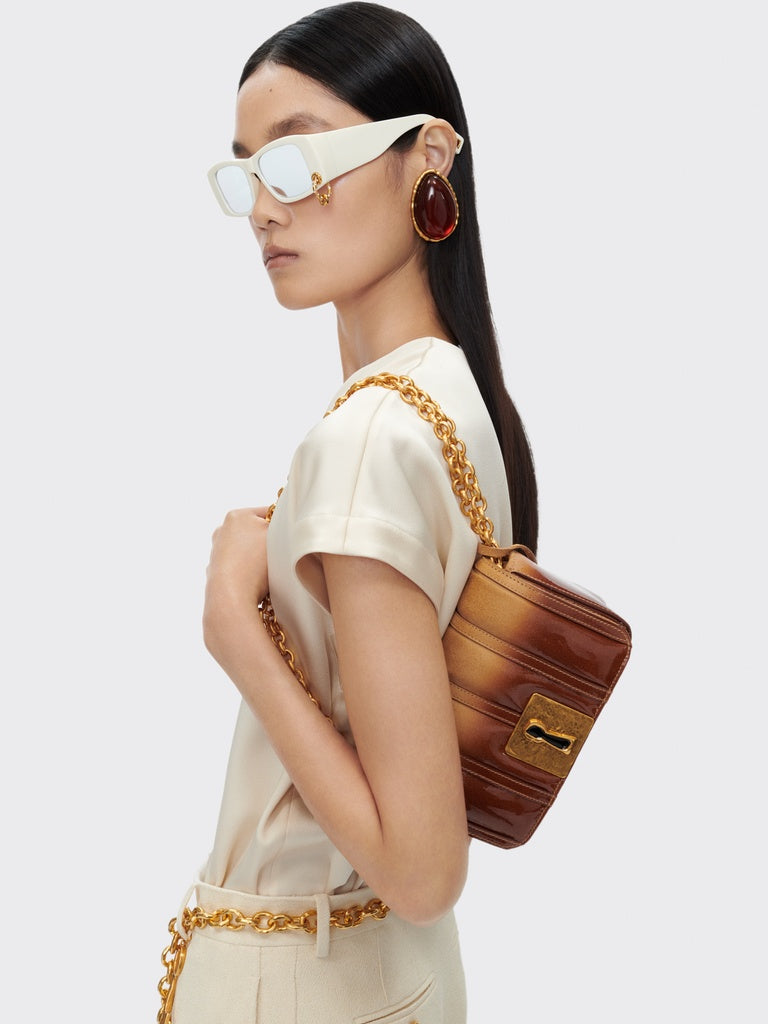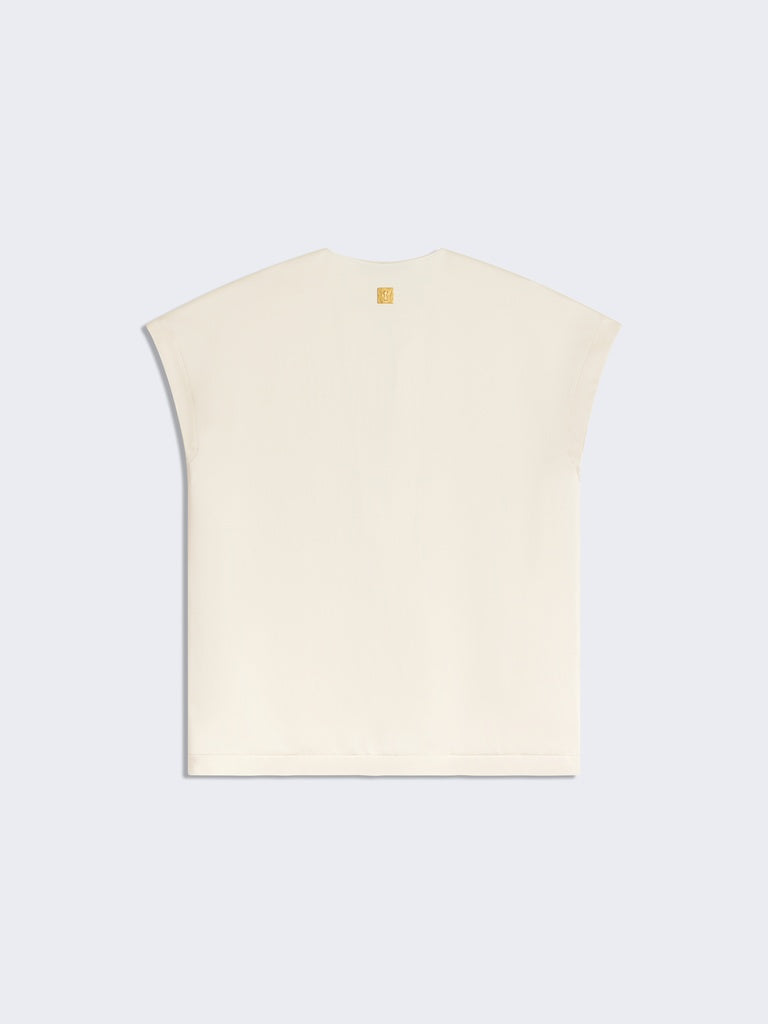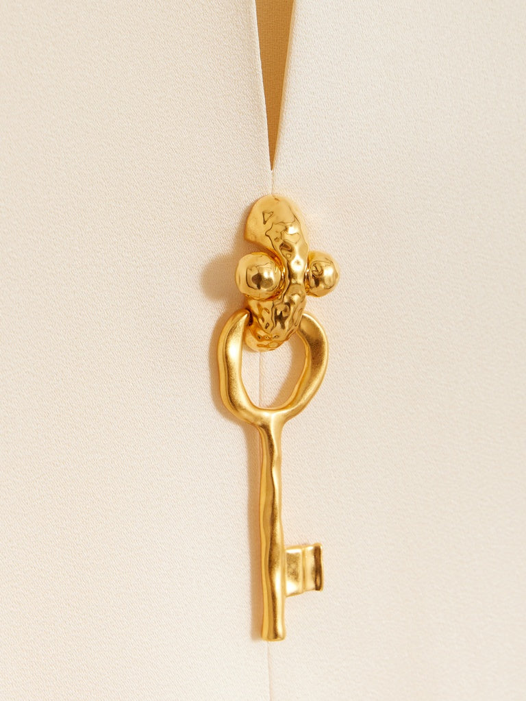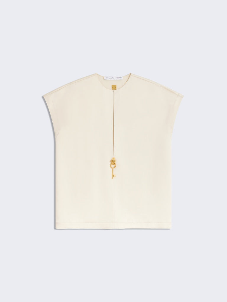 This short-sleeved, round-neck, square-cut top is made of heavy ecru satin. Its split neckline is adorned with a decorative gold-tone metal key.