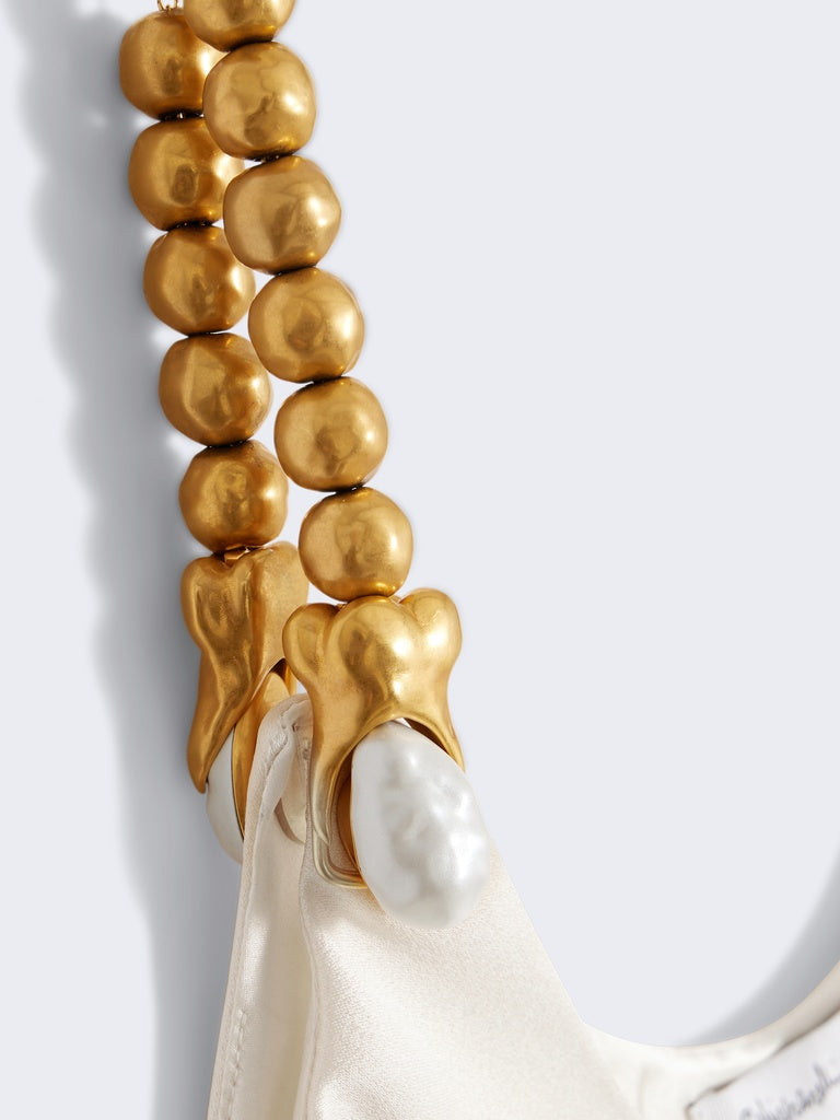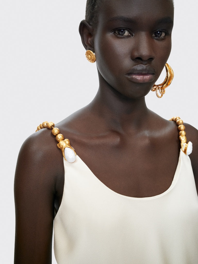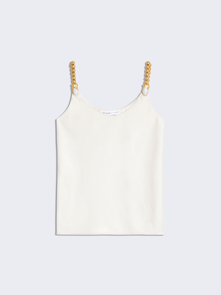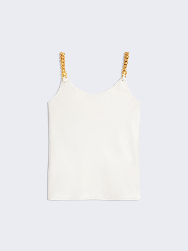 This tank top in ecru ribbed silk crepe is enhanced with hammered gold brass jewel straps.