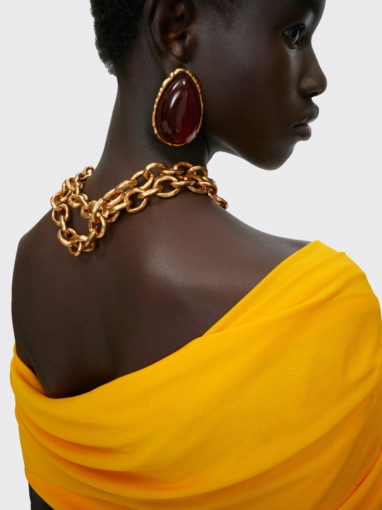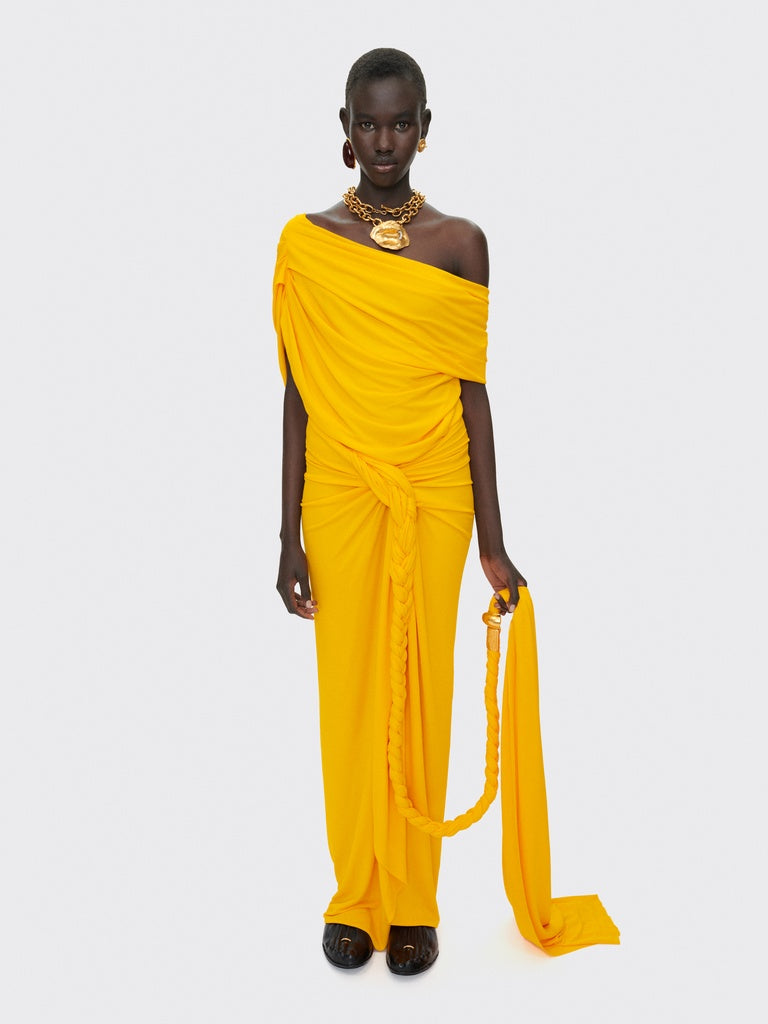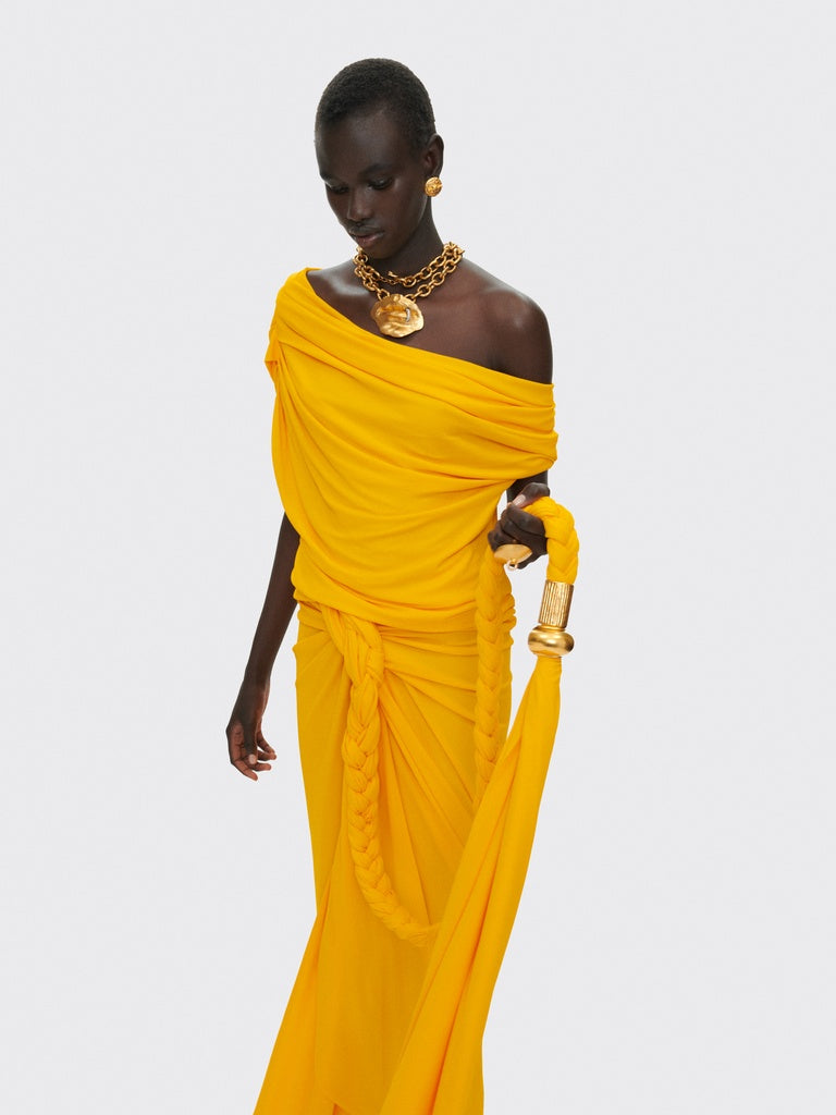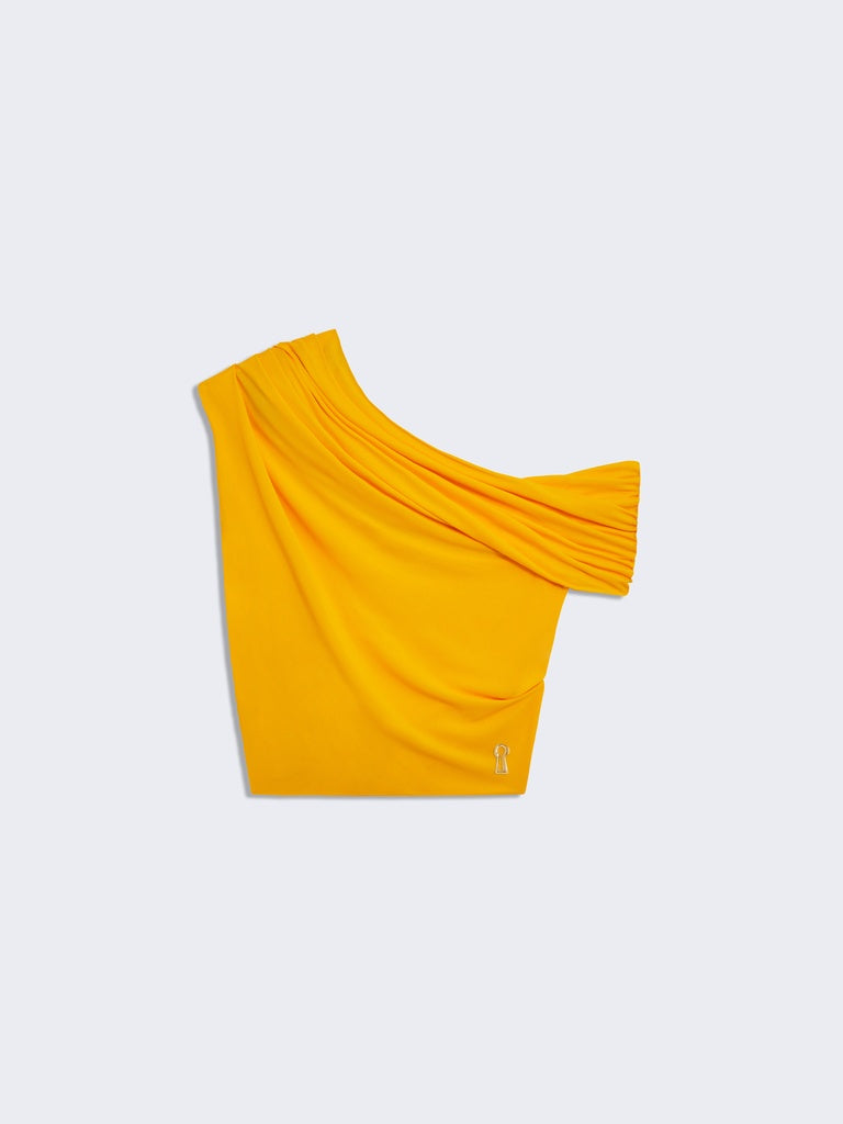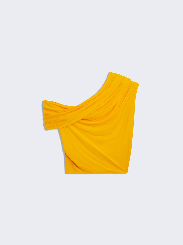 This fitted top in yellow compact jersey with an asymmetrical cut is draped at the right shoulder.