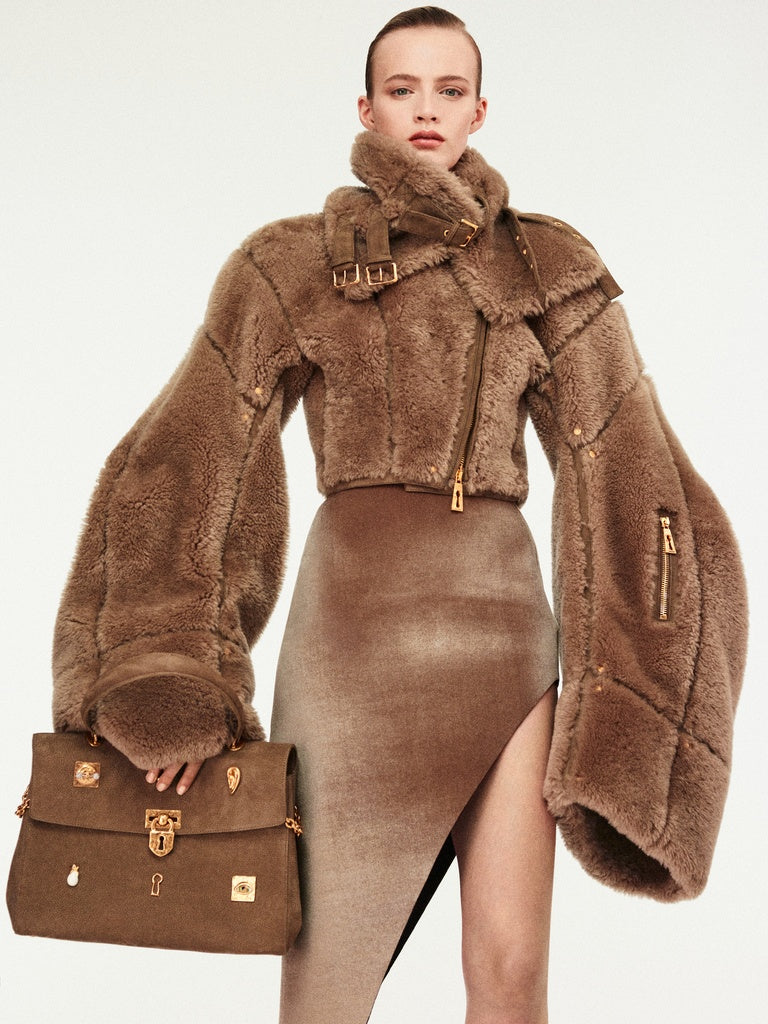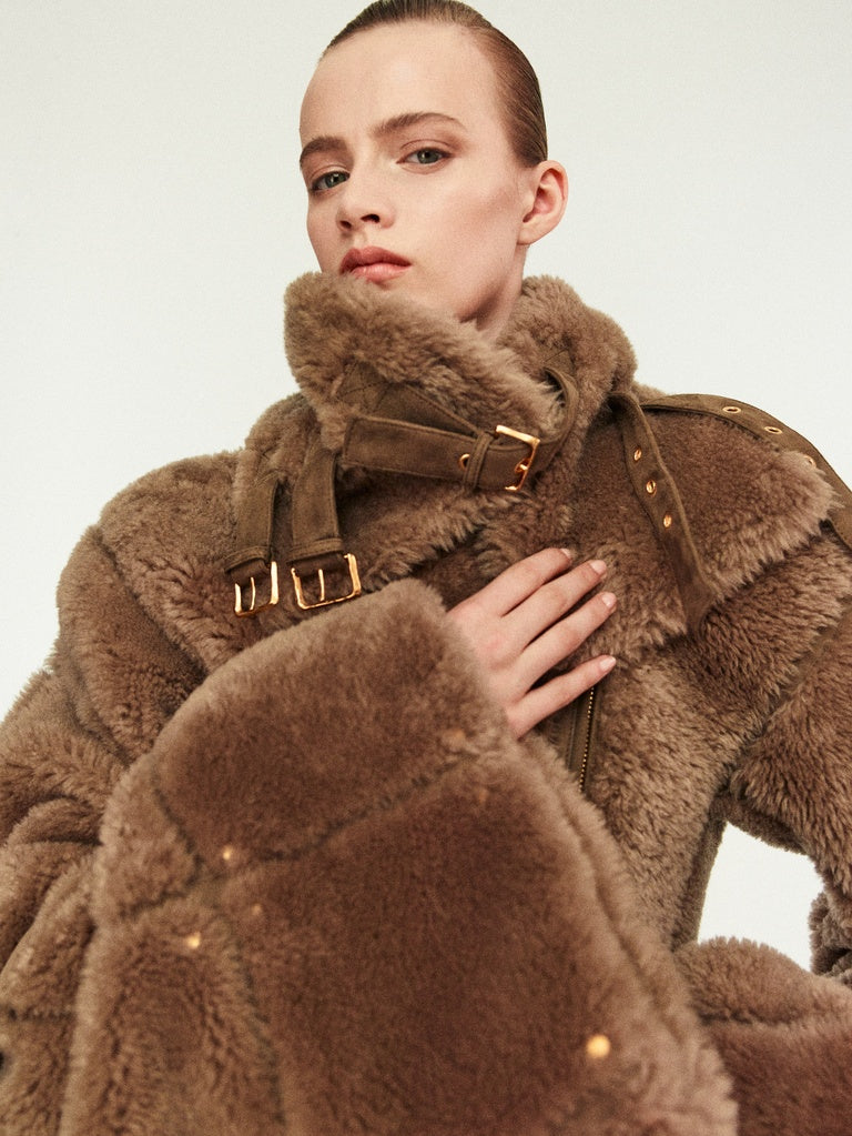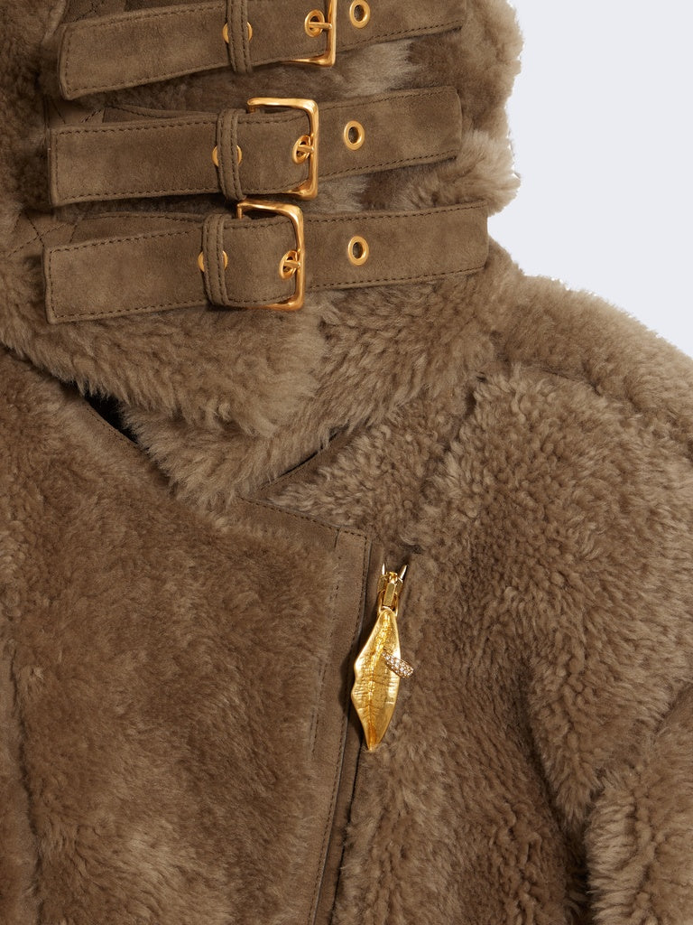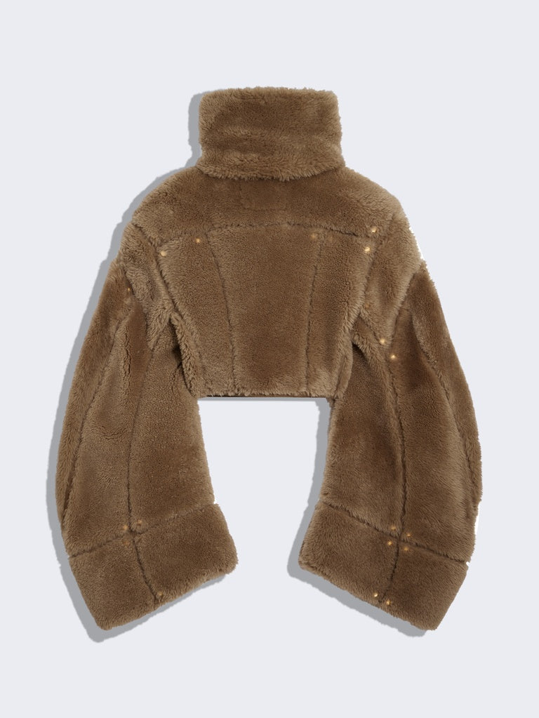 This short-cut, taupe lambskin shearling zip-up bomber jacket features an oversized stand-up collar fastened with belt loops and exaggeratedly long, wide sleeves. It's finished with a diagonal zip fastening, a zipped pocket on the left sleeve, and gold denim rivets at each seam.