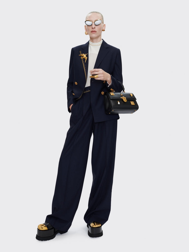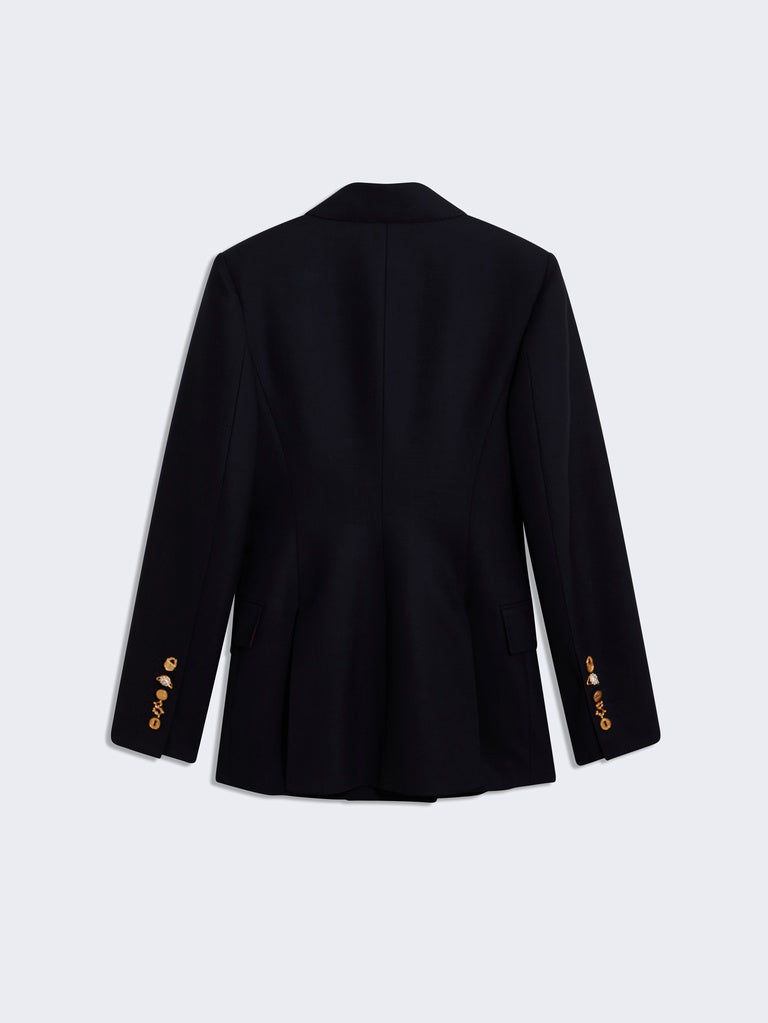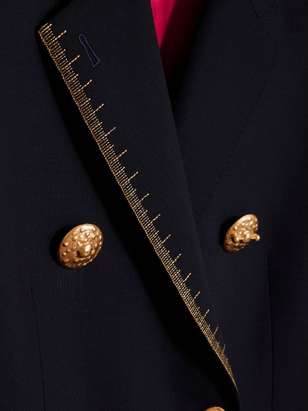A fitted, double-breasted blazer in navy blue wool, embroidered with a gold thread "Measure Ribbon" motif. A tone-on-tone "Keyhole" motif adorns the lapel. Trompe-l'oeil jewel buttons embellish the chest. Lined in shocking pink.