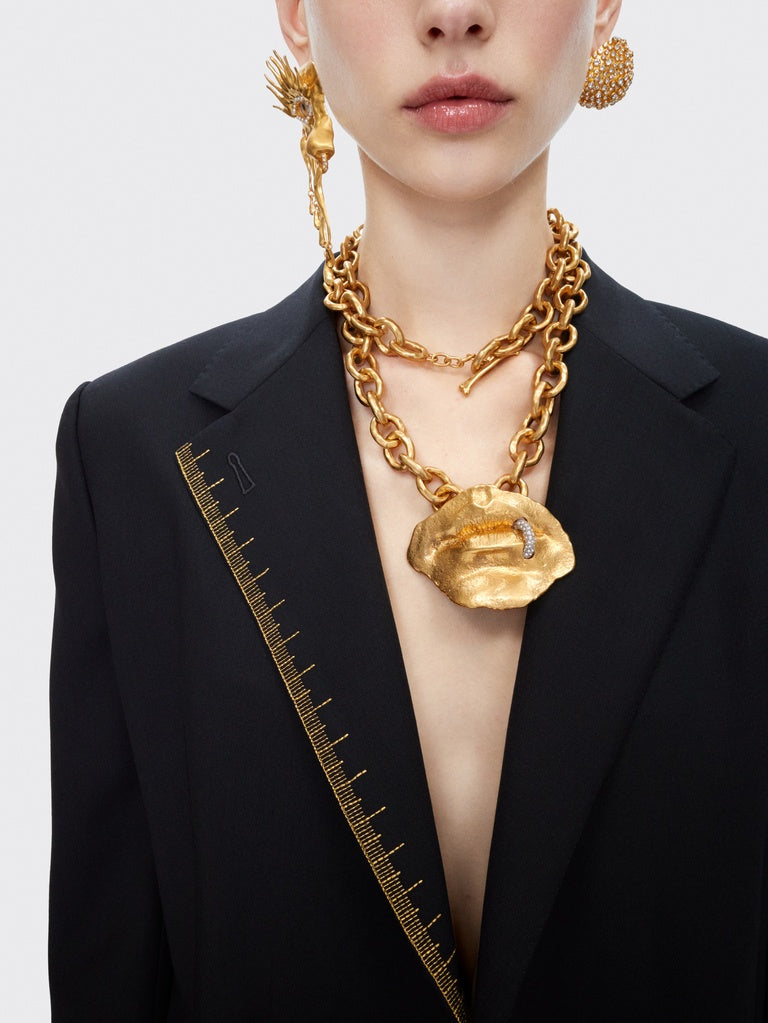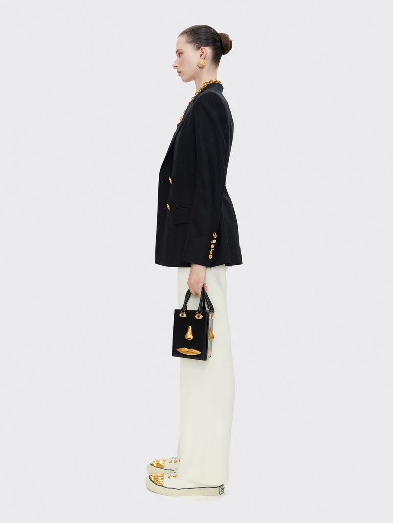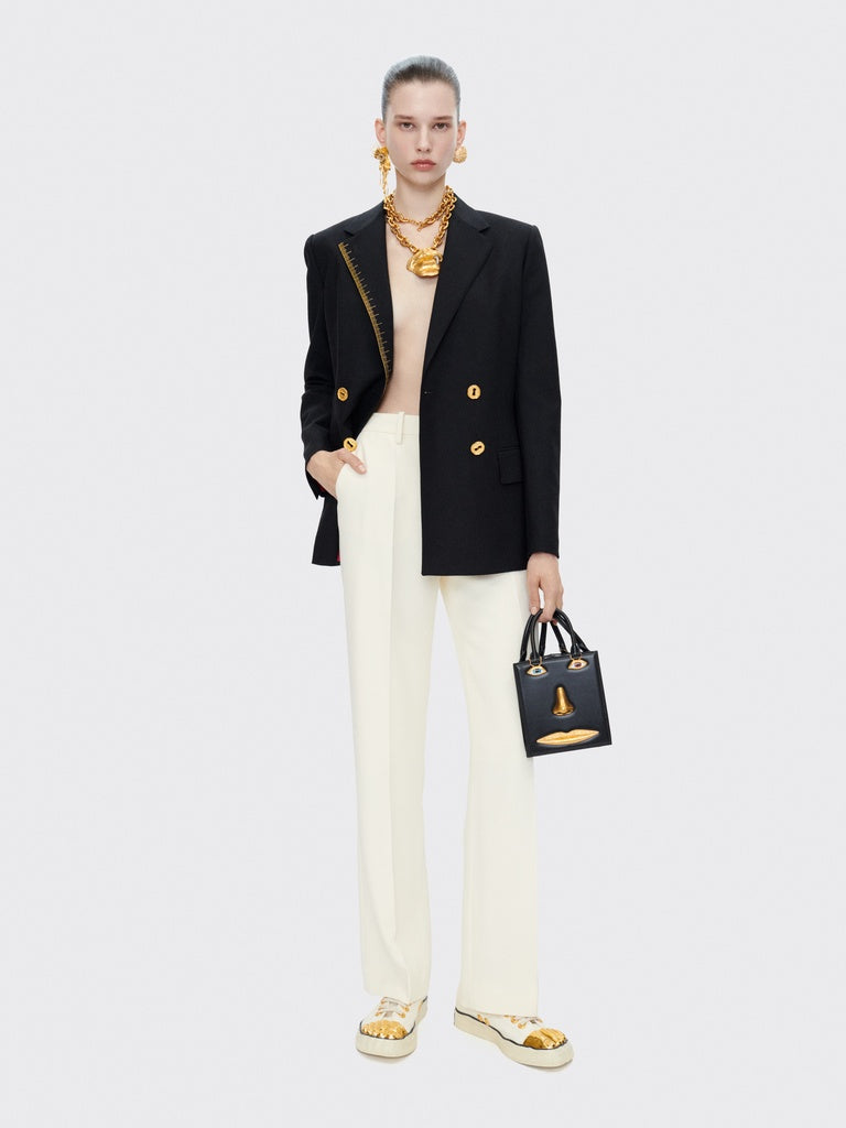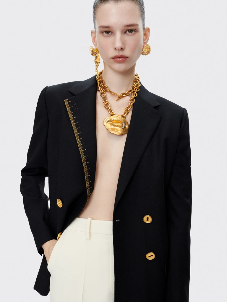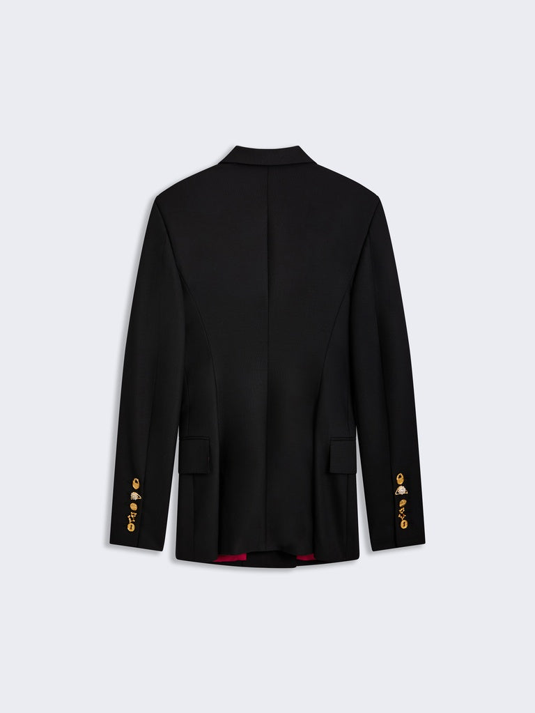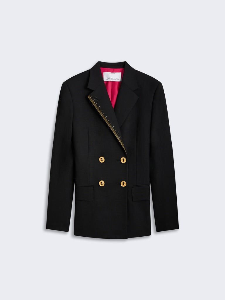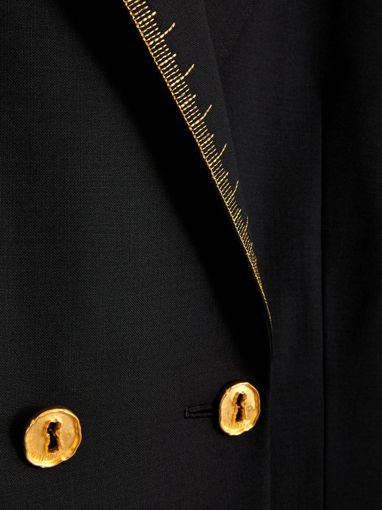 A fitted, double-breasted blazer in black wool, embroidered with the "Metre Ruban" motif in gold thread. A tone-on-tone "Trou de clés" (Keyhole) motif adorns the lapel. Trompe l'oeil jeweled buttons embellish the chest. Lined in shocking pink.